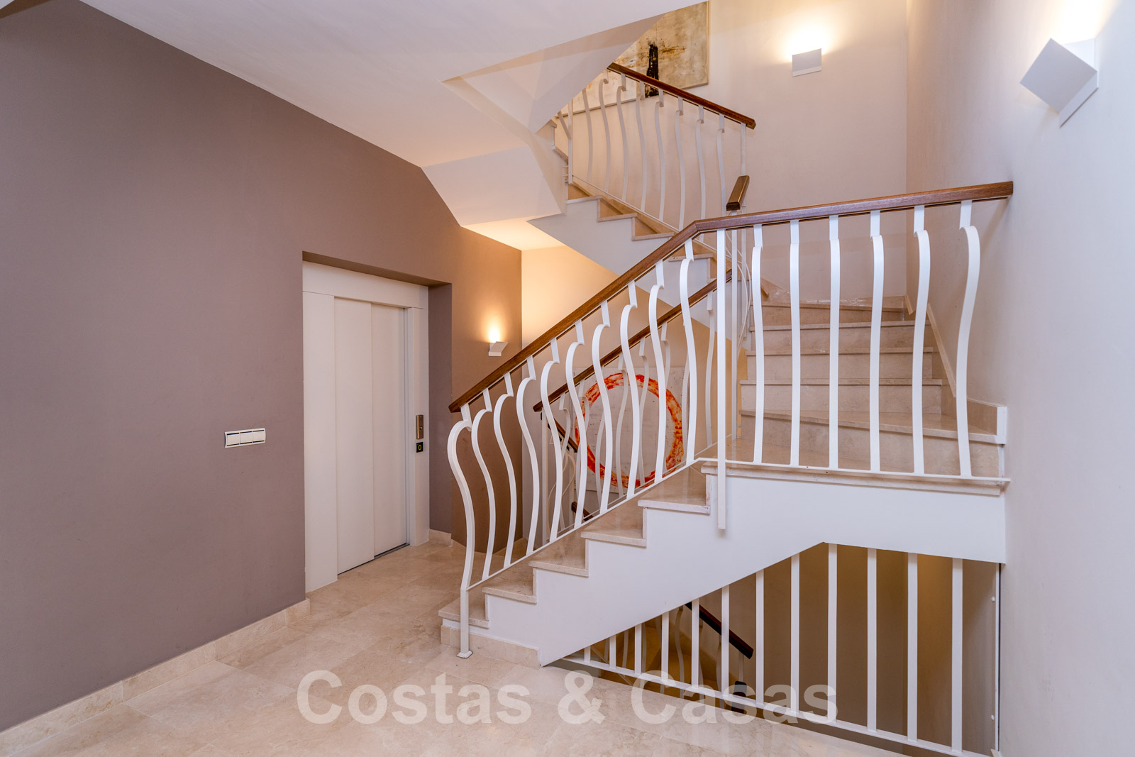 Ascenseur pour tous les étages. Climatisation pour le refroidissement et le chauffage. Chauffage au sol dans les salles de bains. Cheminée. Sol en marbre crème. Armoires encastrées.