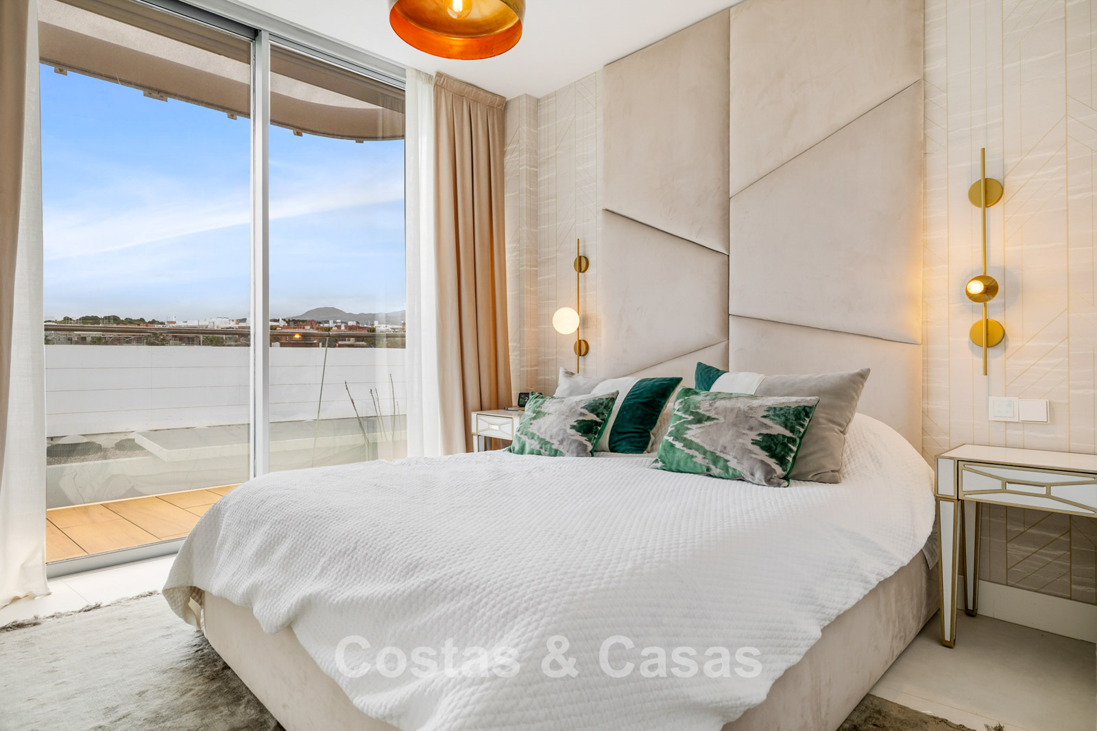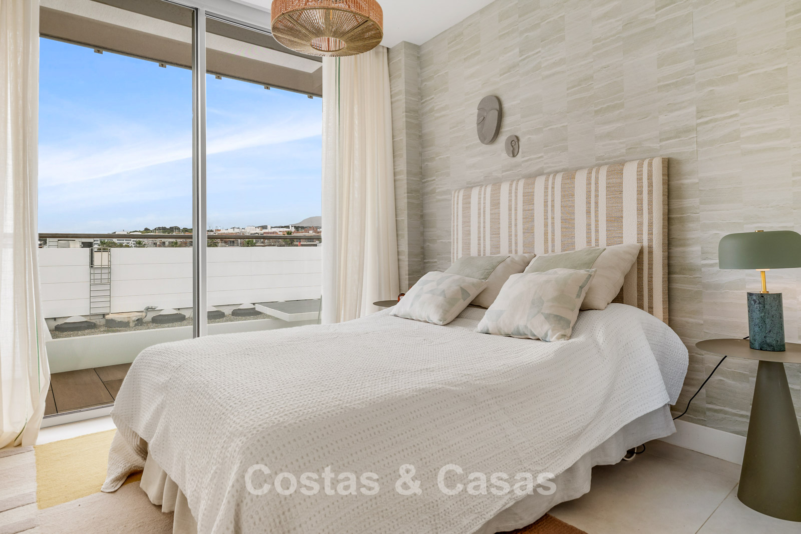 Appartement mitoyen de première classe au 2ème étage. Utilisation de matériaux de qualité et d'une finition de haute qualité. Situé au sud. Vue sur les jardins communs, avec la mer Méditerranée en arrière-plan. Une terrasse couverte est équipée d'un salon et d'un coin repas extérieur. Terrasse supplémentaire à l'arrière exposée sud-ouest pour le soleil du soir. Espace de vie ouvert. Cuisine ouverte avec îlot et électroménagers de qualité. Coin repas intégré. 3 chambres, 2 salles de bains et une toilette. Sols en carrelage couleur crème grand format. Débarras. Parking souterrain.