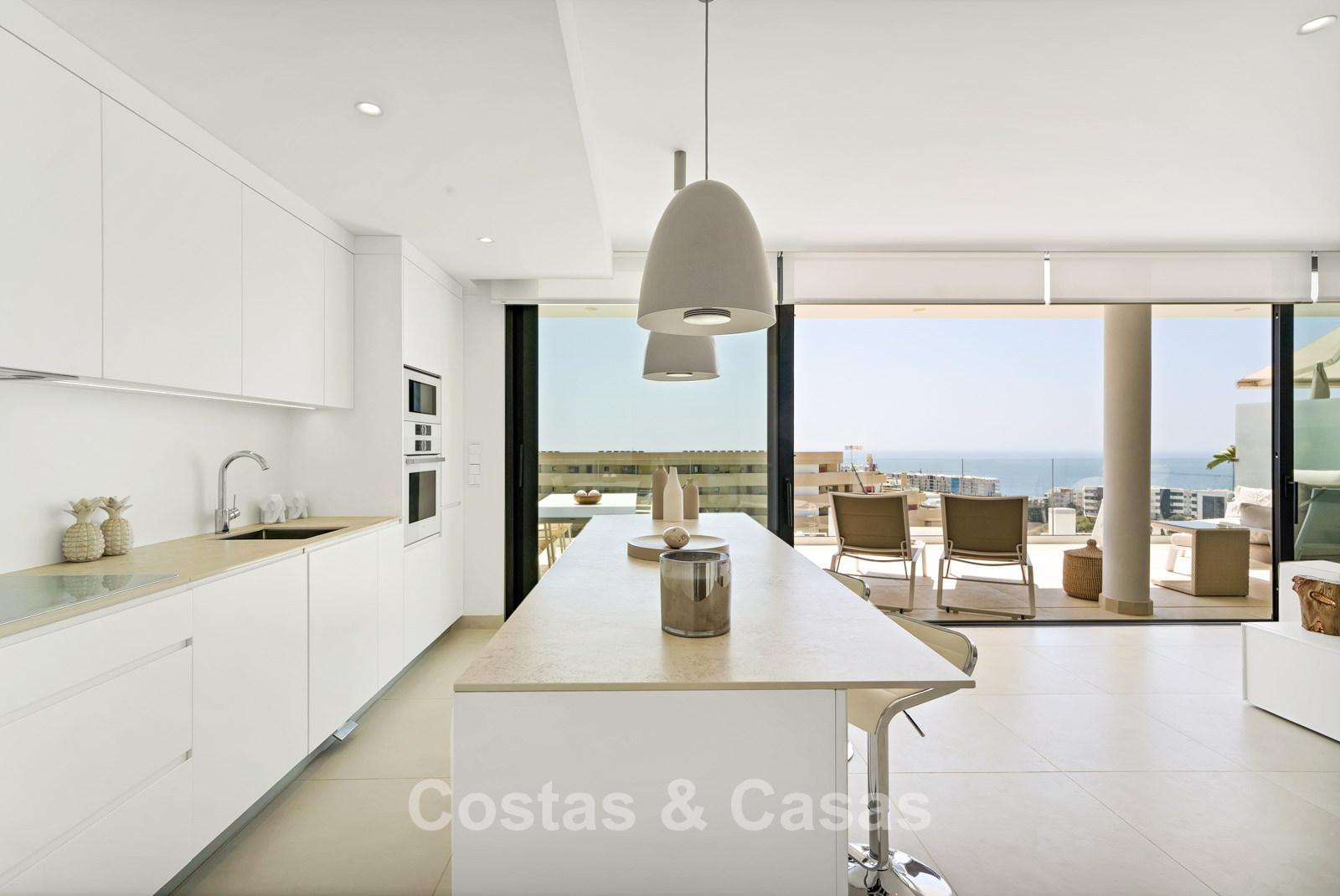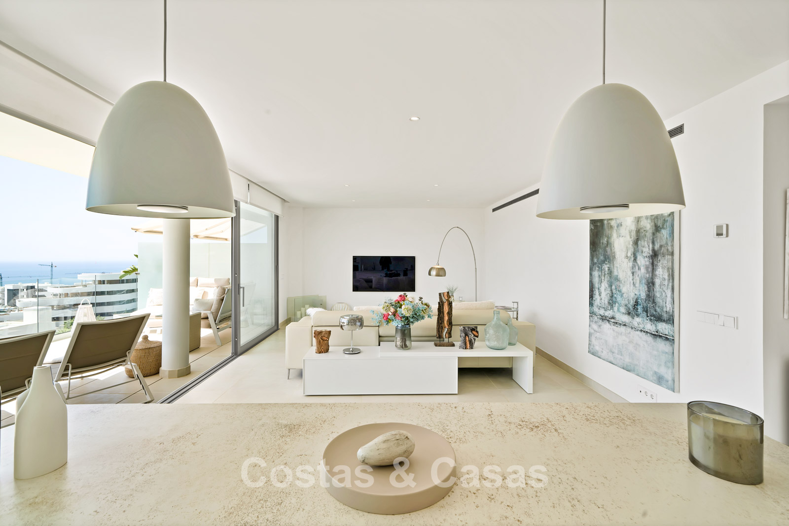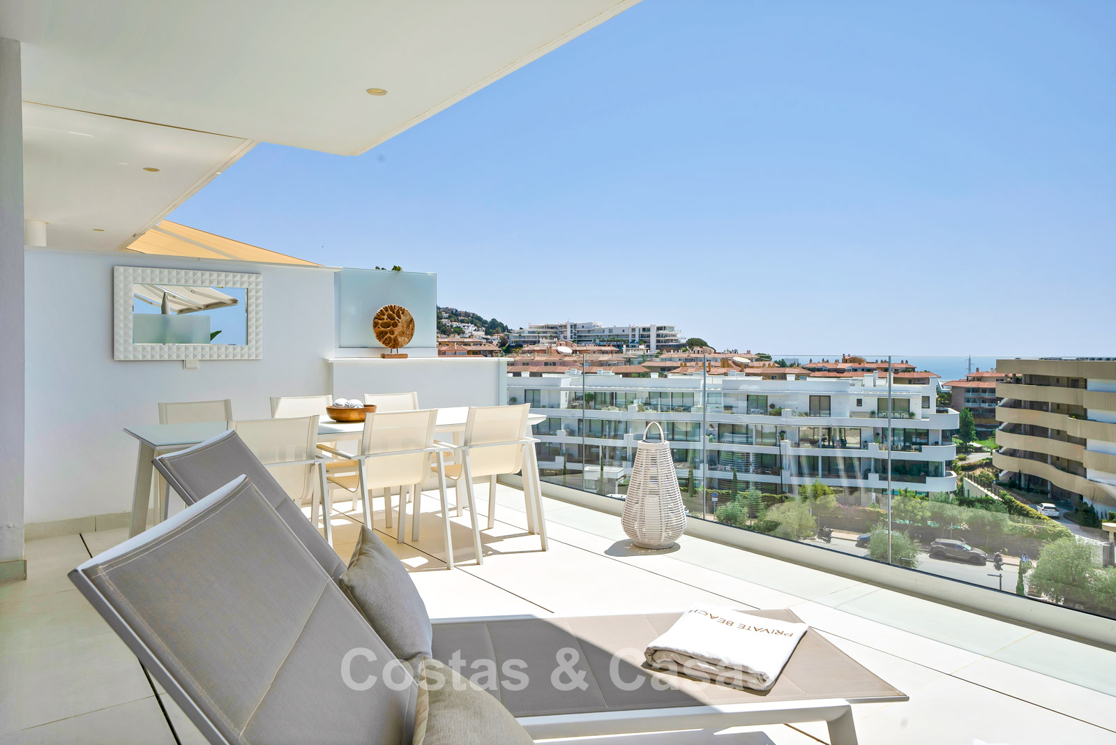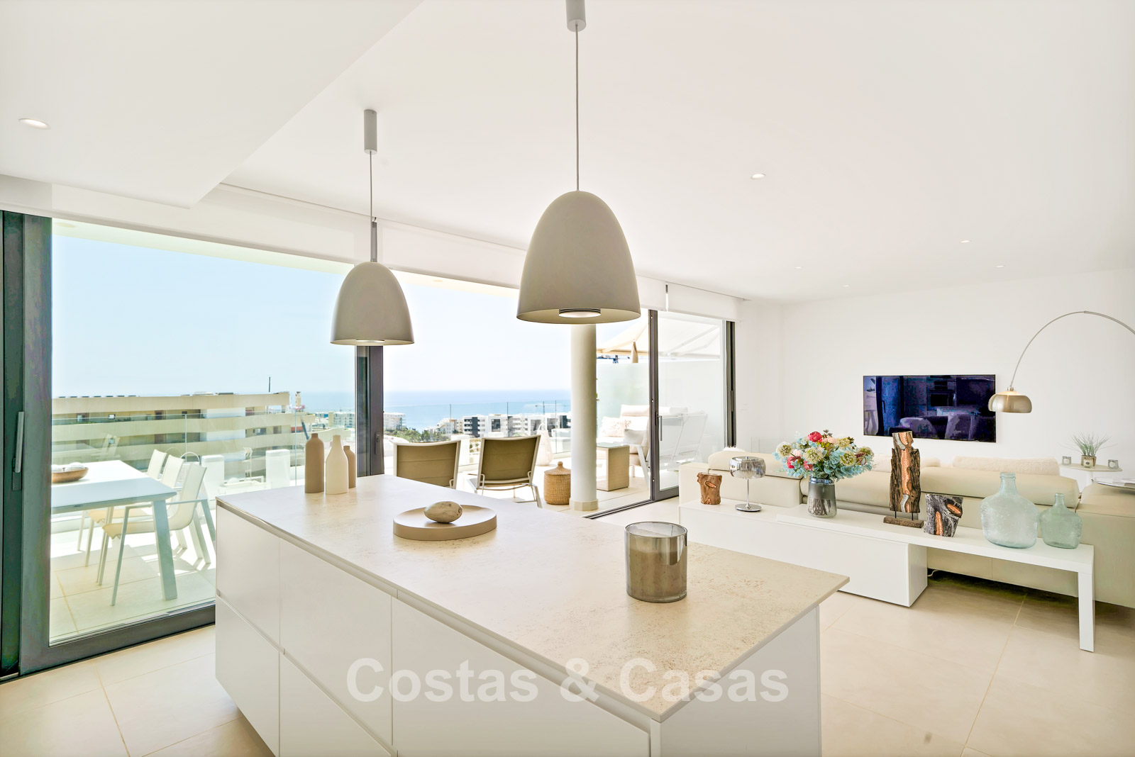 Spacieux appartement avec terrasse en excellent état. Conçu avec soin pour allier style et confort, il est équipé d'appareils électroménagers haut de gamme. Orientation sud-sud-ouest pour une luminosité optimale. Vue panoramique sur la mer et les montagnes, avec lever et coucher de soleil depuis les deux terrasses, une exclusivité de ce complexe. Intérieur moderne et ensoleillé. Espace de vie ouvert avec coin cuisine. Le plus grand séjour et la plus grande cuisine du complexe ! Cuisine ouverte entièrement équipée avec appareils électroménagers haut de gamme et îlot central. Des baies vitrées coulissantes, avec profilés encastrés, s'ouvrent sur la terrasse, laissant entrer une abondante lumière naturelle. 2 chambres spacieuses, 2 salles de bains, dont une attenante avec chauffage au sol. Sols en porcelaine de qualité. Débarras et 2 places de garage en sous-sol.