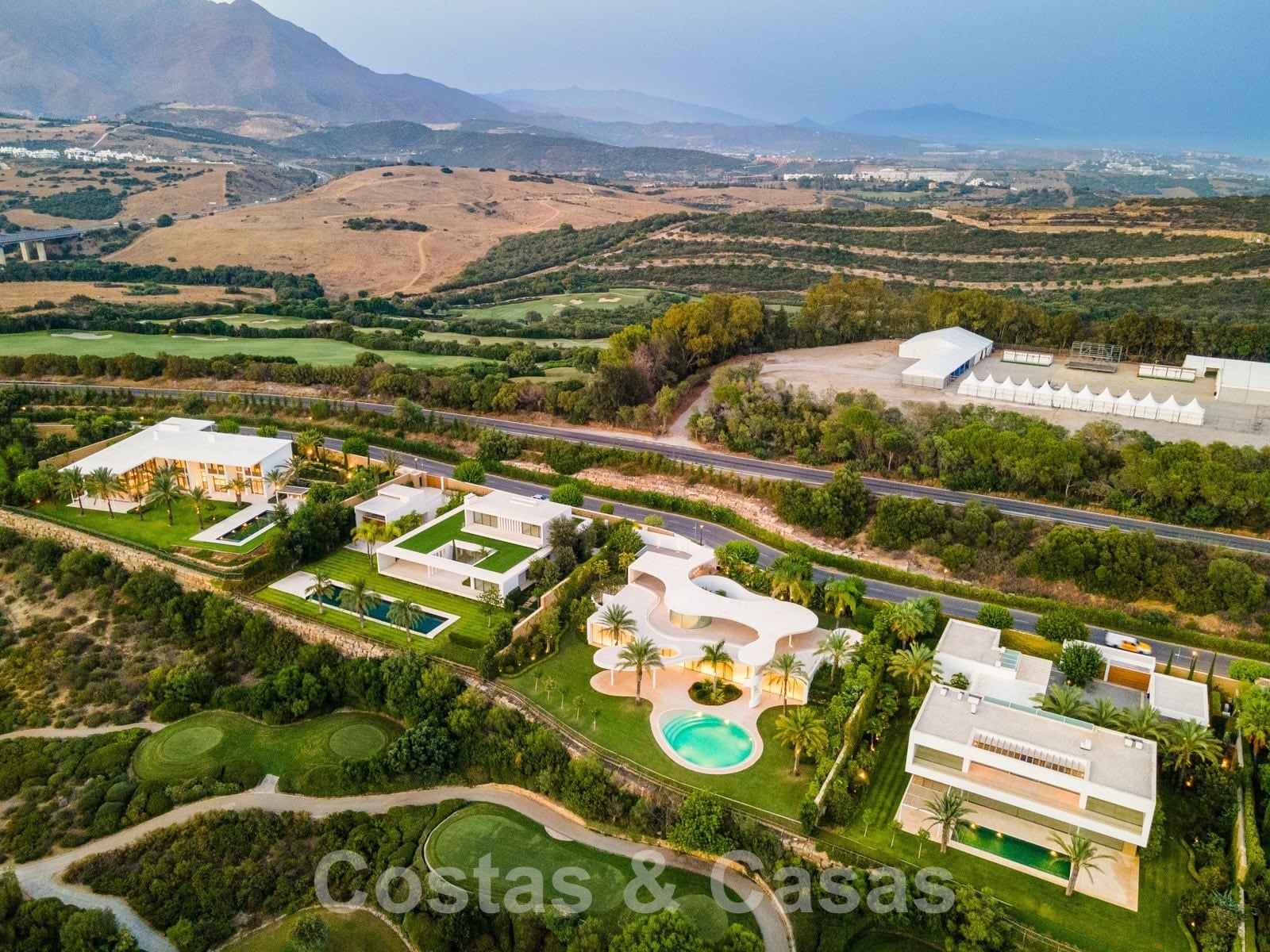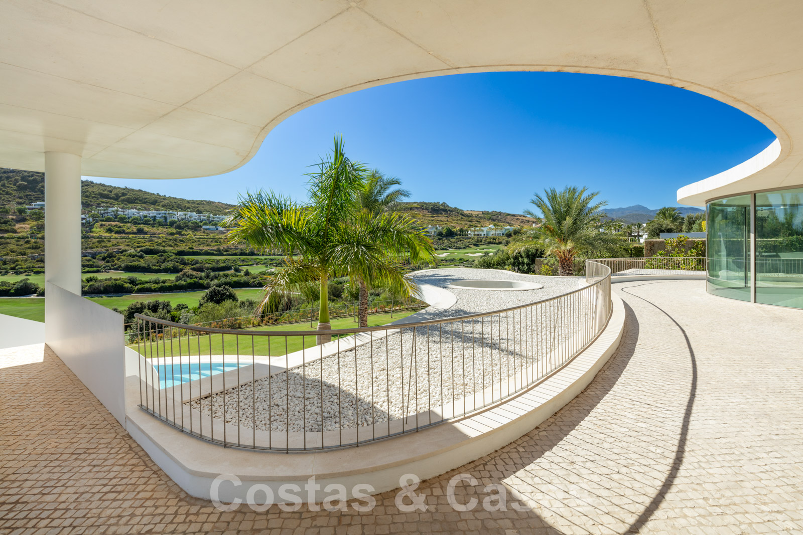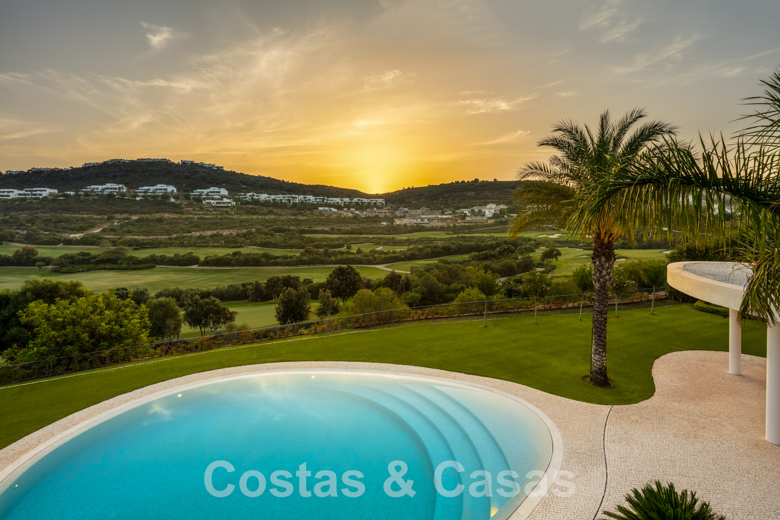 Vaste terrain avec une position élevée, adjacent au terrain de golf. Construite selon des normes très élevées et avec le souci du détail. Des fenêtres coulissantes à hauteur de pièce avec des cadres encastrés dans toute la villa offrent une lumière optimale. Piscine privée, entourée d'une terrasse et d'un jardin paysager soigné. Orientée à l'ouest. Vues sublimes sur la vallée du golf.