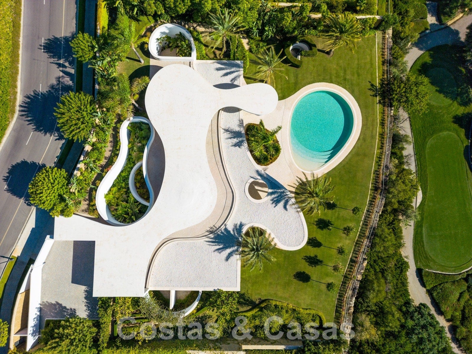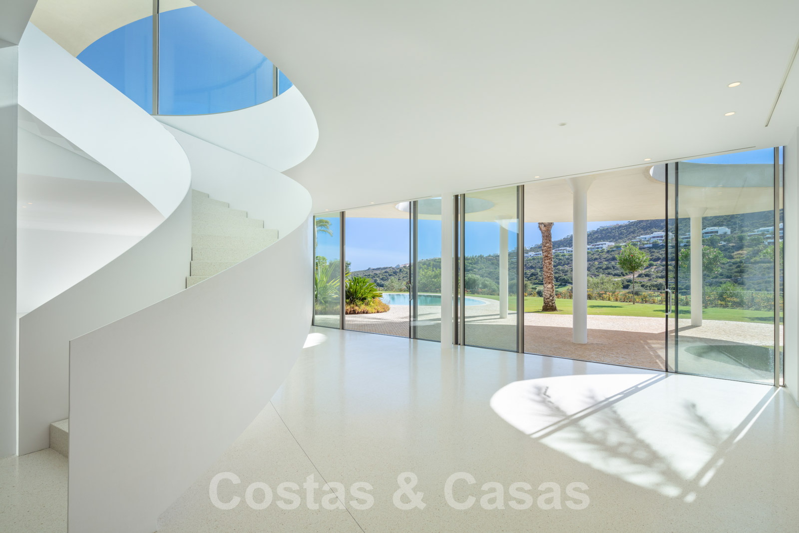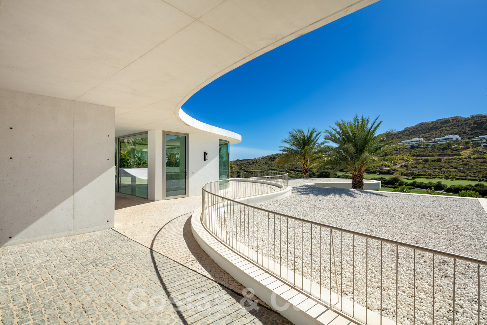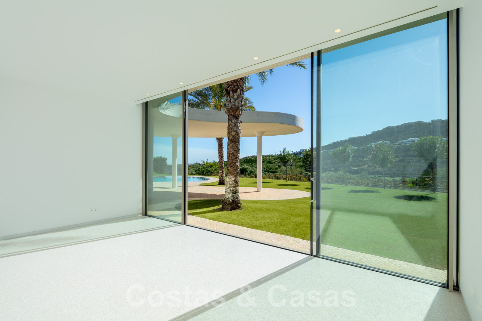 Vaste terrain avec une position élevée, adjacent au terrain de golf. Construite selon des normes très élevées et avec le souci du détail. Des fenêtres coulissantes à hauteur de pièce avec des cadres encastrés dans toute la villa offrent une lumière optimale. Piscine privée, entourée d'une terrasse et d'un jardin paysager soigné. Orientée à l'ouest. Vues sublimes sur la vallée du golf.