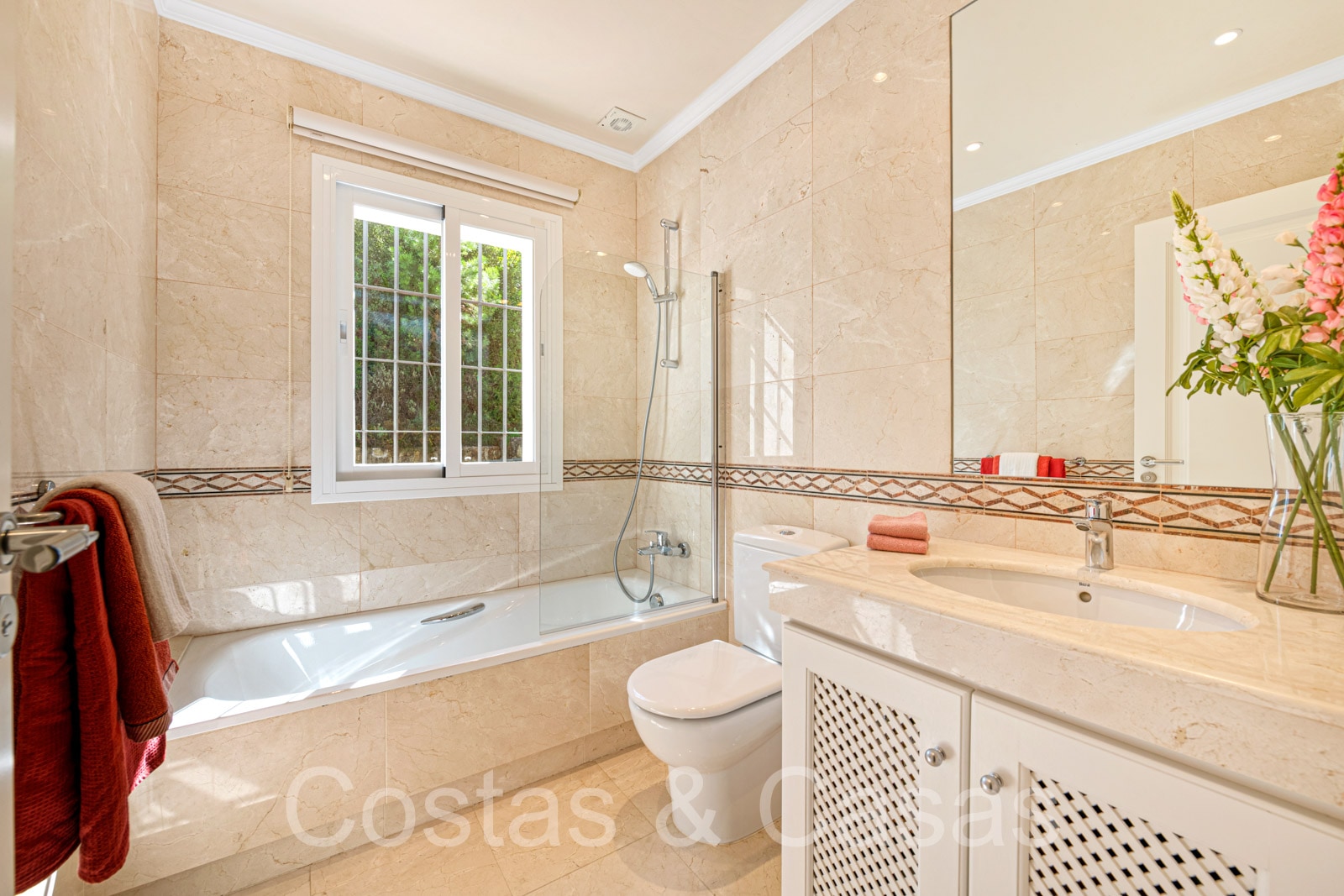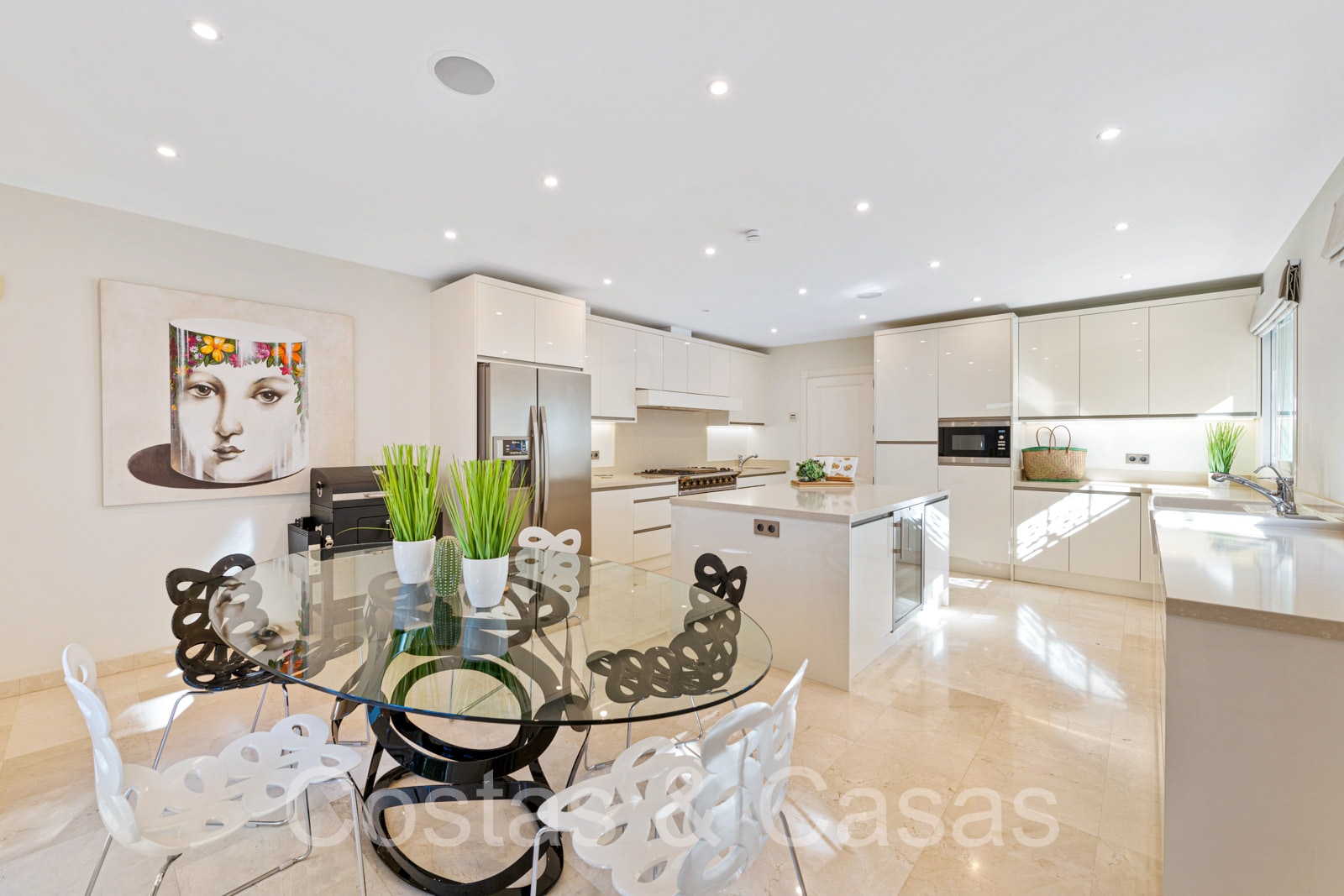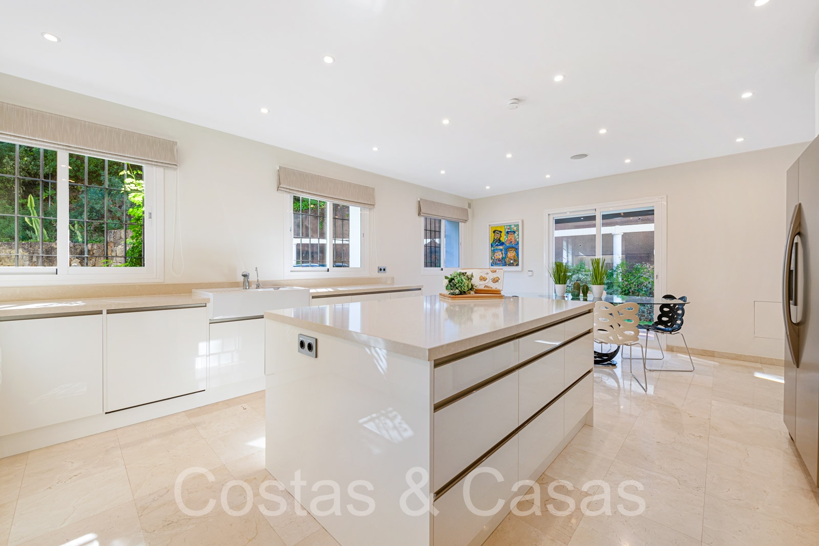 Villa individuelle au style architectural méditerranéen intemporel. Utilisation de matériaux de qualité et finition soignée. Vous entrez dans le hall d'entrée richement éclairé qui donne sur le patio. Toilette invité. Une cuisine spacieuse et séparée entièrement équipée avec des appareils électroménagers haut de gamme, un îlot et un coin repas. L'espace de vie a un plafond voûté, qui donne une apparence charmante et offre un salon et une salle à manger. De hautes portes-fenêtres s'ouvrent sur les espaces extérieurs confortables. 5 chambres, 5 salles de bains. La spacieuse suite parentale est située au dernier étage et est équipée d'un dressing, d'un coin salon, d'une salle de bain équipée et d'un accès à plusieurs terrasses privatives. Buanderie. Un logement intérieur pour les invités ou le personnel au sous-sol comprend une entrée privée, une chambre avec salle de bains privative, un salon et une kitchenette. Au sous-sol se trouvent une salle de fitness, un salon TV, une zone de jeux de bodega à vin et un débarras. Buanderie. Garage intérieur pour 2 voitures.