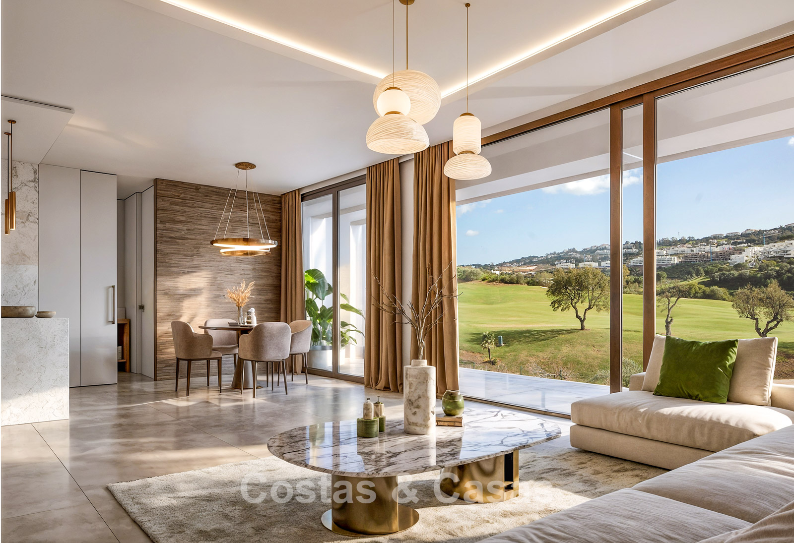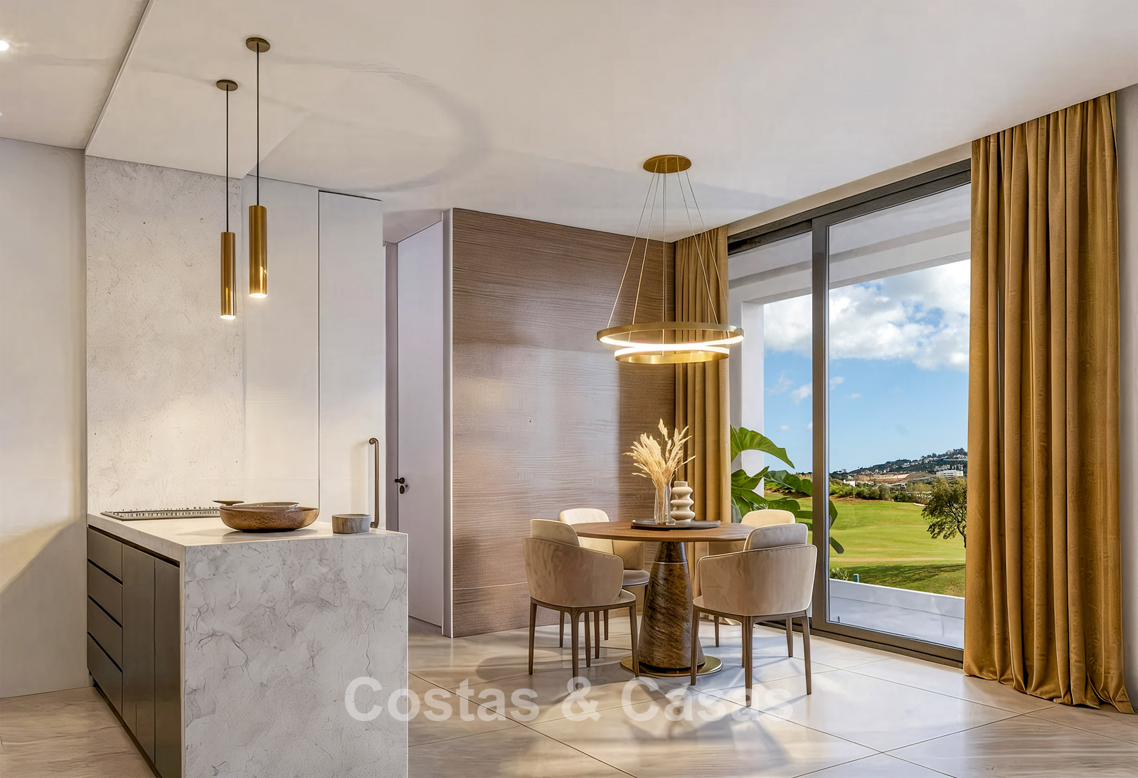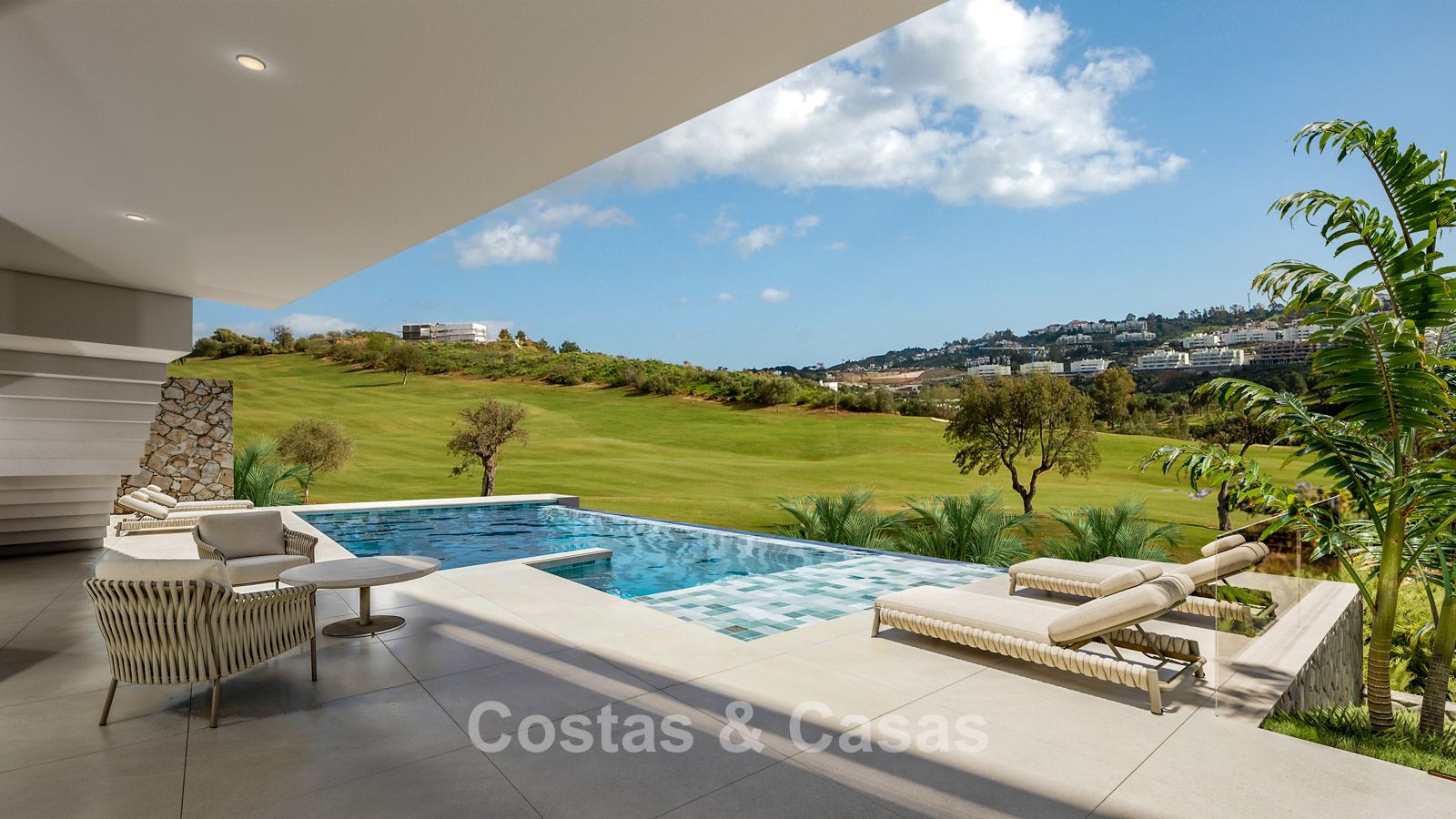 Villa neuve sur plan, au design moderne et aux finitions luxueuses. Construite avec des matériaux de haute qualité et un niveau de finition exceptionnel. Orientation plein sud idéale. Superbes vues sur le golf. Les vastes terrasses, incluant une cuisine extérieure avec barbecue, offrent un cadre parfait pour les repas en plein air et la détente. Les grandes baies vitrées coulissantes avec profils encastrés assurent une transition fluide vers l’extérieur et apportent une luminosité abondante. Espace de vie ouvert avec coin TV. Cuisine moderne entièrement équipée avec des appareils haut de gamme, ouverte sur la salle à manger. Les quatre chambres sont spacieuses et disposent chacune de leur salle de bain privative de luxe. Carport pour 2 voitures.