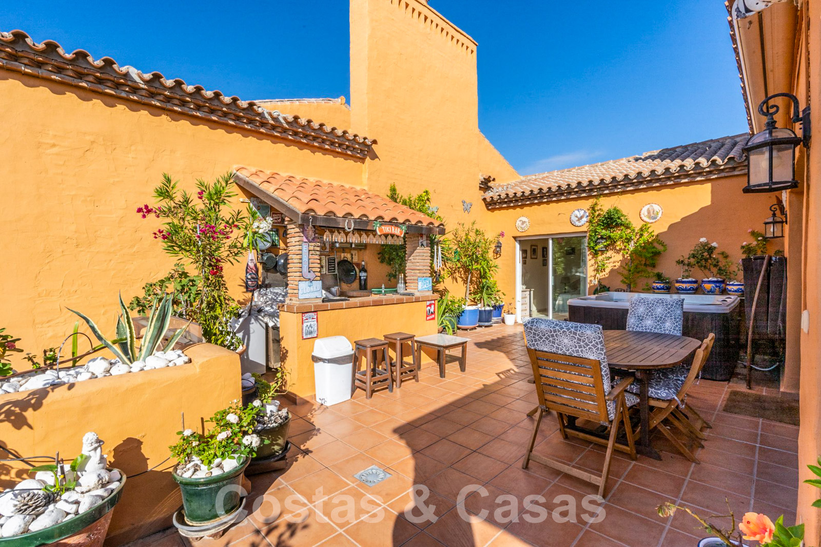 Duplex penthouse construit à un niveau élevé. Intérieur chaleureux avec des matériaux naturels tels que le bois et la terre cuite. Orienté sud-ouest avec une vue imprenable sur la mer Méditerranée. Confortable séjour ouvert avec salon TV et salle à manger. Deuxième salon. Cuisine séparée, entièrement équipée, avec un garde-manger. L'espace de vie est entouré d'une généreuse terrasse, équipée d'un bar, d'un jacuzzi, d'une salle à manger en plein air et de coins salons. 4 chambres à coucher, dont 2 avec salle de bains privative. À l'étage supérieur, une pièce est actuellement utilisée comme salle de loisirs, mais pourrait facilement servir de chambre à coucher. Un solarium spacieux. Sols en marbre crème. Débarras. Garage intérieur pour 2 voitures.