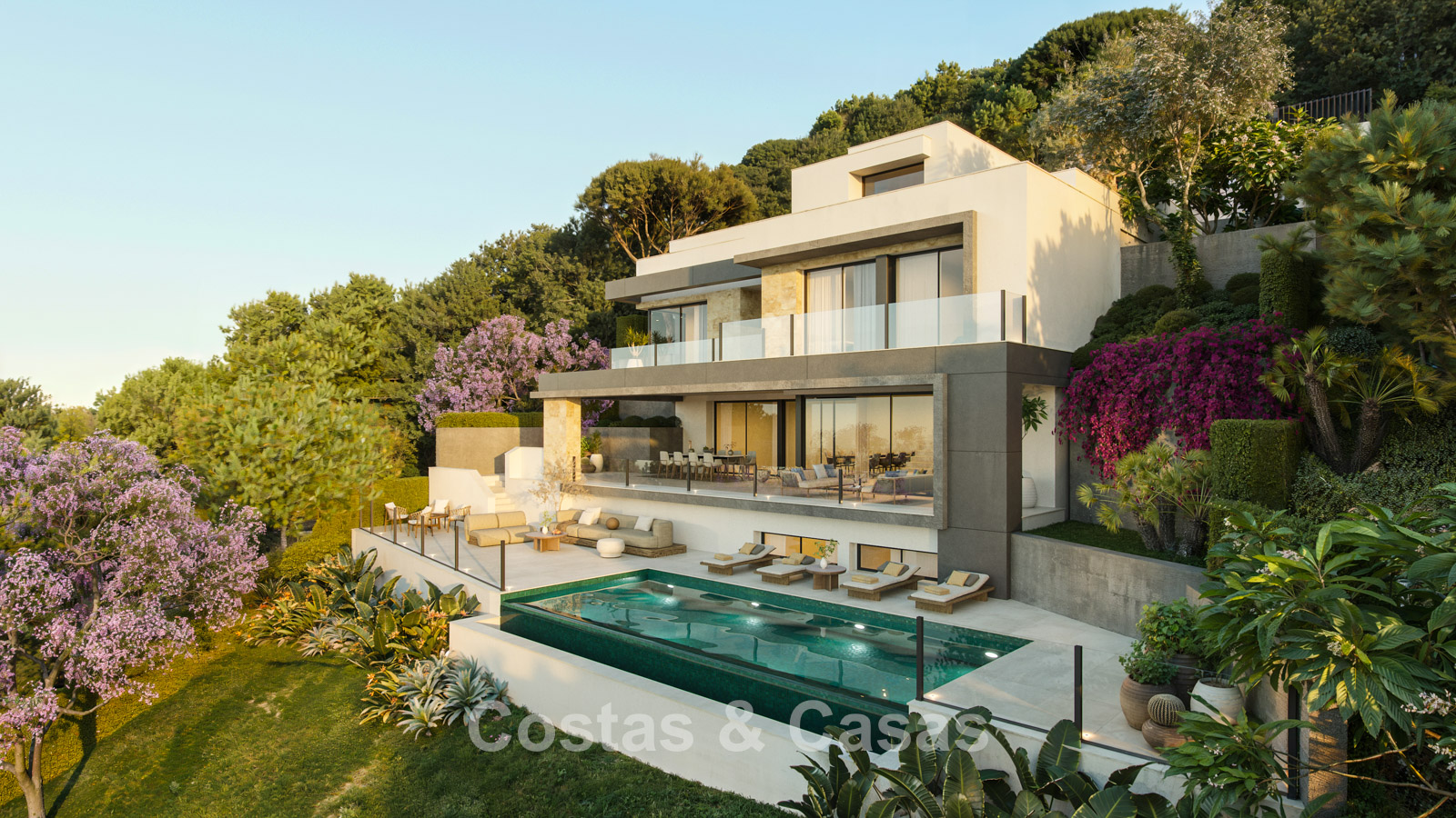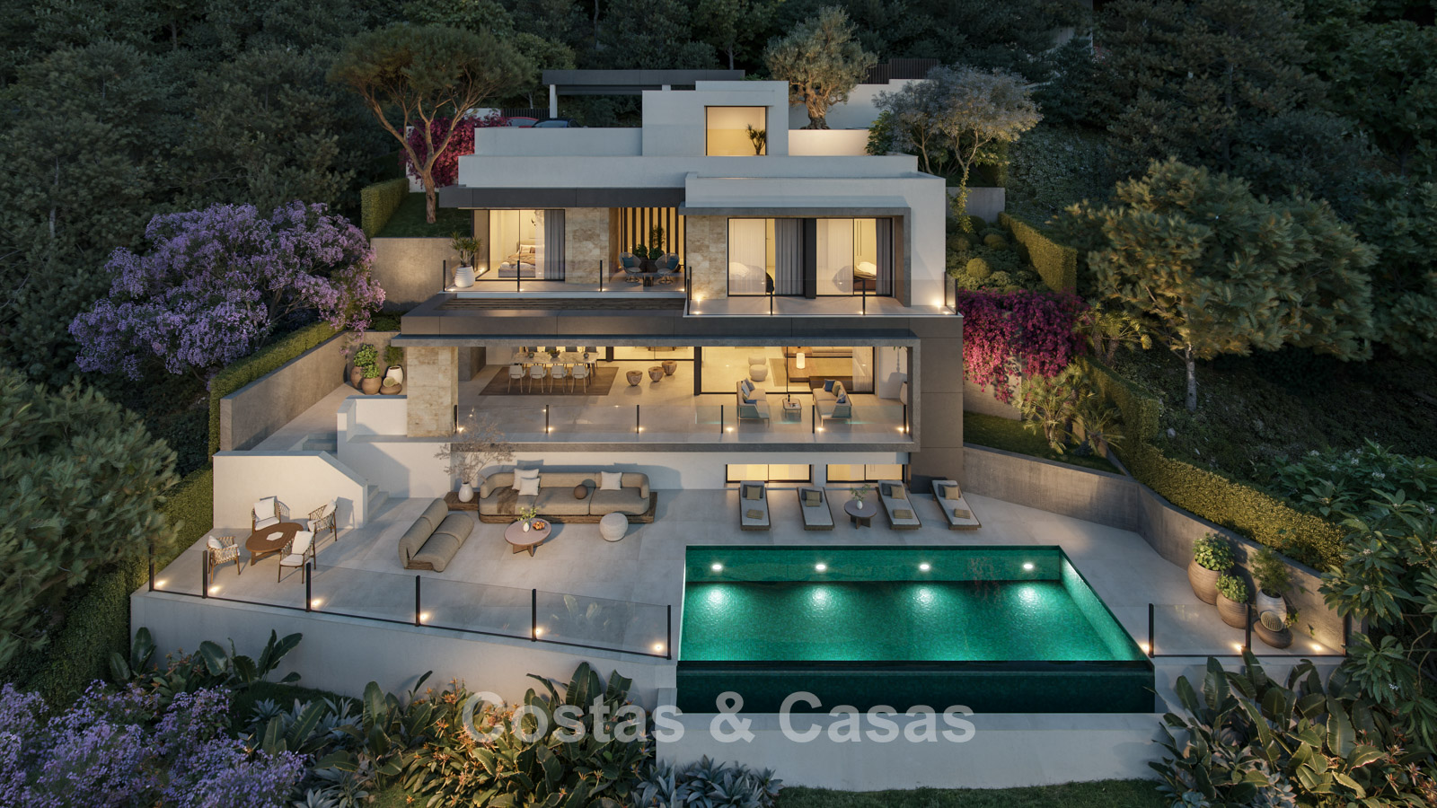 Vaste terrain en position dominante. Terrasses ensoleillées et couvertes offrant la possibilité d’aménager un salon. Piscine à débordement intégrée, avec divers salons attenants. Orientation est. Vue panoramique sur la mer Méditerranée.