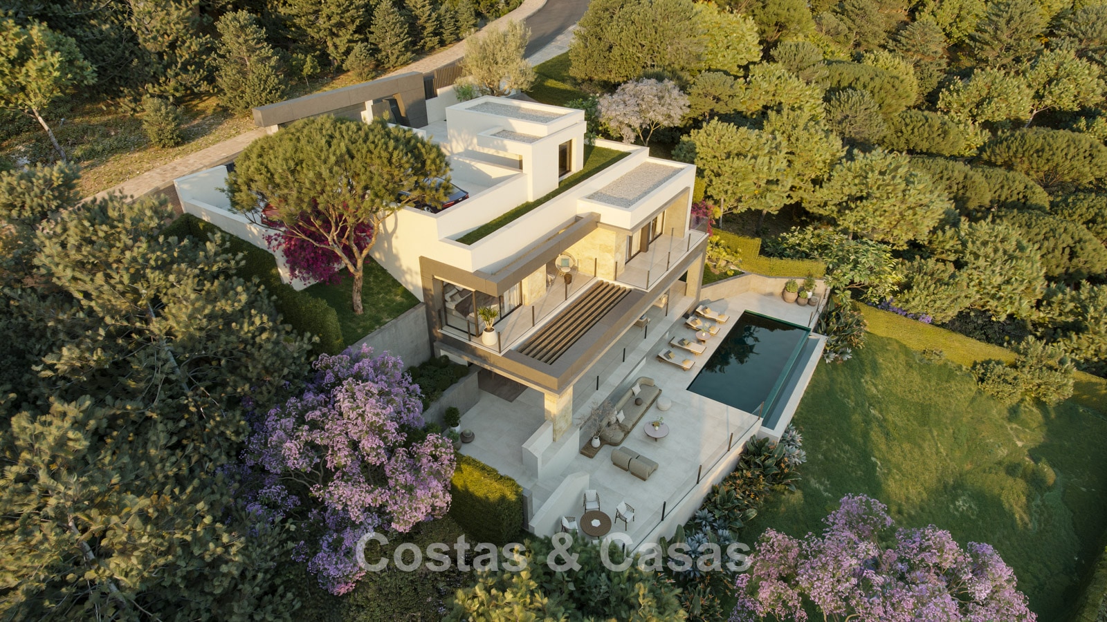 Autres caractéristiques : Pré-installation pour ascenseur. Climatisation réversible. Plancher chauffant à eau dans toute la maison. Système aérothermique. Double vitrage. Balustrades en verre autour de la terrasse. Système domotique. Éclairage LED. Armoires intégrées sur mesure. Pré-installation pour volets roulants électriques. Système d'arrosage automatique. Éclairage extérieur. Installation télécom.