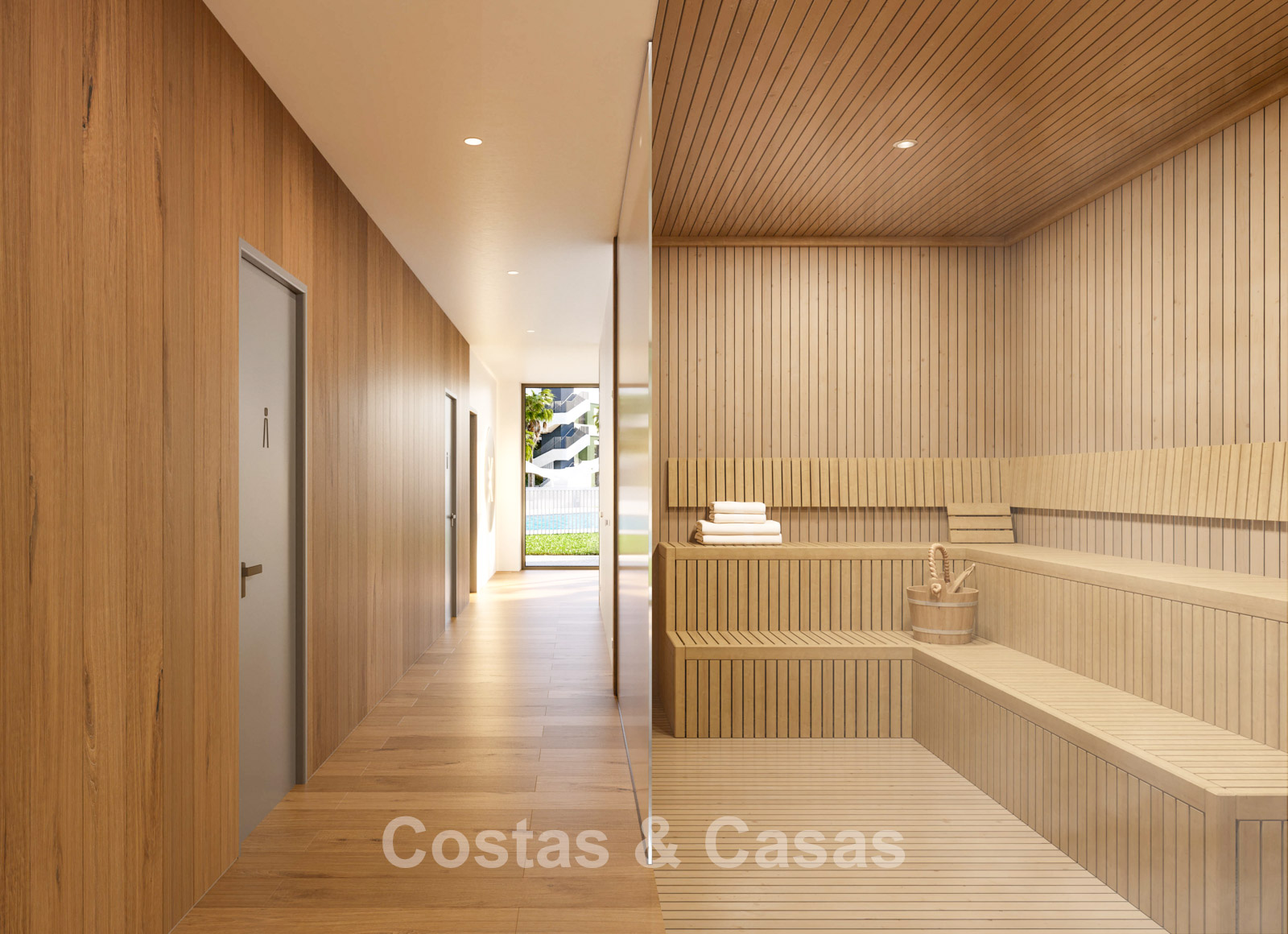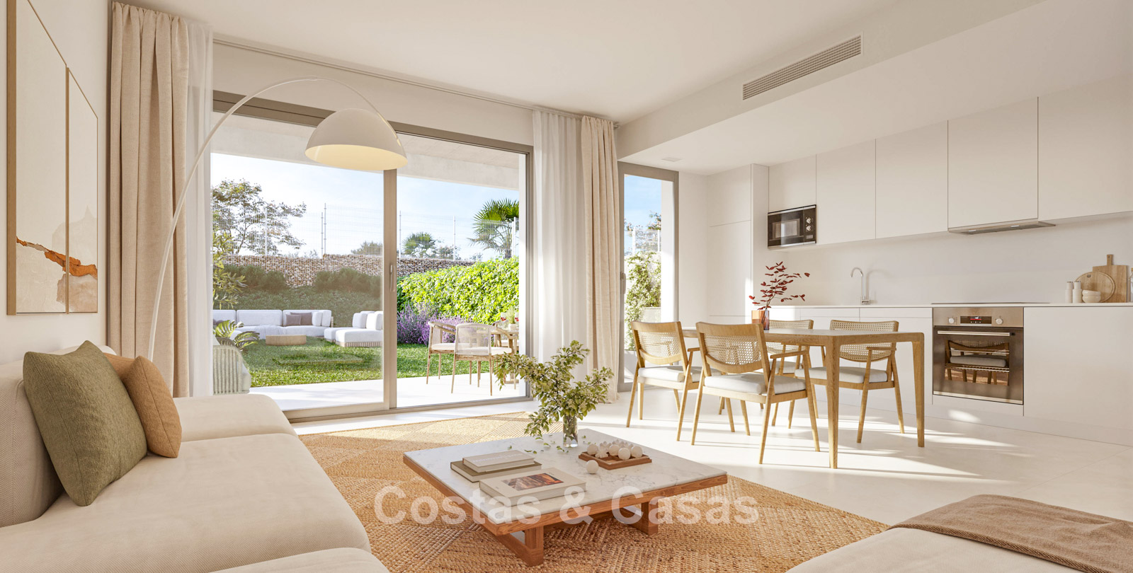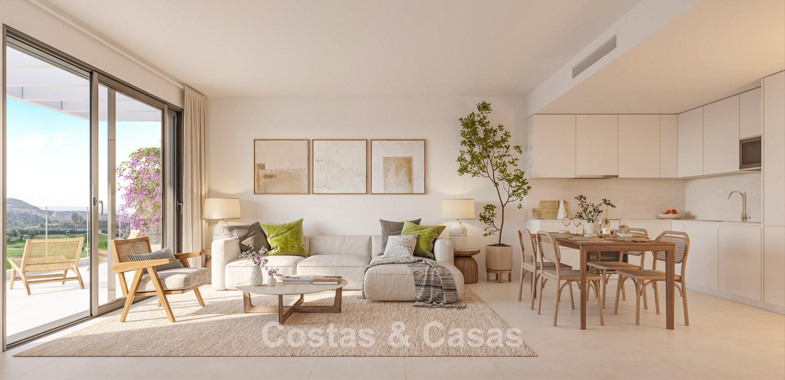 Appartements neufs au design moderniste. Les finitions seront réalisées selon les plus hauts standards de qualité, avec une attention aux détails et à la durabilité. Selon l'unité, vous profiterez de belles vues sur la mer, la nature environnante et les fairways verdoyants du golf. Les appartements du rez-de-chaussée bénéficient d'un jardin privé. Les penthouses disposent d'une vaste terrasse sur le toit. Intérieur ensoleillé et moderne. Espace de vie ouvert avec coin salon et cuisine. Un mur de cuisine intégré dans une teinte claire offre des appareils électroménagers intégrés. De hautes fenêtres coulissantes s'ouvrent sur la terrasse, inondant l'intérieur de lumière naturelle. Sols en porcelaine de qualité grand format. Débarras et parking inclus.