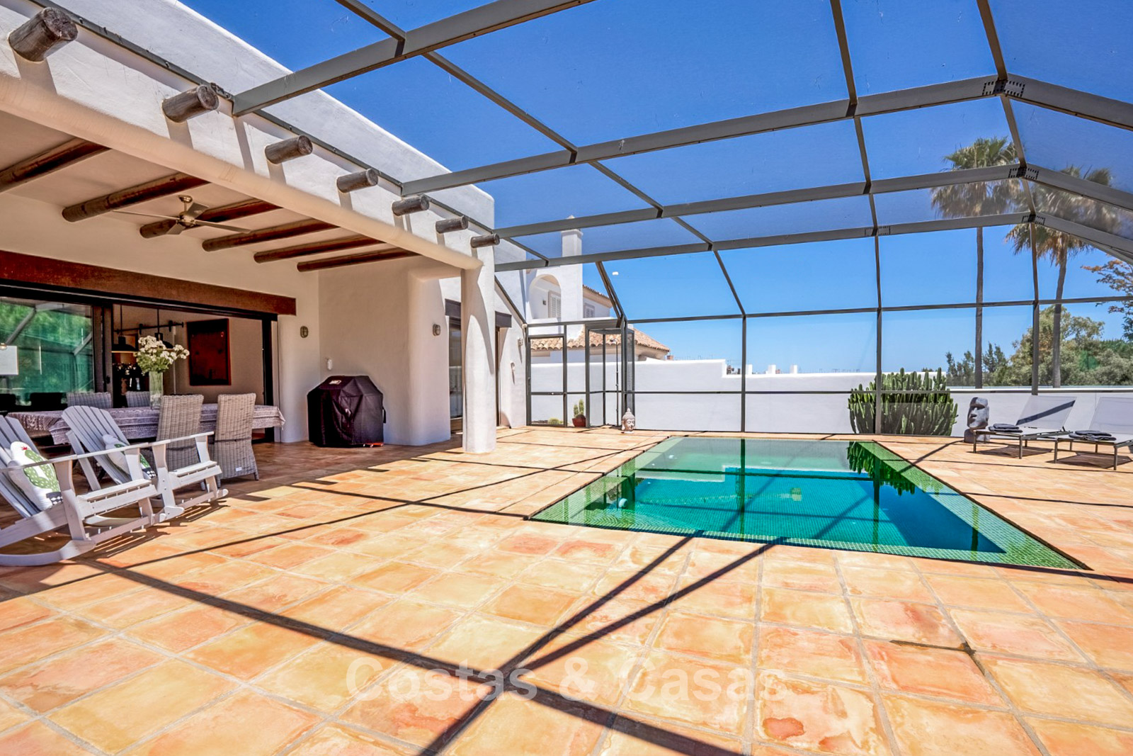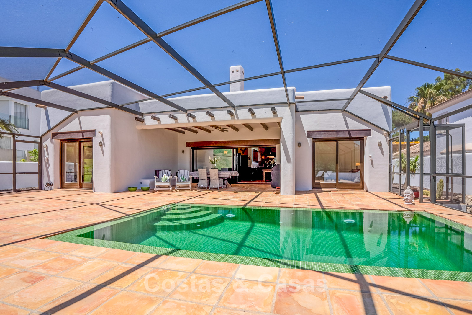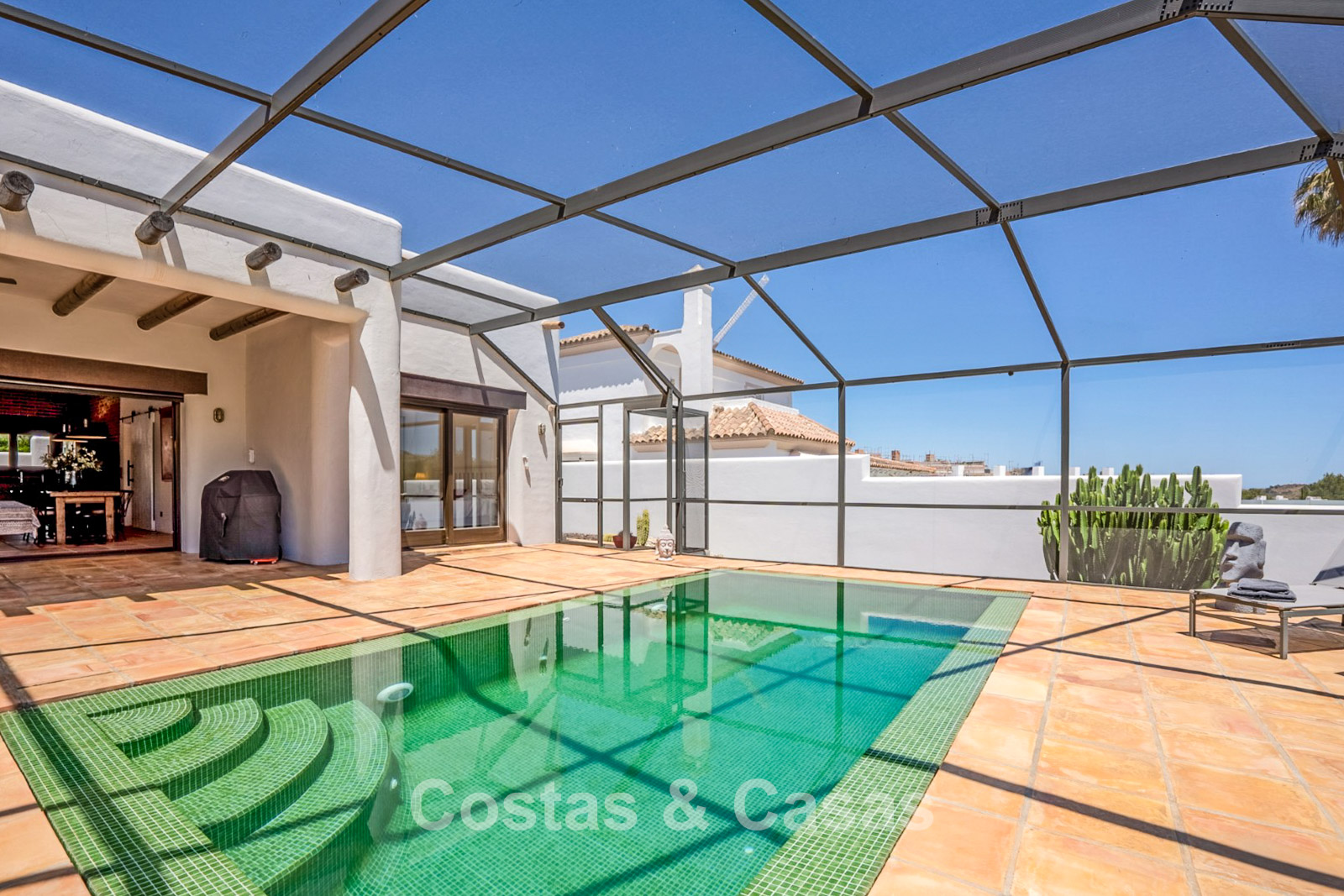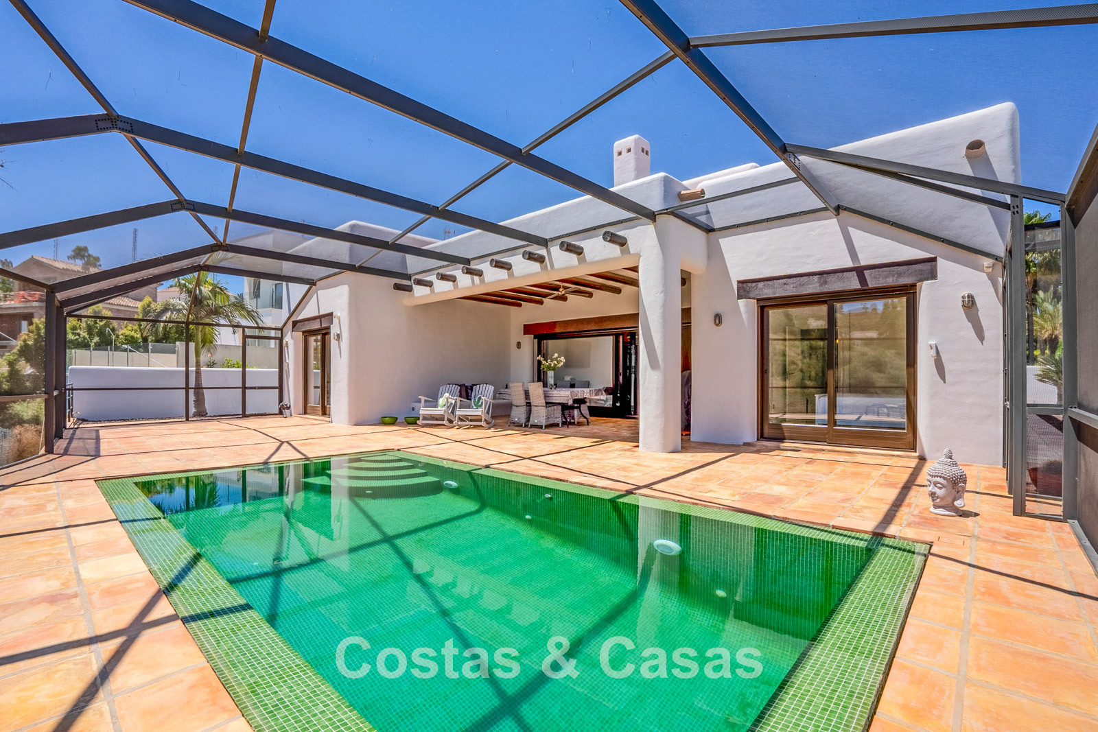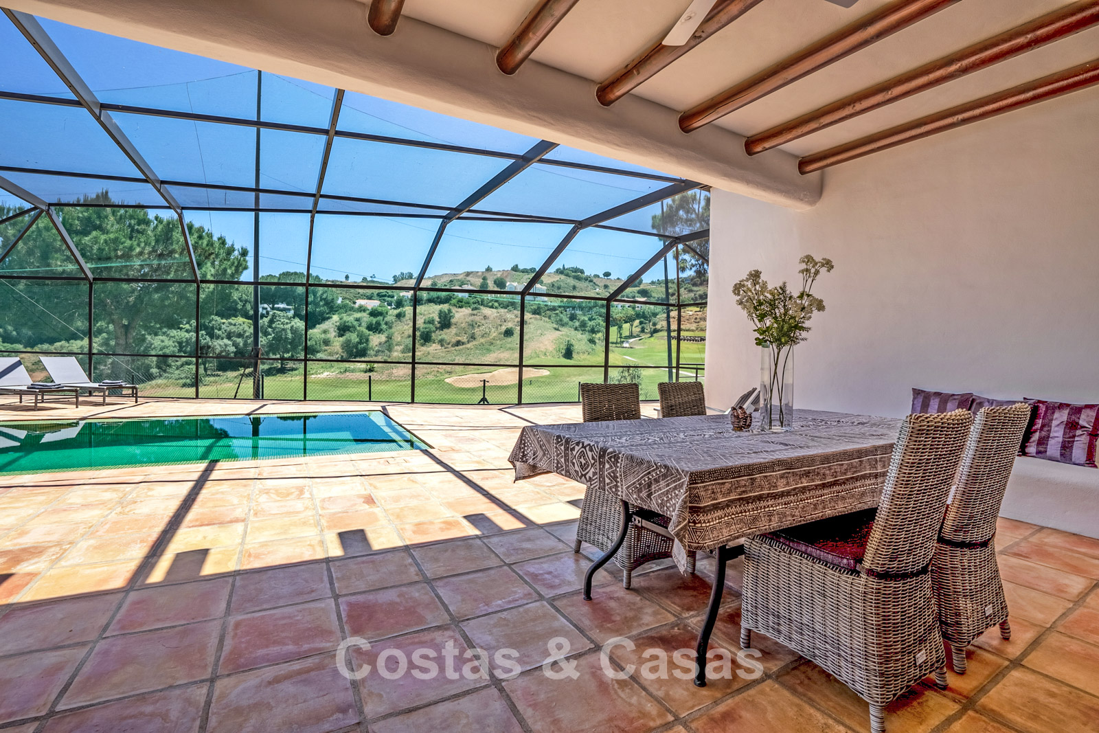 Terrain clôturé en bordure du golf. Jardin facile d’entretien, nécessitant un minimum de temps et d’efforts. Piscine intérieure privée. Une immense terrasse vitrée crée un espace extérieur exclusif où confort et lumière naturelle convergent. Orientation sud. Vue panoramique sur les greens.