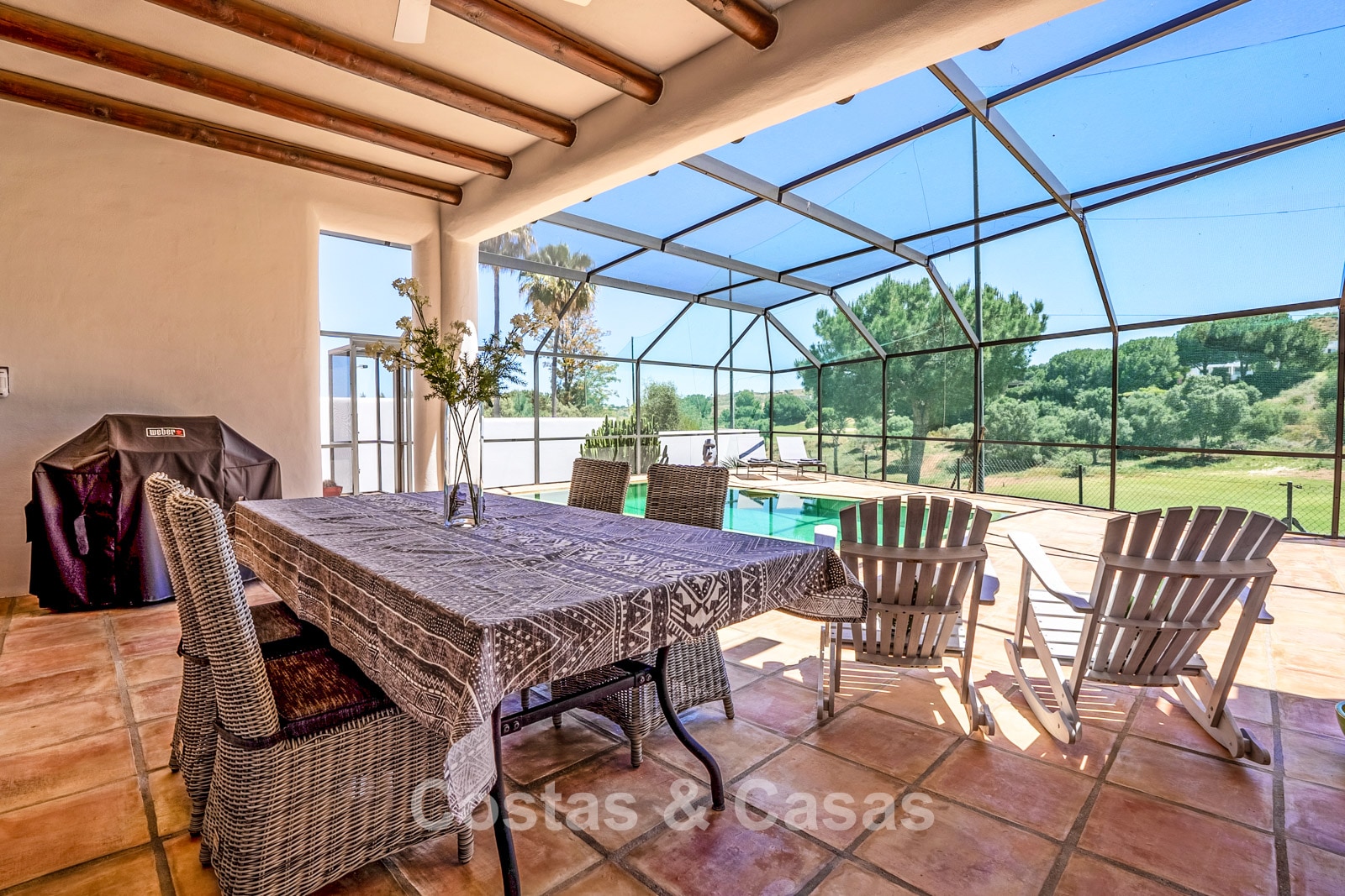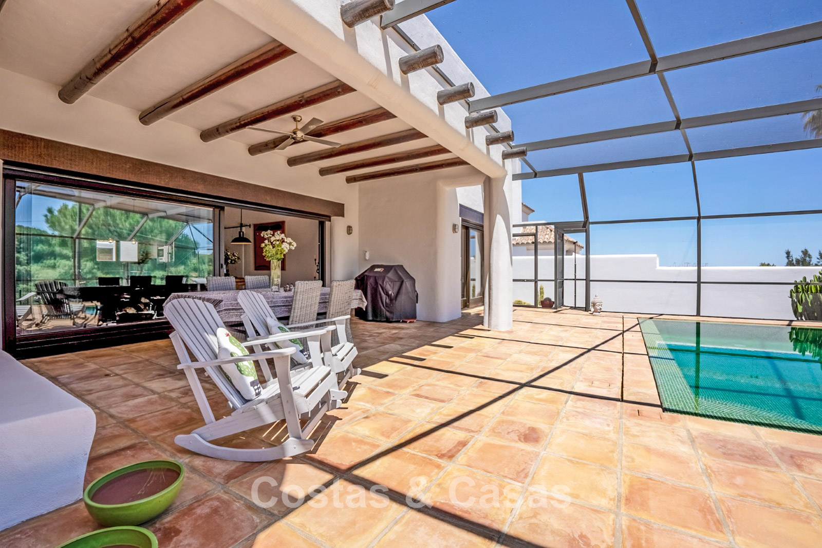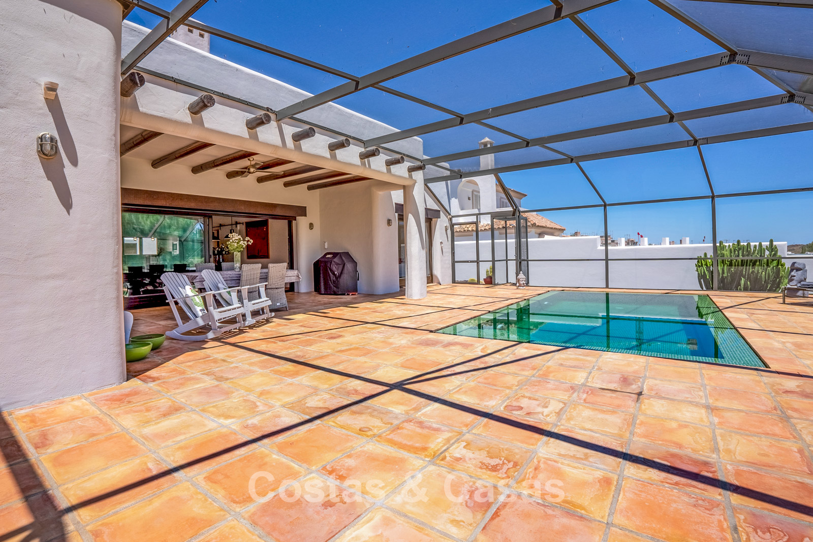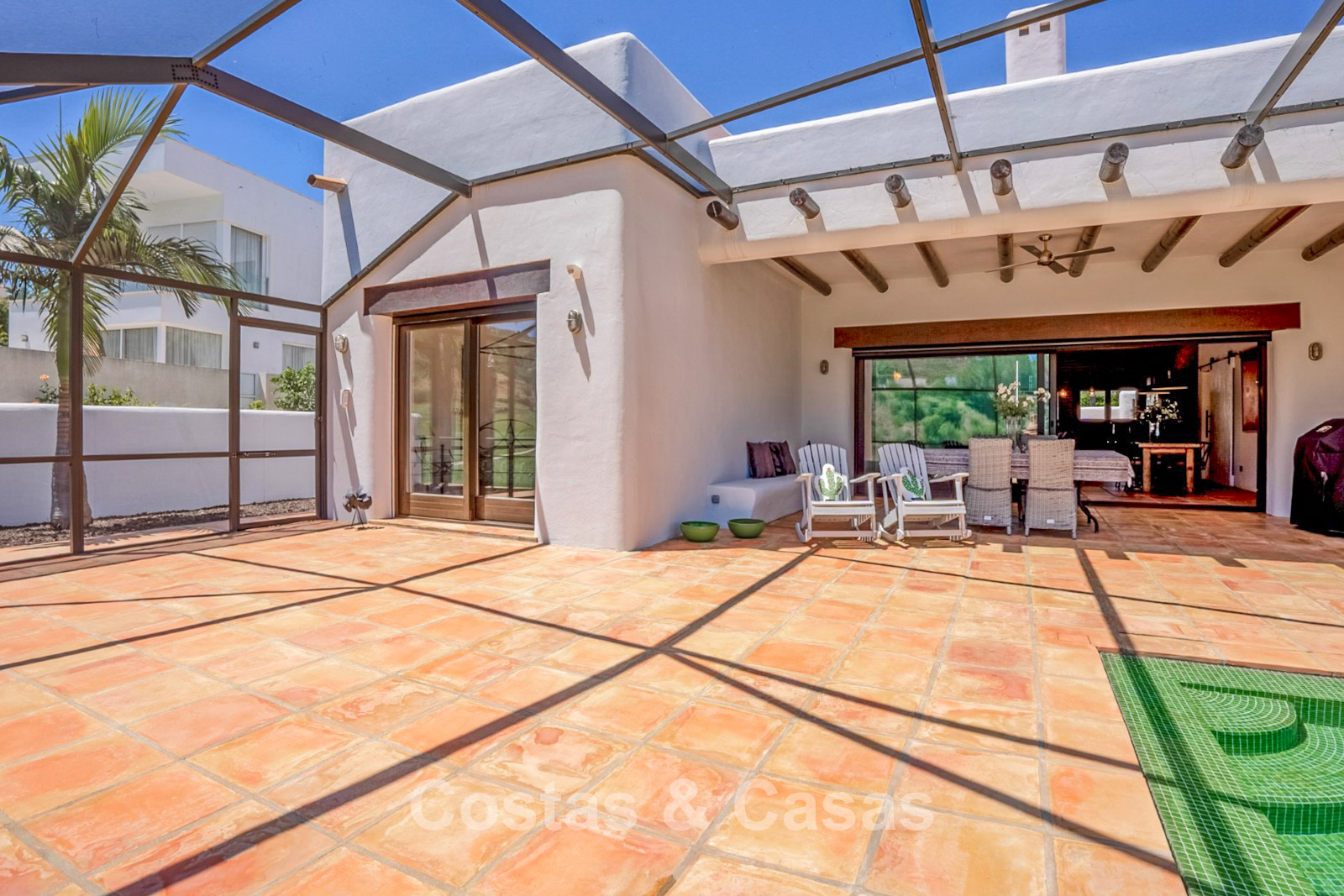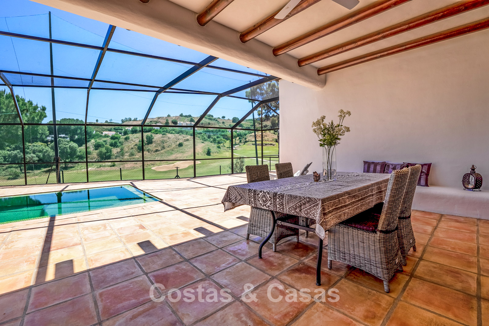 Terrain clôturé en bordure du golf. Jardin facile d’entretien, nécessitant un minimum de temps et d’efforts. Piscine intérieure privée. Une immense terrasse vitrée crée un espace extérieur exclusif où confort et lumière naturelle convergent. Orientation sud. Vue panoramique sur les greens.