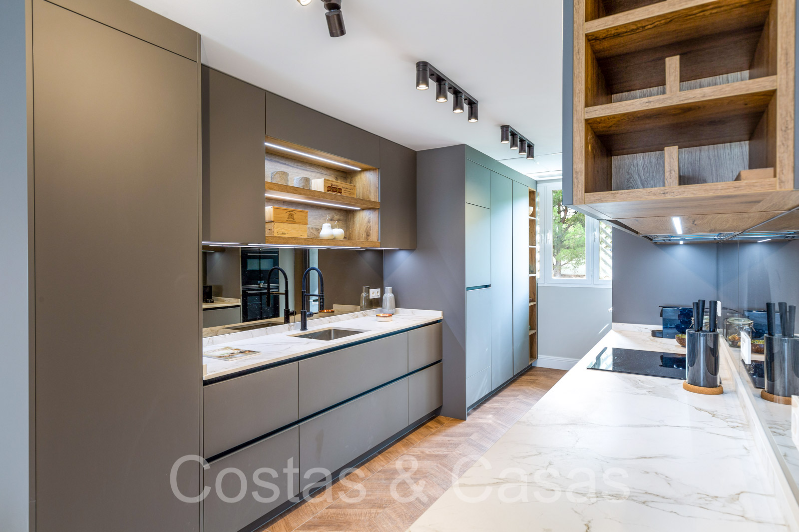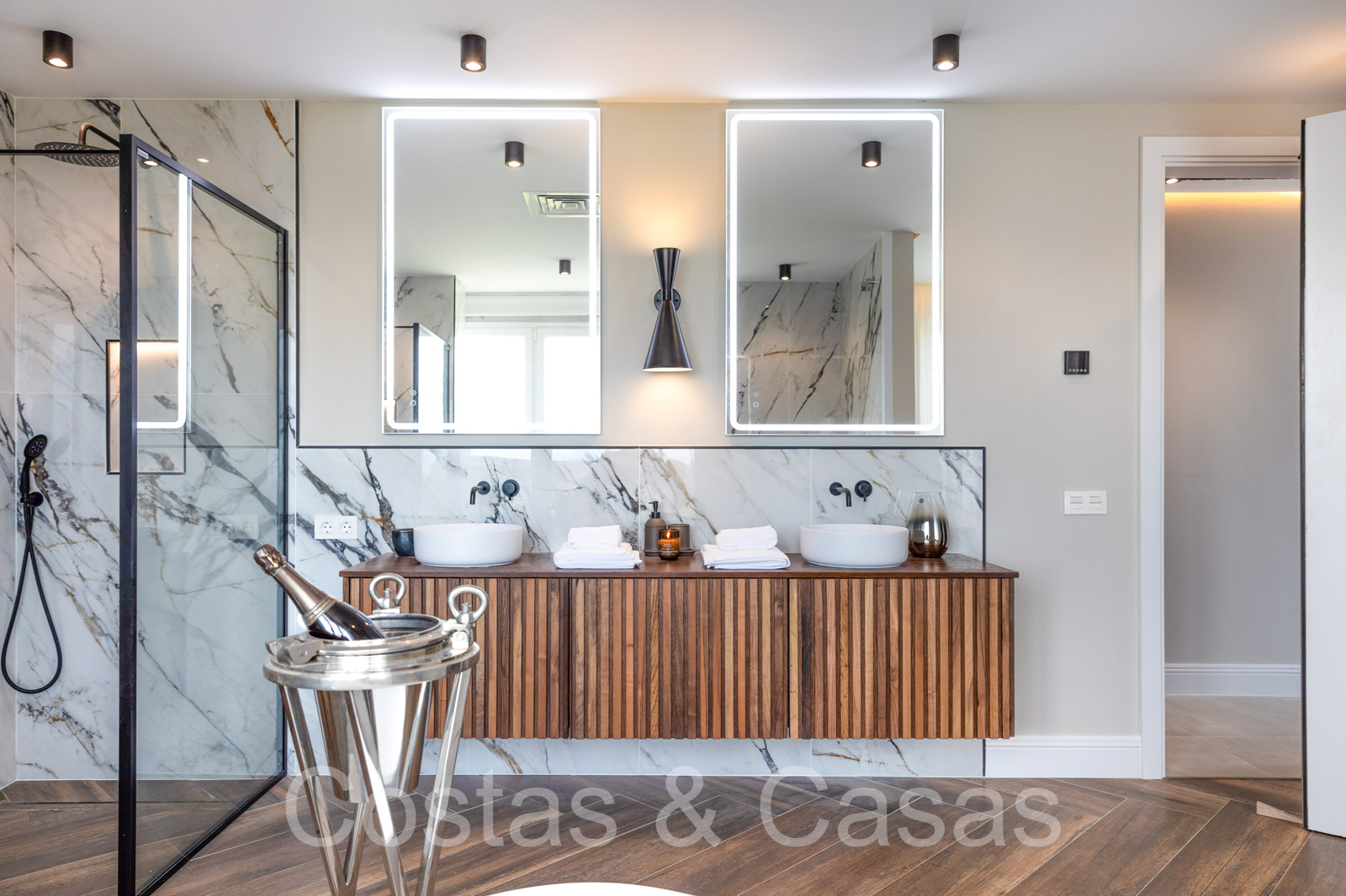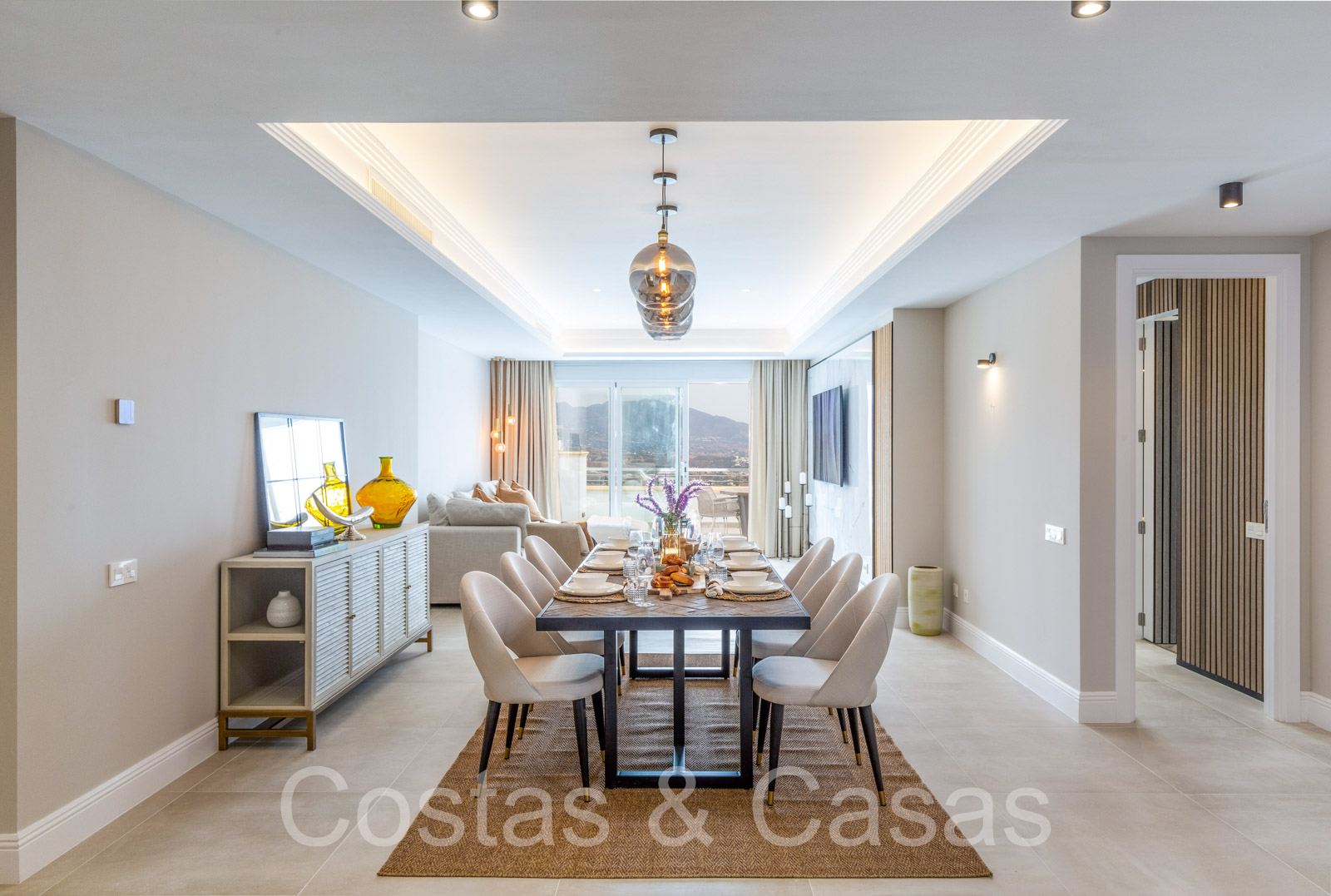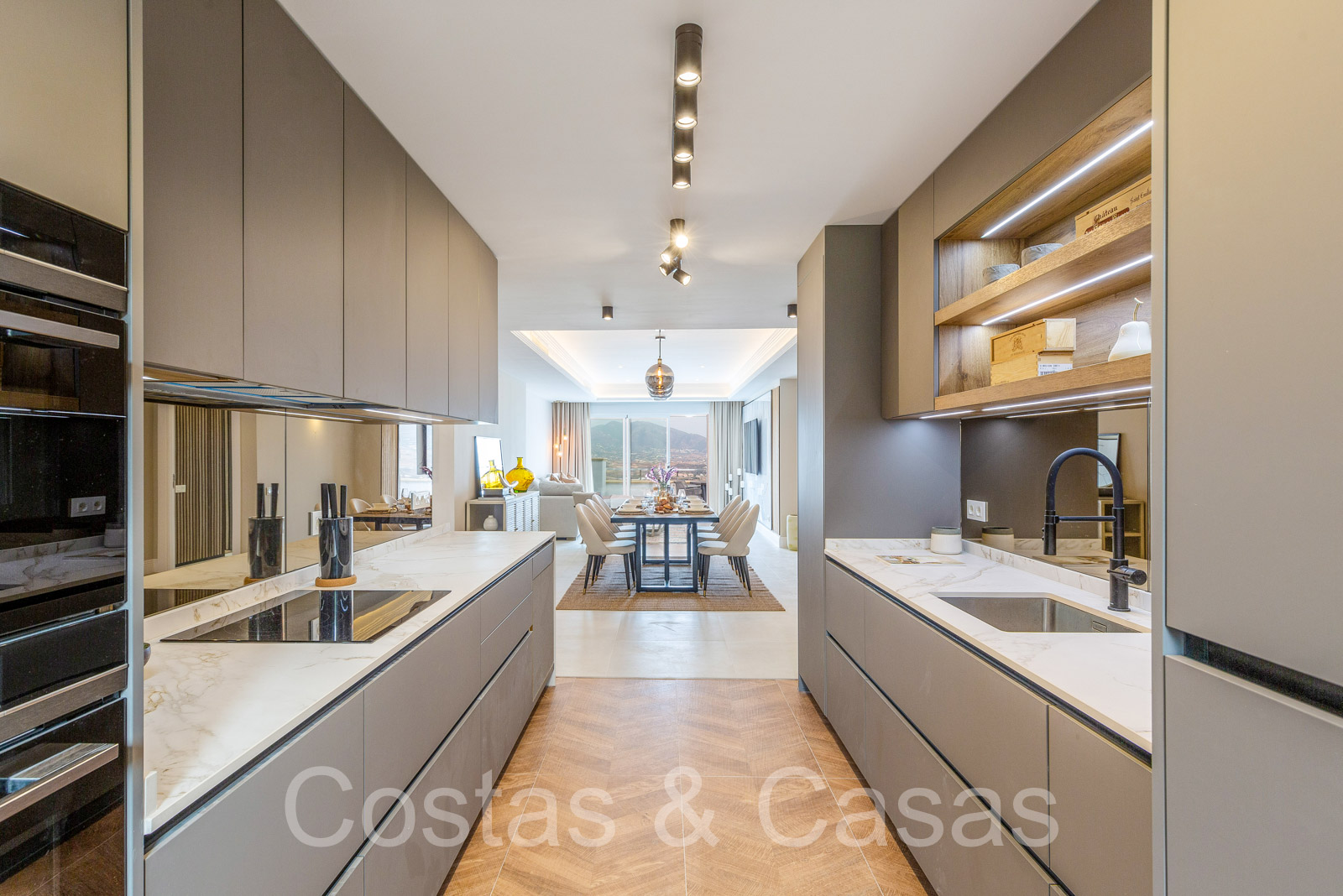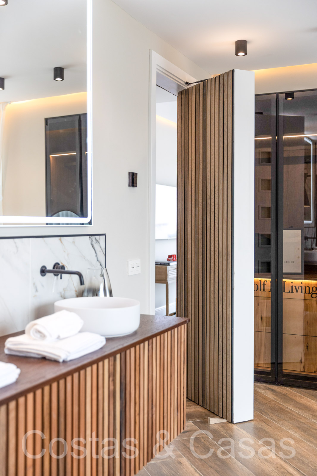 Penthouse spacieux de style contemporain. L'appartement a été rénové avec une finition de haute qualité et un mobilier de luxe contemporain. Intérieur moderne avec un aménagement ouvert où tout l'espace est utilisé. Terrasse spacieuse et ensoleillée. Orientation sud-est. Belles vues sur les terrains de golf et le paysage montagneux vers la mer Méditerranée. Séjour avec salon TV et coin repas intégré. La cuisine ouverte et moderne est équipée d'appareils électroménagers de haute qualité et offre de nombreux espaces de rangement. 3 chambres avec chacune sa salle de bain. Grâce aux hautes structures de fenêtres, l'intérieur bénéficie de beaucoup de lumière naturelle. Sols en carrelage léger et grand format. Les parquets en céramique dans les salles de bains confèrent un aspect chaleureux. Débarras et parking souterrain inclus dans le prix. Meublé pour un montant supplémentaire de 30 000 €.