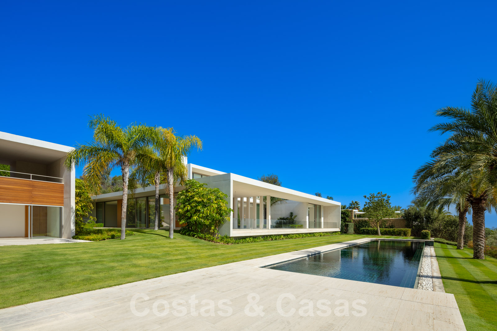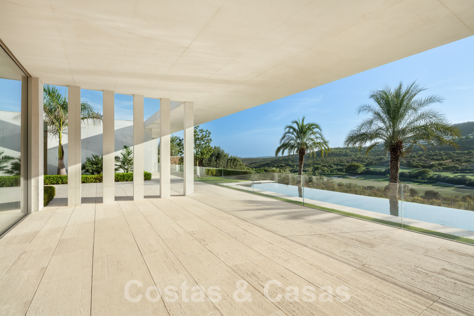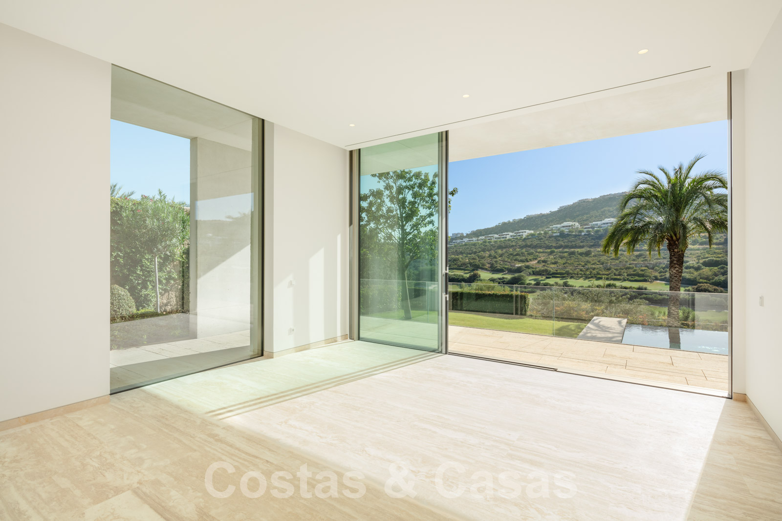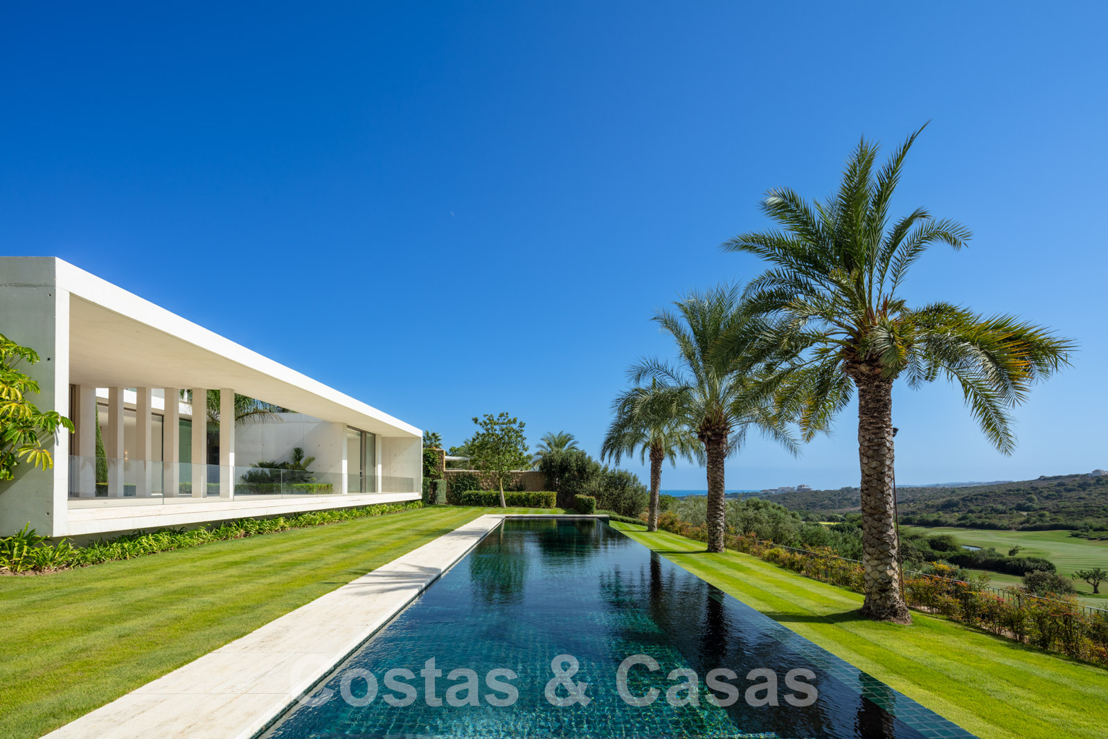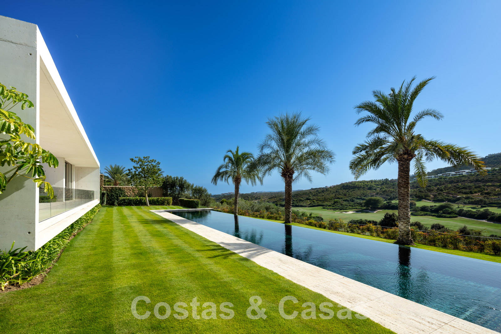 Vaste terrain avec une position élevée, adjacent au terrain de golf. Construite selon des normes très élevées et avec le souci du détail. Des fenêtres coulissantes à hauteur de pièce avec des cadres encastrés dans toute la villa offrent une lumière optimale. Piscine à débordement avec terrasse adjacente, entourée d'un jardin paysager bien entretenu. Orientée à l'ouest. Vues sublimes sur la vallée du golf.