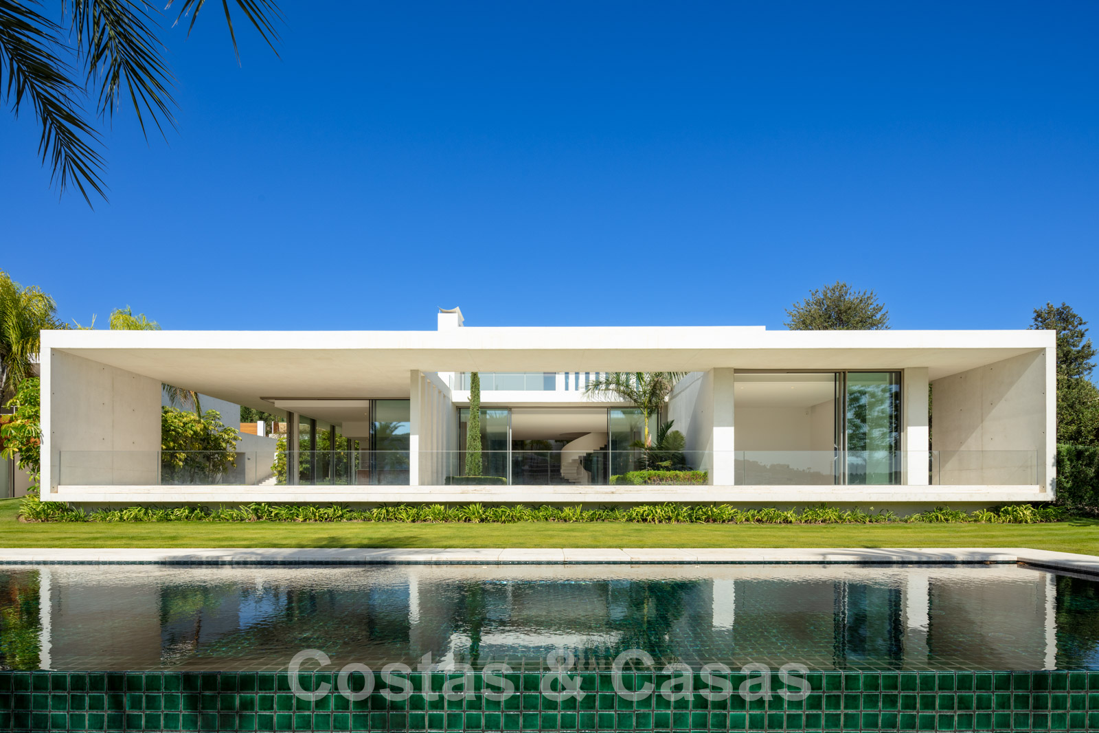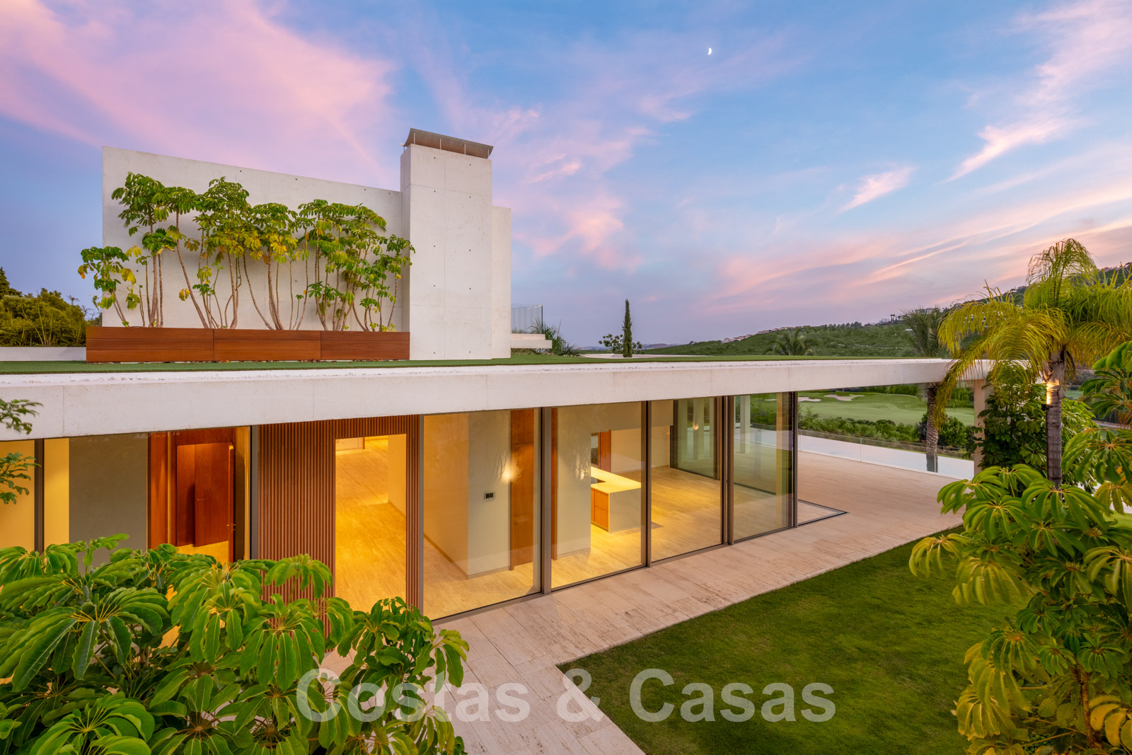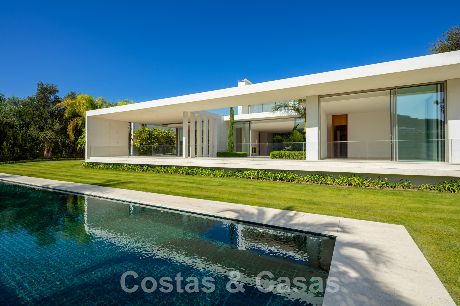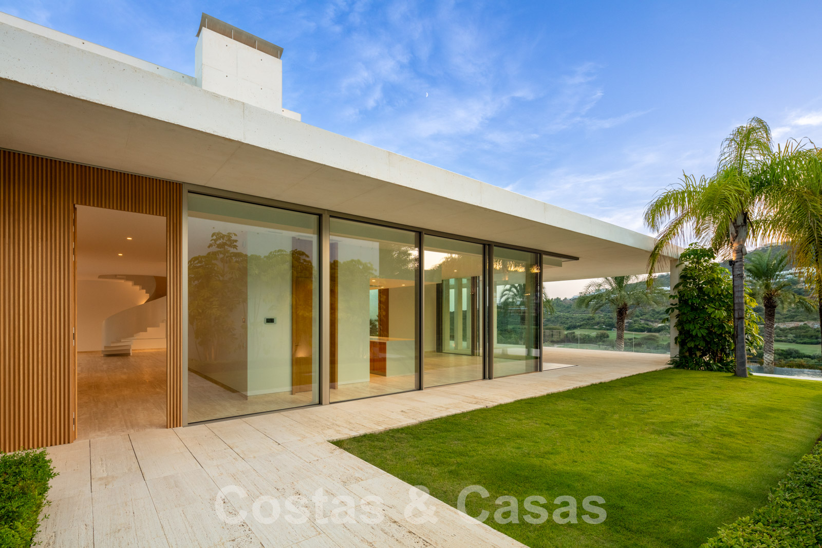 Vaste terrain avec une position élevée, adjacent au terrain de golf. Construite selon des normes très élevées et avec le souci du détail. Des fenêtres coulissantes à hauteur de pièce avec des cadres encastrés dans toute la villa offrent une lumière optimale. Piscine à débordement avec terrasse adjacente, entourée d'un jardin paysager bien entretenu. Orientée à l'ouest. Vues sublimes sur la vallée du golf.