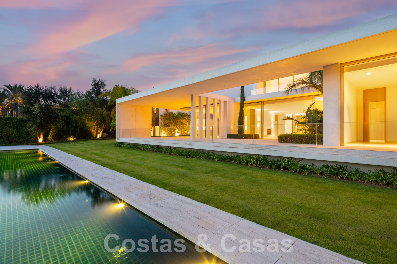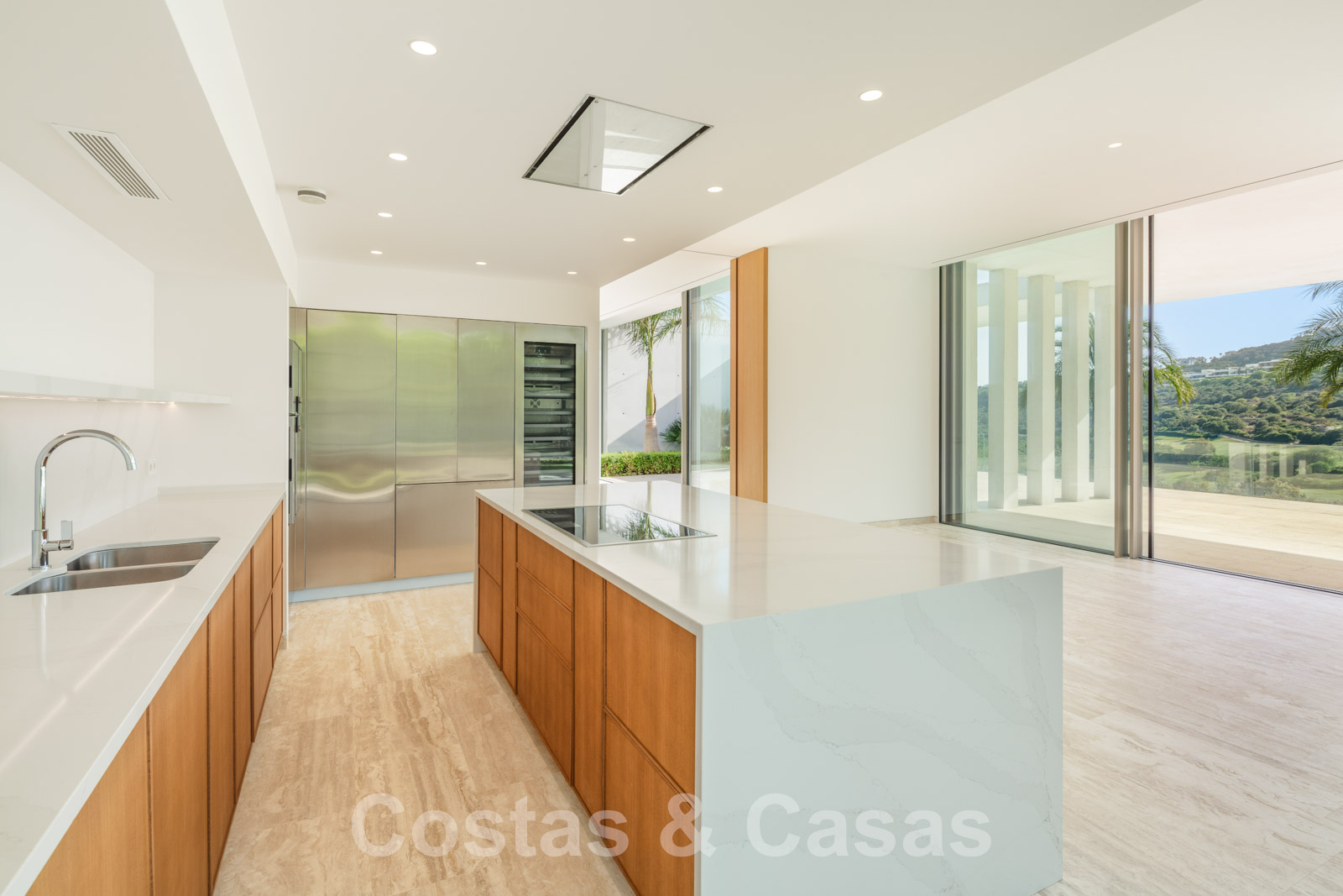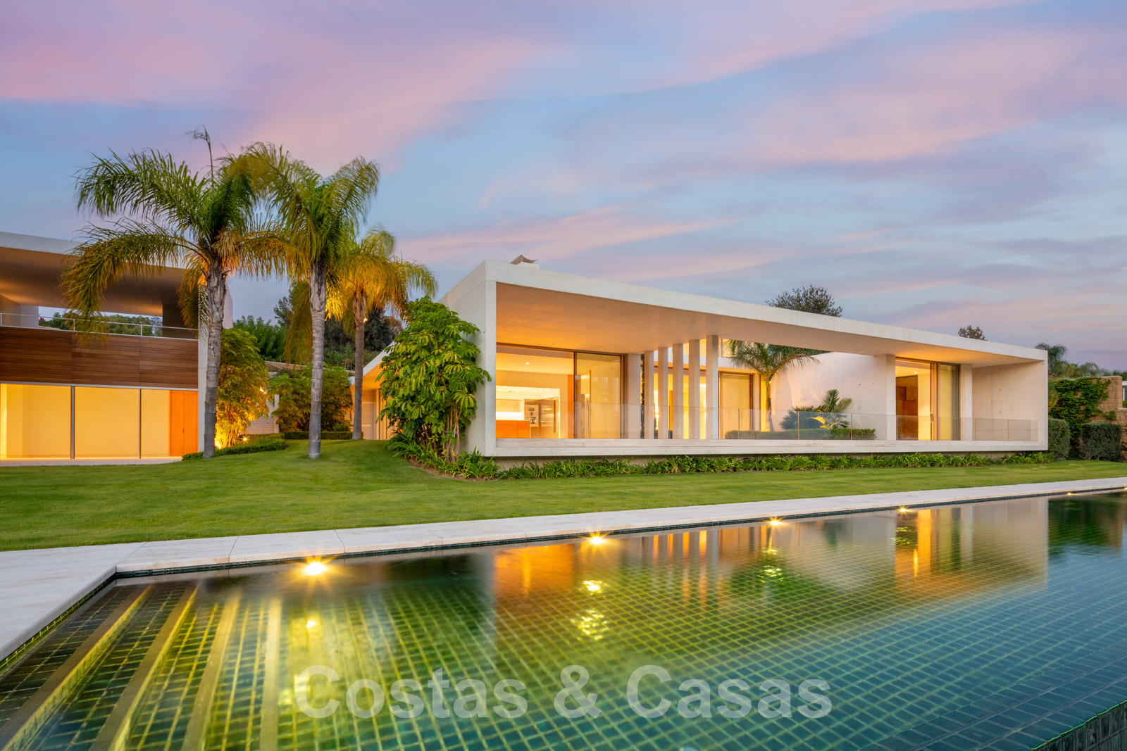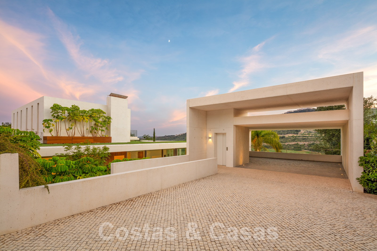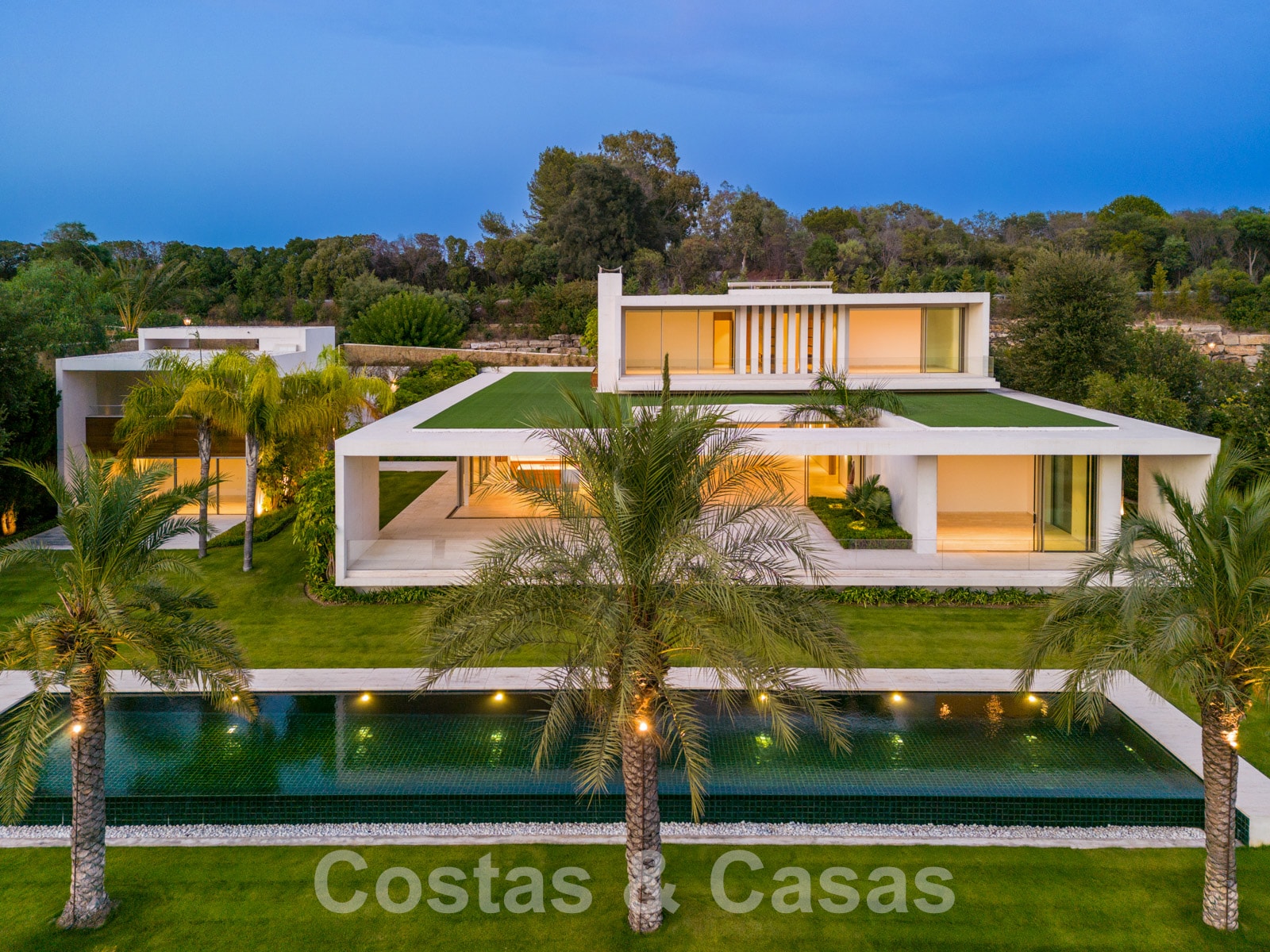 Vaste terrain avec une position élevée, adjacent au terrain de golf. Construite selon des normes très élevées et avec le souci du détail. Des fenêtres coulissantes à hauteur de pièce avec des cadres encastrés dans toute la villa offrent une lumière optimale. Piscine à débordement avec terrasse adjacente, entourée d'un jardin paysager bien entretenu. Orientée à l'ouest. Vues sublimes sur la vallée du golf.