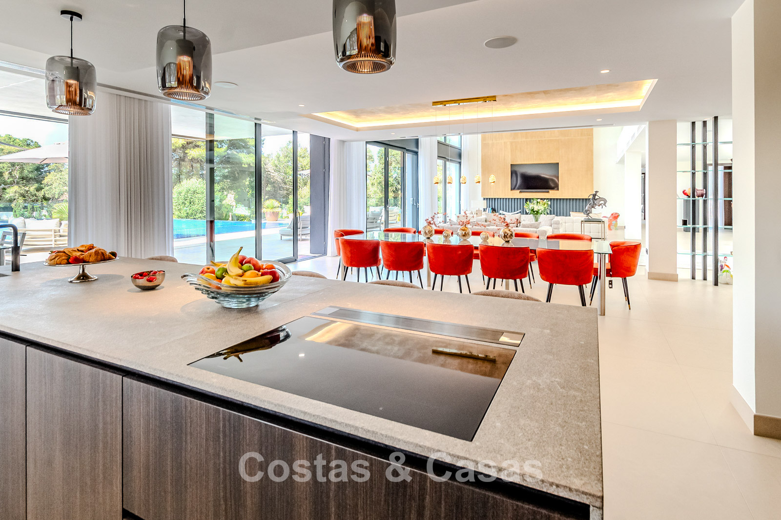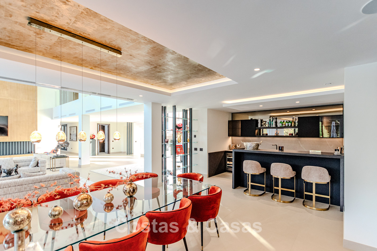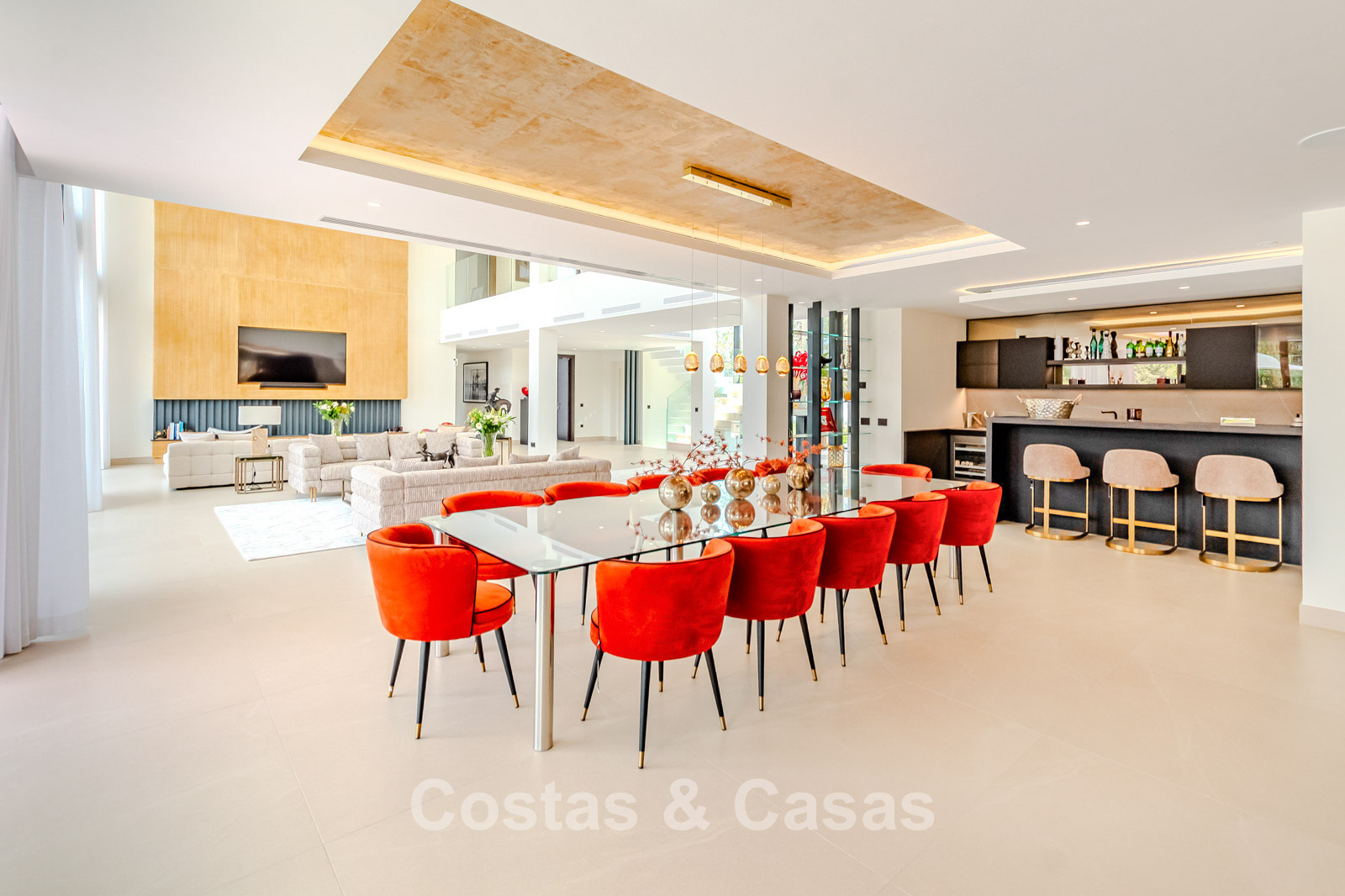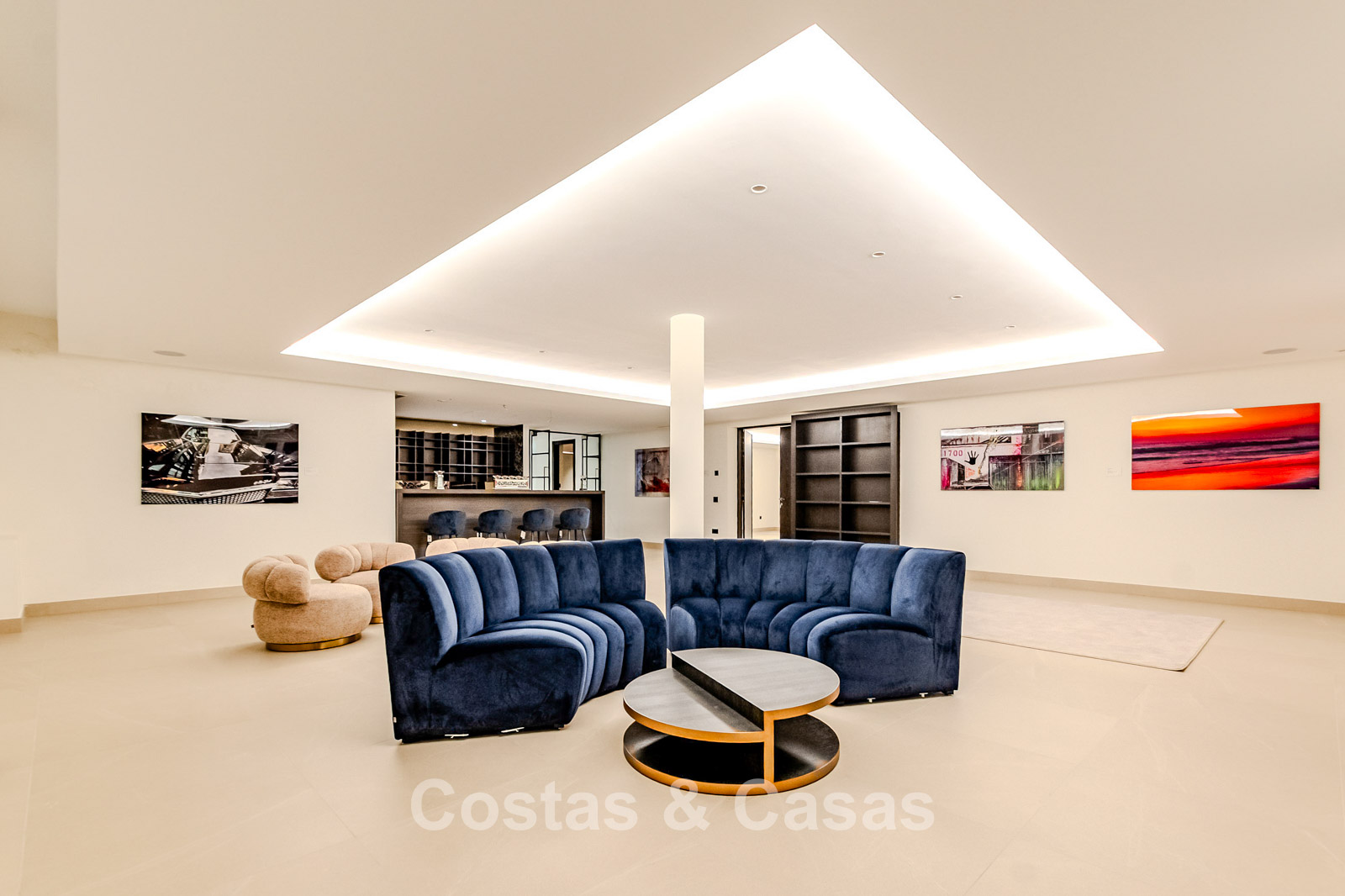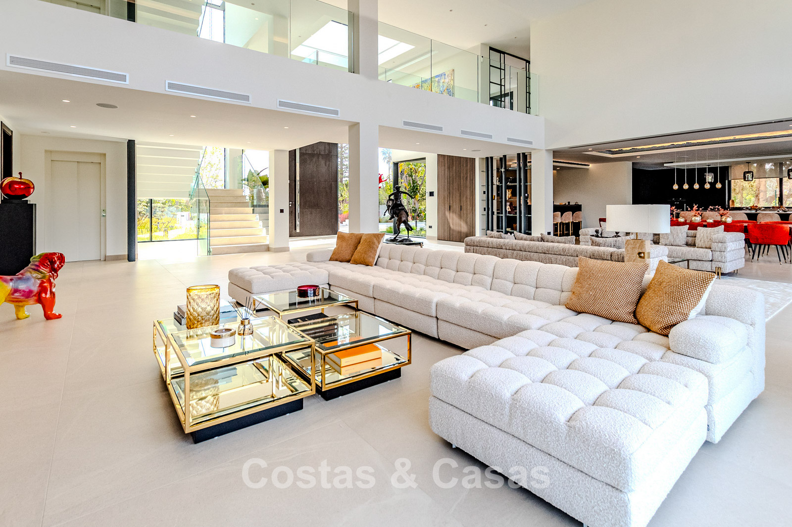 La villa présente un design moderne aux lignes épurées, lui conférant une allure puissante et contemporaine. Conçue avec un savoir-faire d'excellence, des matériaux durables et un design sur mesure. L'entrée se fait par une impressionnante double porte d'entrée aux larges panneaux vitrés, révélant une entrée lumineuse et élégante. Des baies vitrées coulissantes, réparties sur toute la surface de la villa, créent une transition harmonieuse entre l'intérieur et l'extérieur, laissant entrer une abondante lumière naturelle. L'intérieur élégant et tendance dégage un design chic et luxueux, alliant matériaux raffinés et œuvres d'art créatives. Un spacieux séjour, avec une hauteur sous plafond de 6 mètres, combine un élégant salon TV et un second coin salon tendance. La cuisine Gaggenau, réalisée sur mesure, est entièrement équipée d'électroménagers Siemens et dispose d'un îlot central idéal pour le petit-déjeuner. Une cuisine de préparation complète est également disponible. La salle à manger intégrée comprend une grande table pour 12 personnes et un bar élégant. La villa compte 7 chambres et 8 salles de bains. Un espace bureau formel. Une cave à vin avec des placards de rangement, des réfrigérateurs en verre et un coin salon pour les dégustations. Des sols crème de grande qualité et de grande taille. Des logements pour invités ou pour le personnel disposent de leur propre cuisine. A l’étage inférieur, vous trouverez un espace multifonctionnel avec un salon TV et un bar, plusieurs salles de loisirs modulables et un sauna relaxant. Une piscine intérieure est également prévue. Buanderie. Débarras. Garage intégré pour plusieurs voitures. Parking supplémentaire sur le terrain.