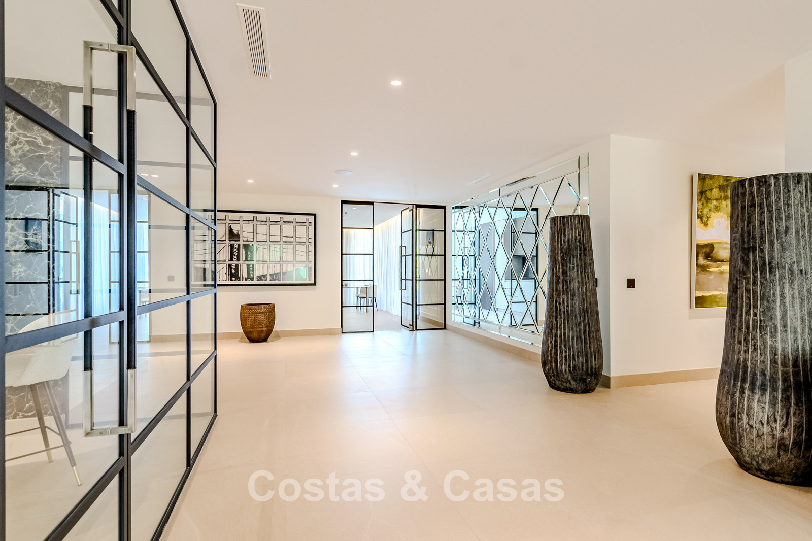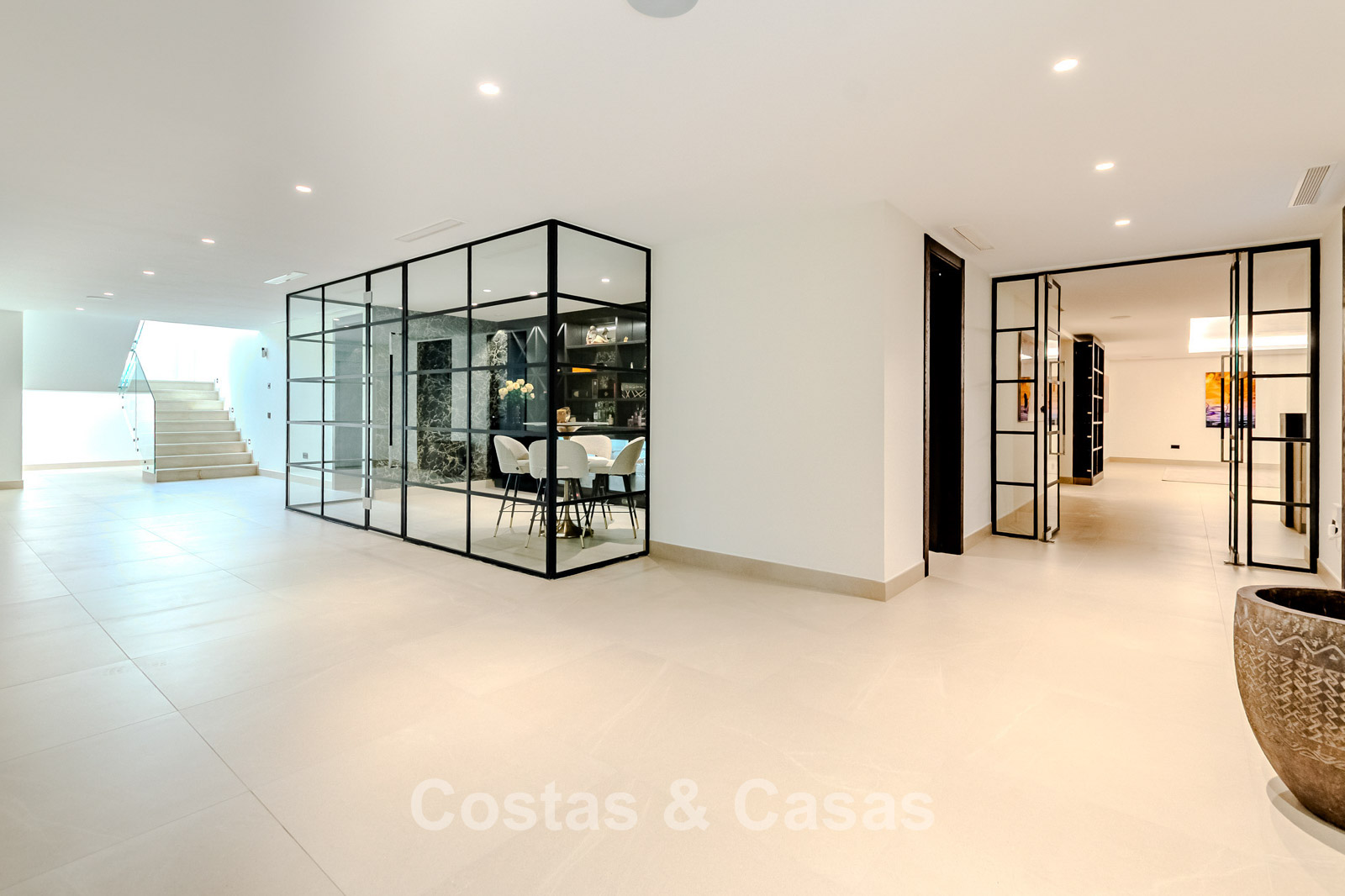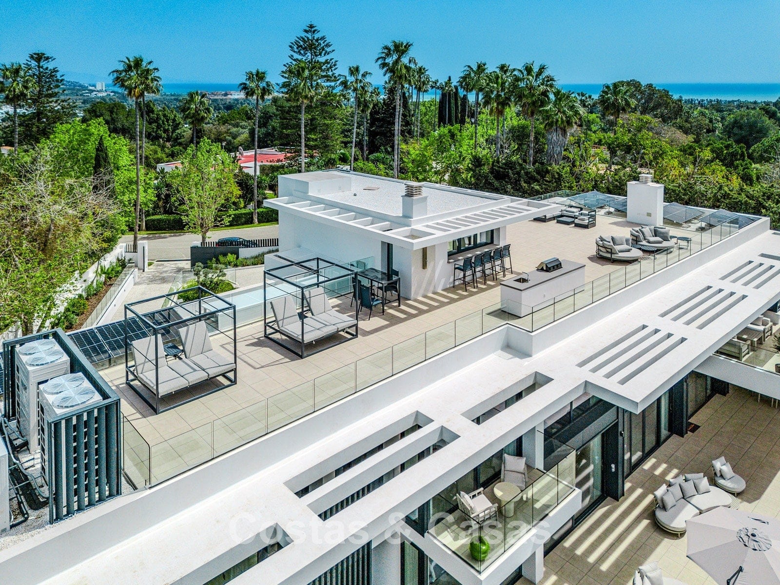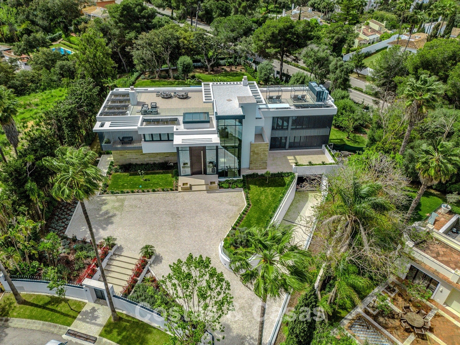 Autres caractéristiques : Ascenseur privé desservant tous les étages. Climatisation pour le refroidissement et le chauffage. Chauffage au sol. Cheminée moderne. (Plusieurs) Armoires intégrées sur mesure. Double vitrage. Balustrades en verre autour des terrasses. Éclairage LED intérieur et extérieur. Panneaux solaires. Système d'alarme avec caméras de vidéosurveillance.