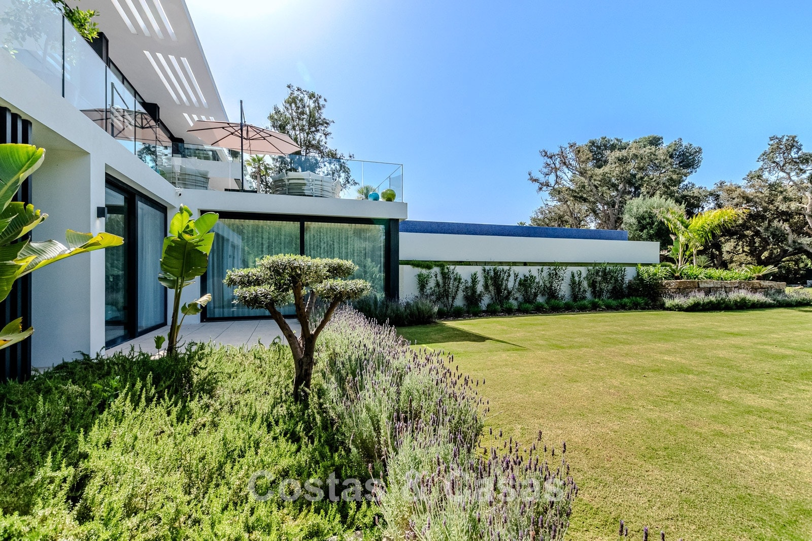 Vaste terrain de près de 4 000 m², entièrement entouré de hautes plantations. Aménagement paysager de qualité, avec conifères méditerranéens et vaste pelouse, en harmonie avec le paysage. Une spectaculaire piscine à débordement avec terrasse ensoleillée attenante et chaises longues. Cuisine extérieure avec barbecue intégré. Immense toit-terrasse avec espaces détente, deuxième cuisine extérieure avec barbecue et bar pour recevoir. Orientation sud. Vue panoramique sur les environs verdoyants.