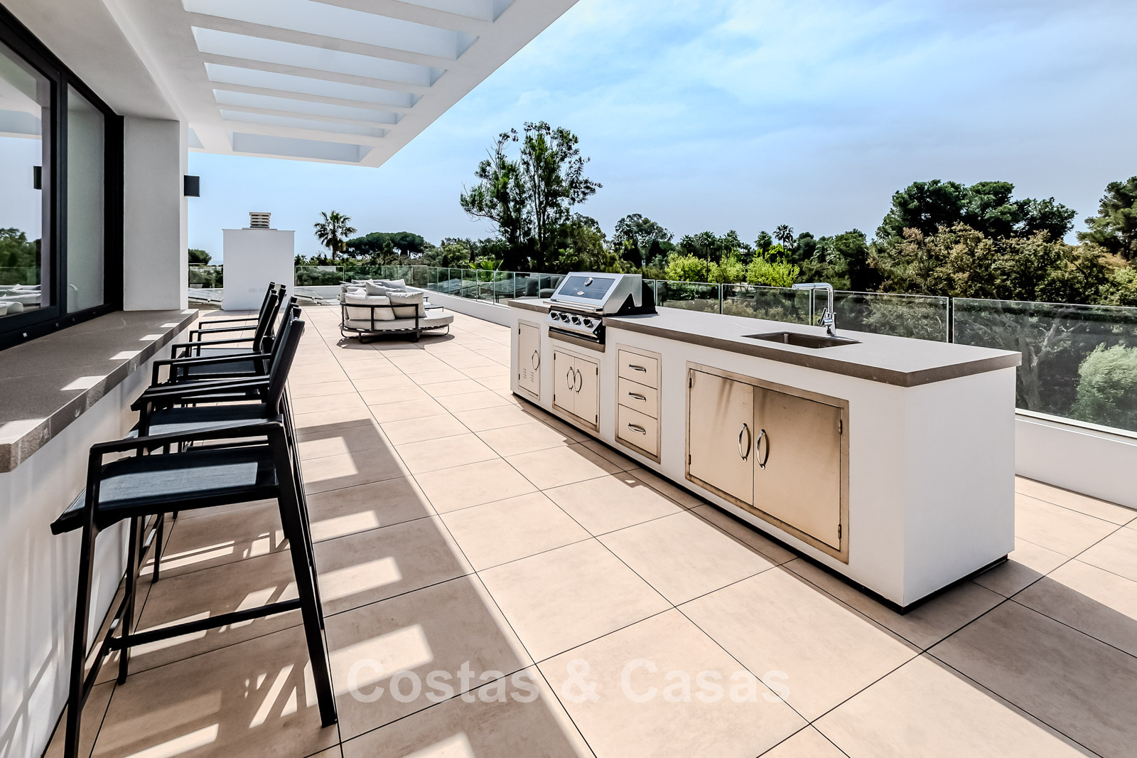 Grande terrasse sur le toit avec cuisine extérieure.