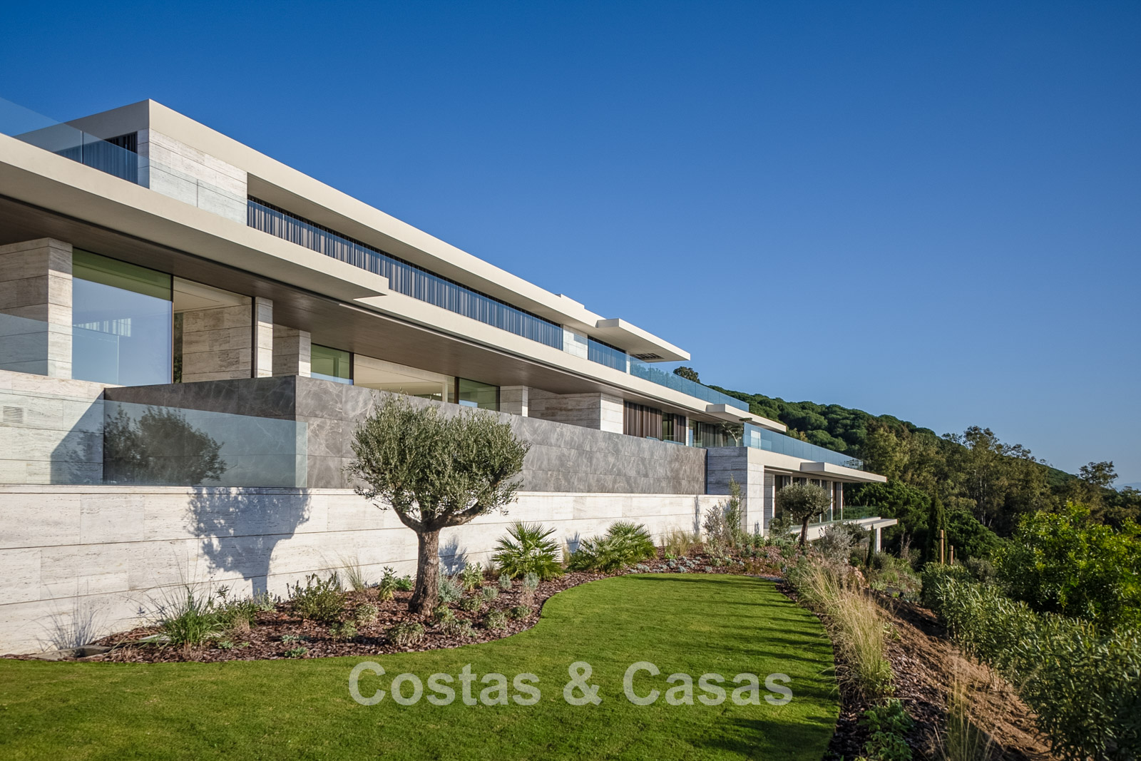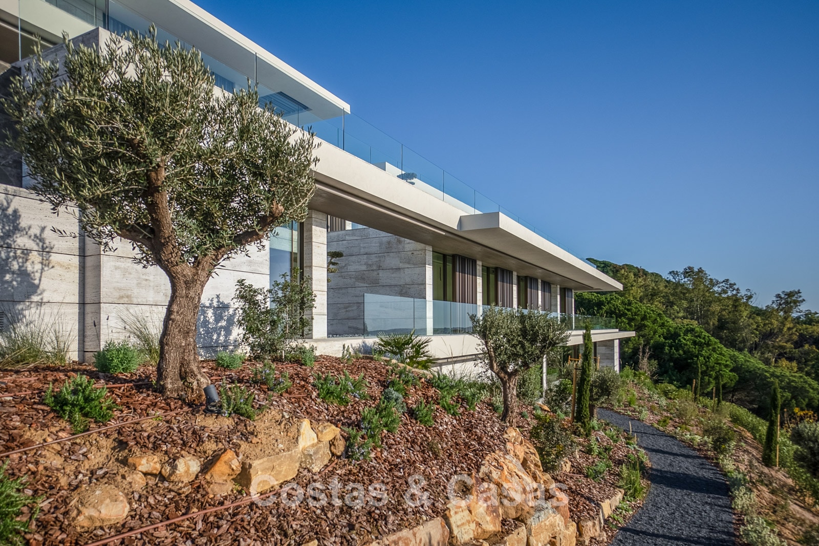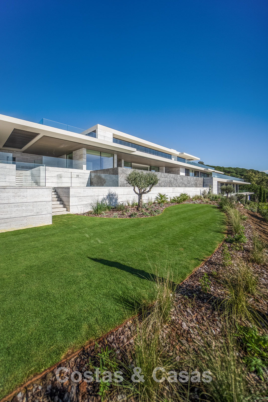 Terrain : 4 405 m² Surface construite : 2 338 m² Surface intérieure : 1 770 m² Superficie de la terrasse couverte : 395 m² Superficie de la terrasse ouverte : 759 m² Allée : 460 m² Plateformes de jardin et murs de soutènement : 800 m² Chambres : 7 Salles de bain : 7 Piscine à débordement : 25 mètres 3 étages + entrée
