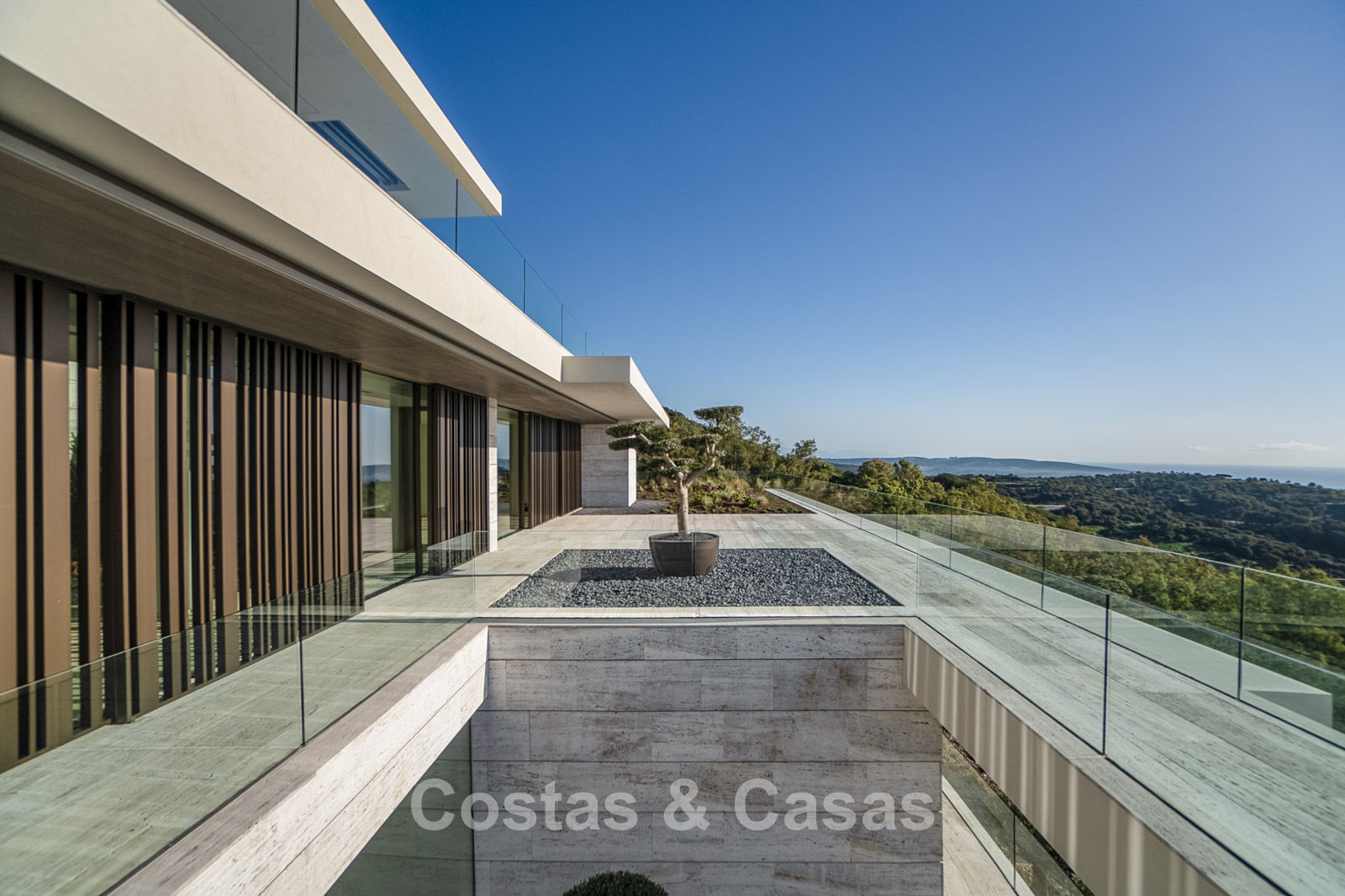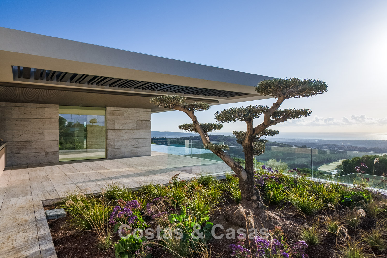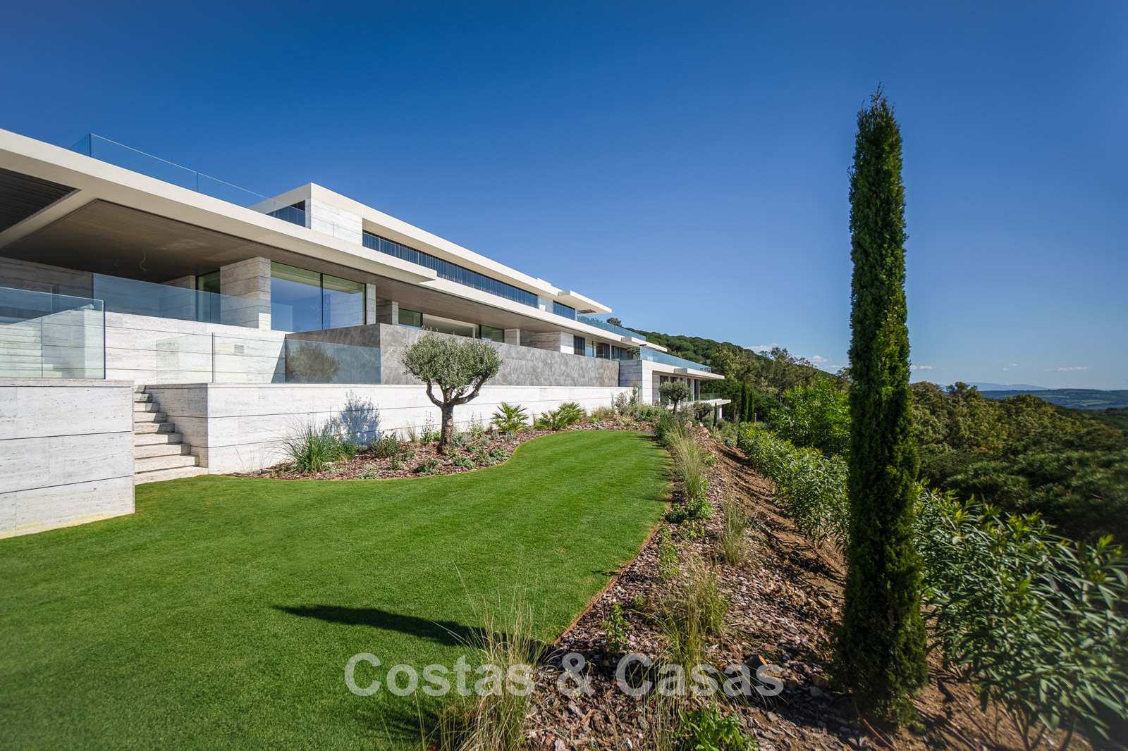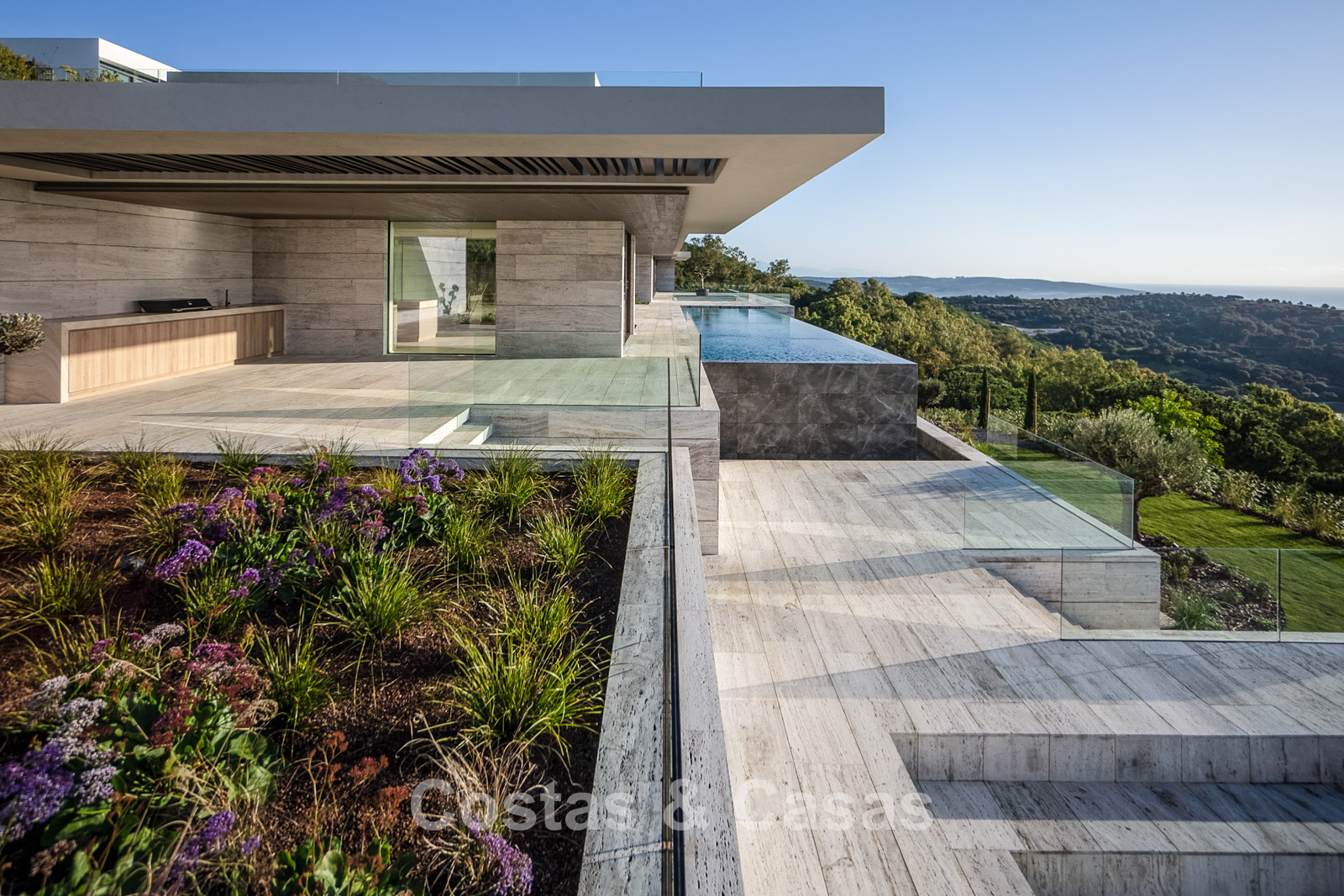 Vaste terrain de près de 4 500 m² situé en hauteur. Le jardin paysager est un chef-d'œuvre architectural, avec ses plantes tropicales soigneusement aménagées et sa pelouse. Spectaculaire piscine à débordement de 25 mètres avec terrasses ensoleillées adjacentes. De grandes terrasses ouvertes et couvertes offrent un vaste espace de détente et de restauration. Vue panoramique imprenable sur les parcours de golf et le littoral, jusqu'à Gibraltar, l'Afrique et la mer Méditerranée.