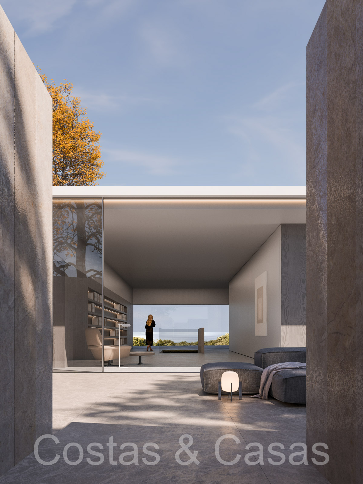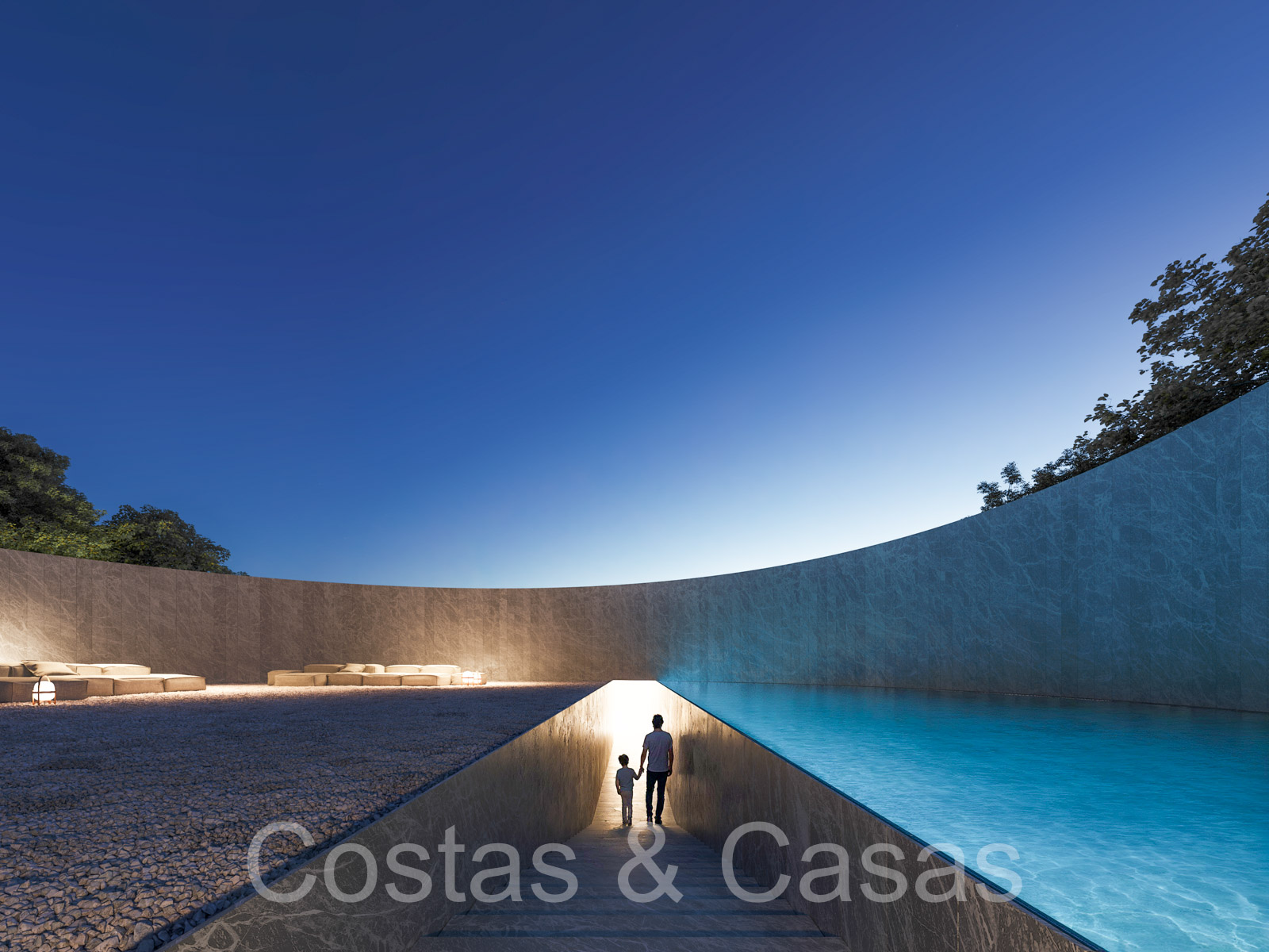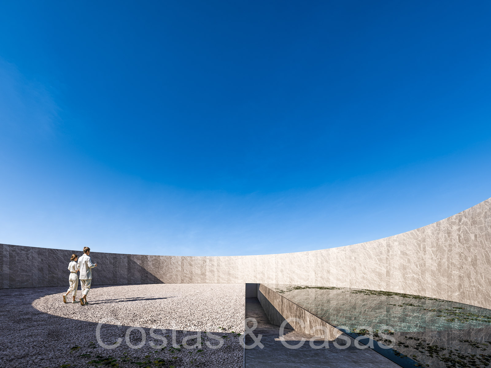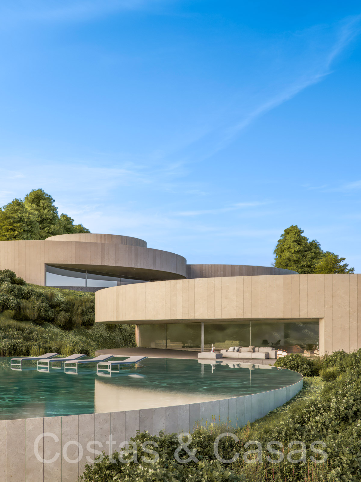 Terrain spacieux de 4 502 m² niché dans une enclave verdoyante. Piscine circulaire spectaculaire avec chaises longues intégrée. Terrasses ouvertes et couvertes équipées d'installations chillout. Vues panoramiques sur le golf, une plage privée, la mer Méditerranée et la côte nord de l'Afrique.