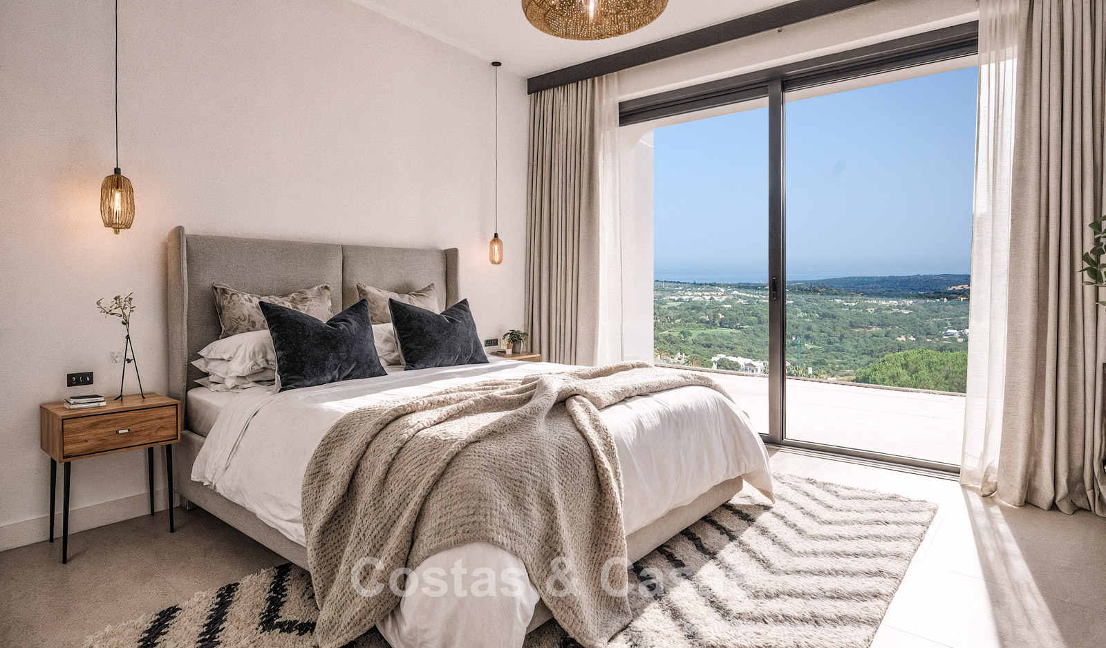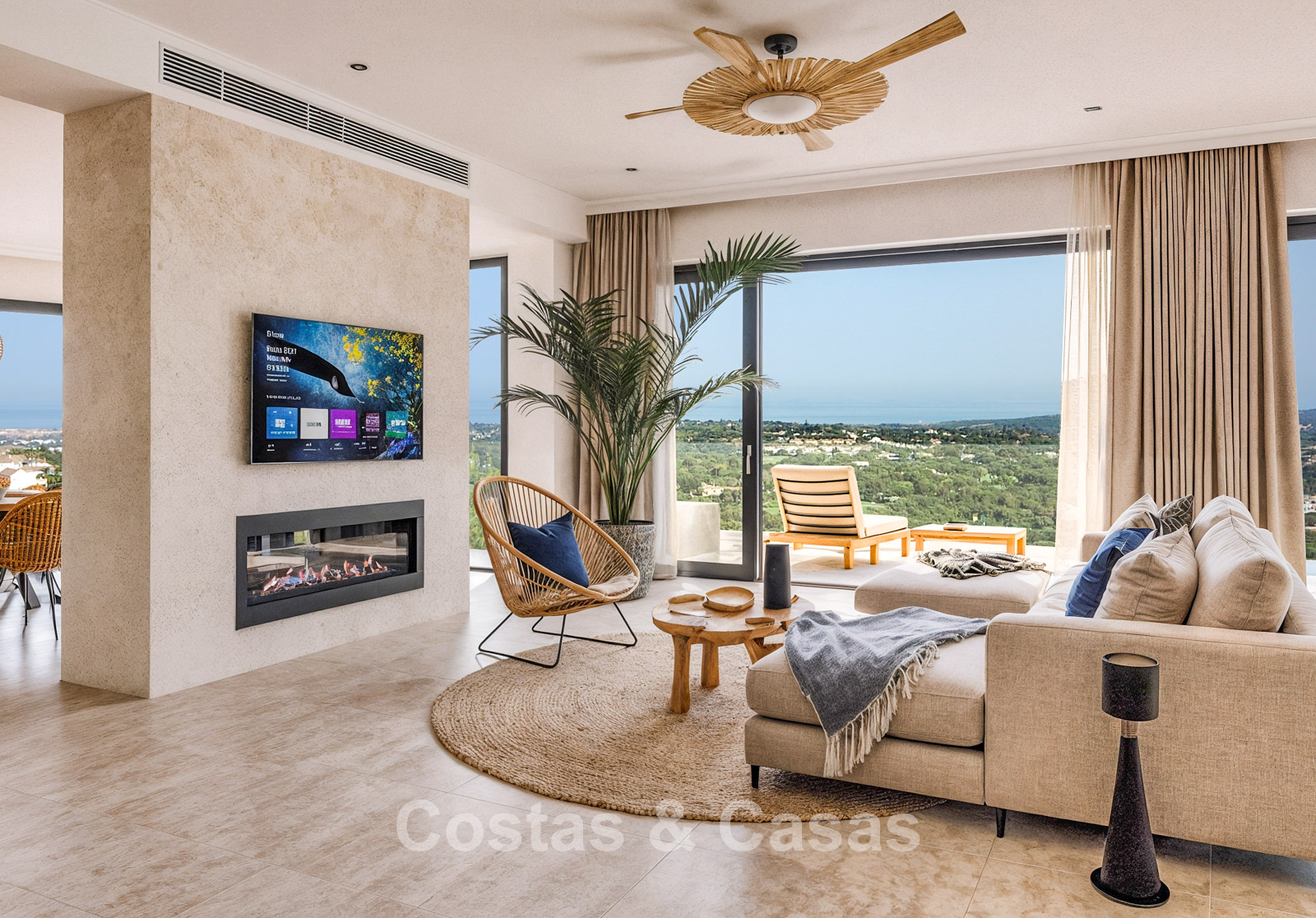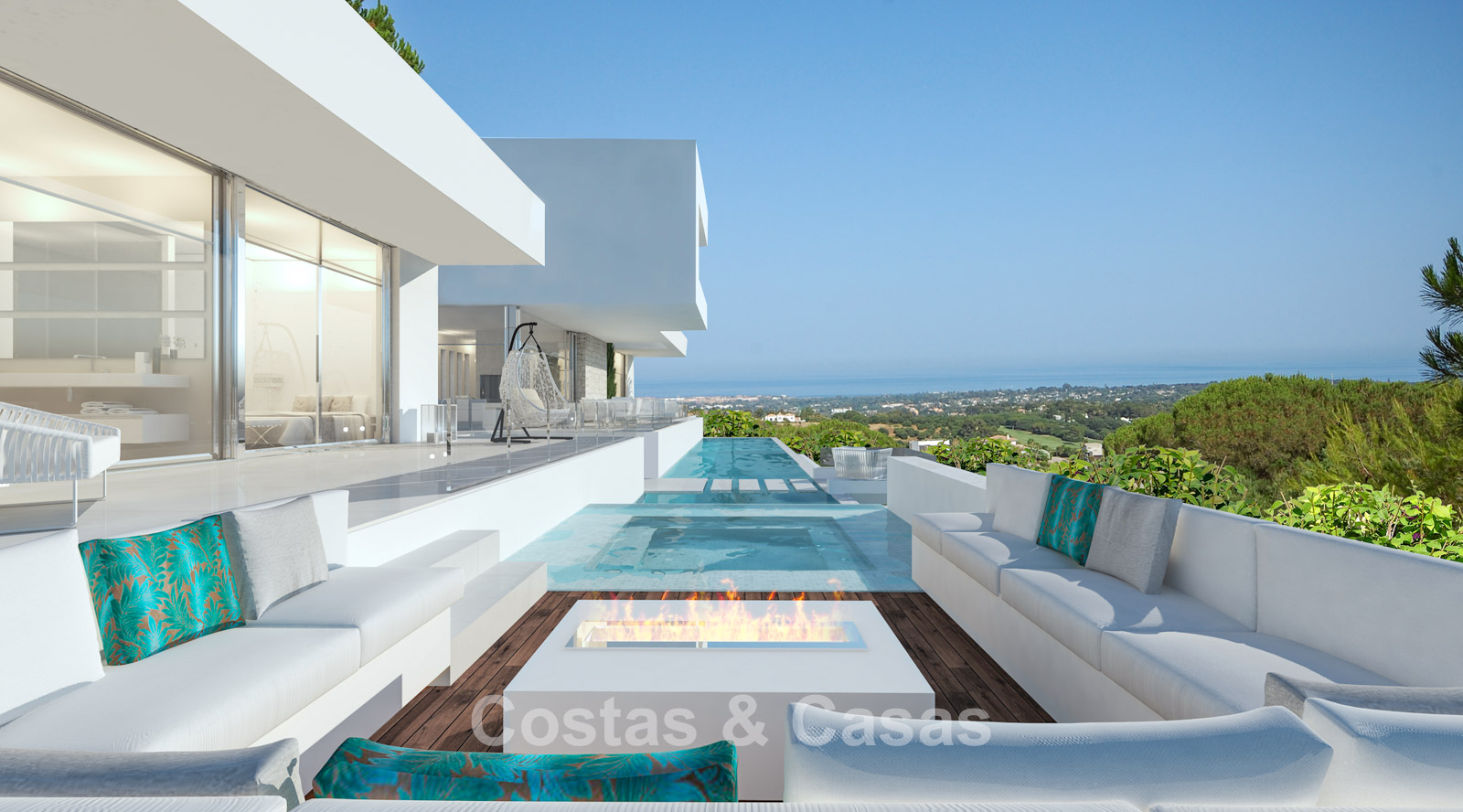 Vaste terrain en position élevée. Extérieur magnifiquement aménagé avec une généreuse piscine à débordement intégrée, un jacuzzi intégré adjacent et un espace détente en contrebas. De vastes terrasses permettent de profiter du climat méditerranéen. Orientation sud. Vue panoramique sur la vallée du golf et la mer Méditerranée.