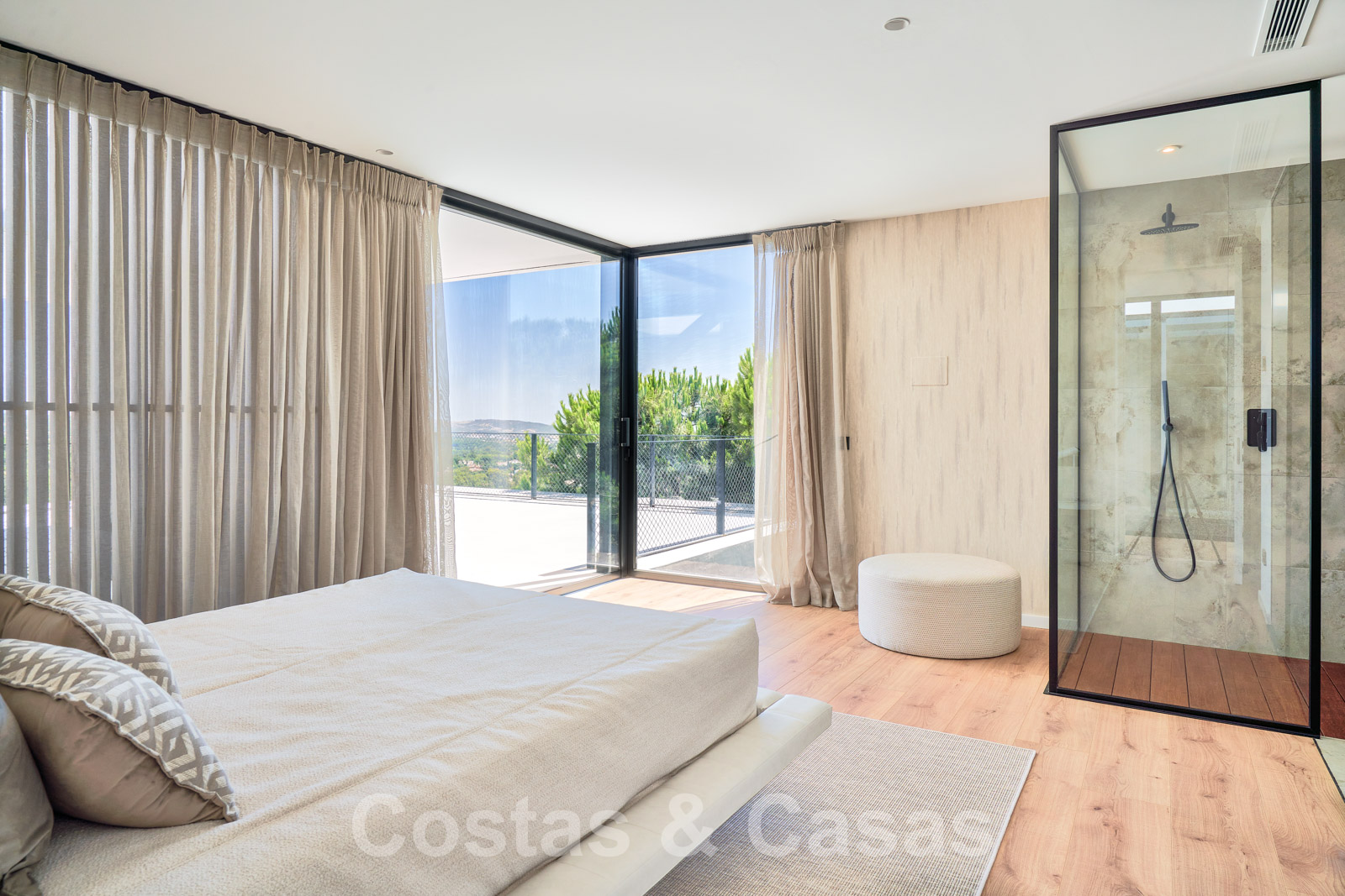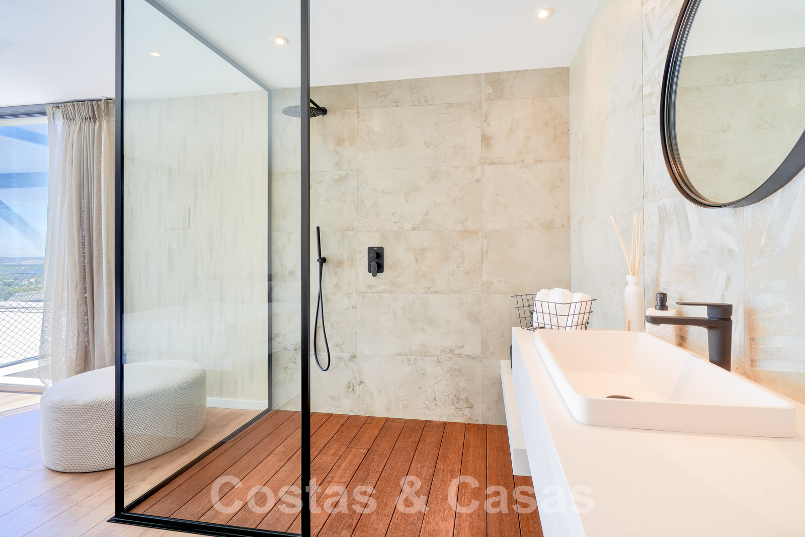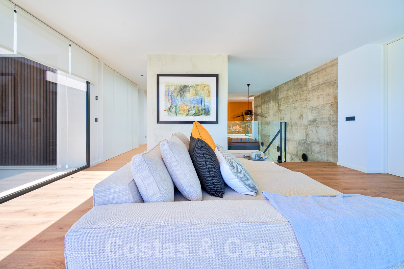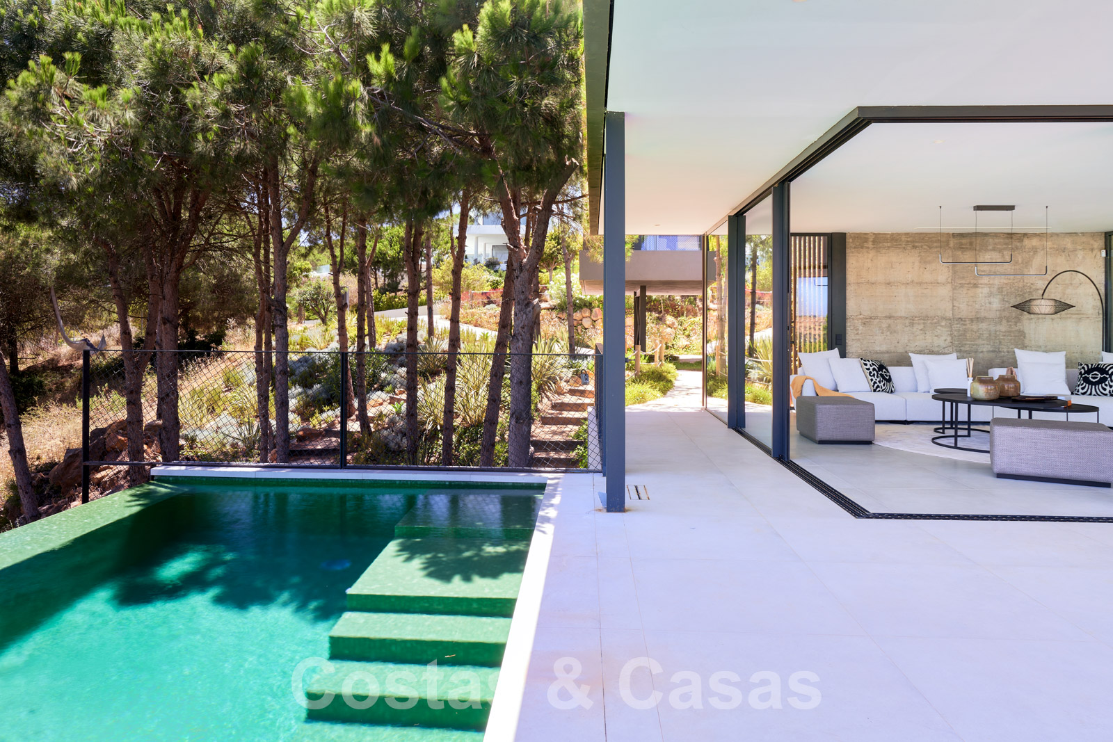 Terrain spacieux dans un environnement calme et naturel, entouré d'une forêt de pins matures, offrant l'intimité nécessaire. L'étage principal est surélevé et offre une vaste terrasse flottante qui s'intègre subtilement à la verdure environnante grâce à son caractère. Grande piscine à débordement. Superbe vue panoramique sur la vallée, le terrain de golf et le paysage montagneux en direction de la mer.