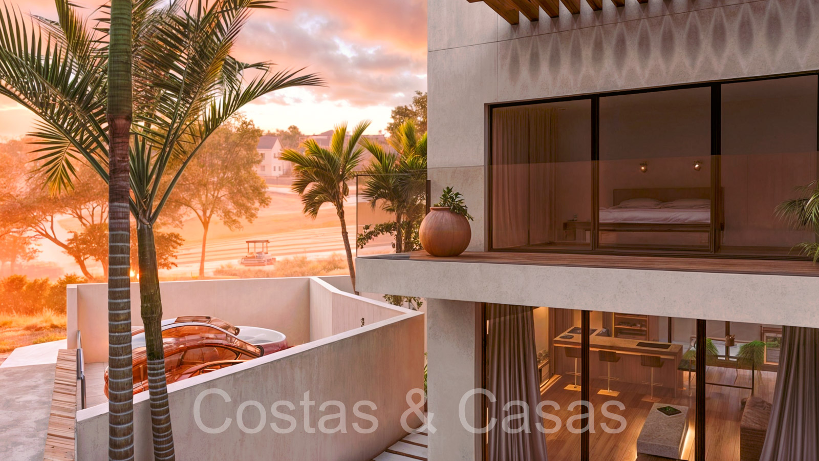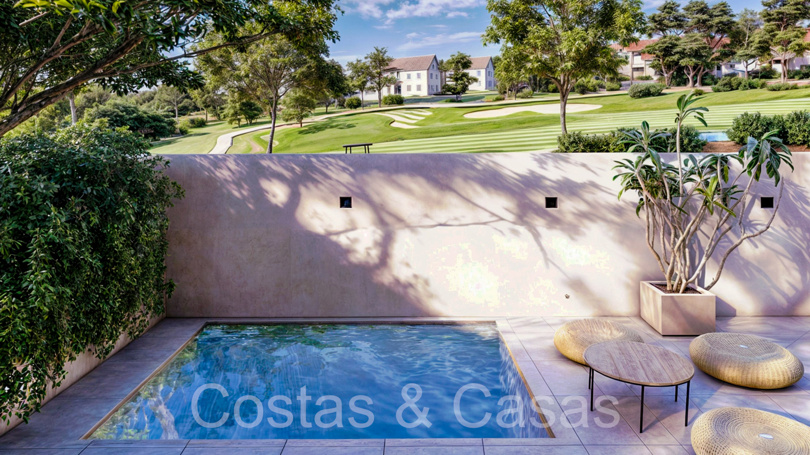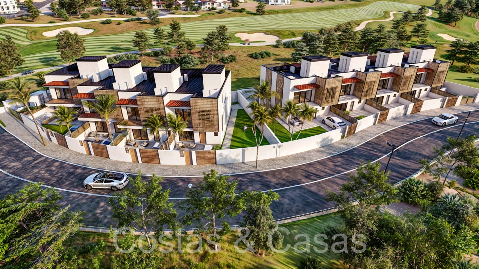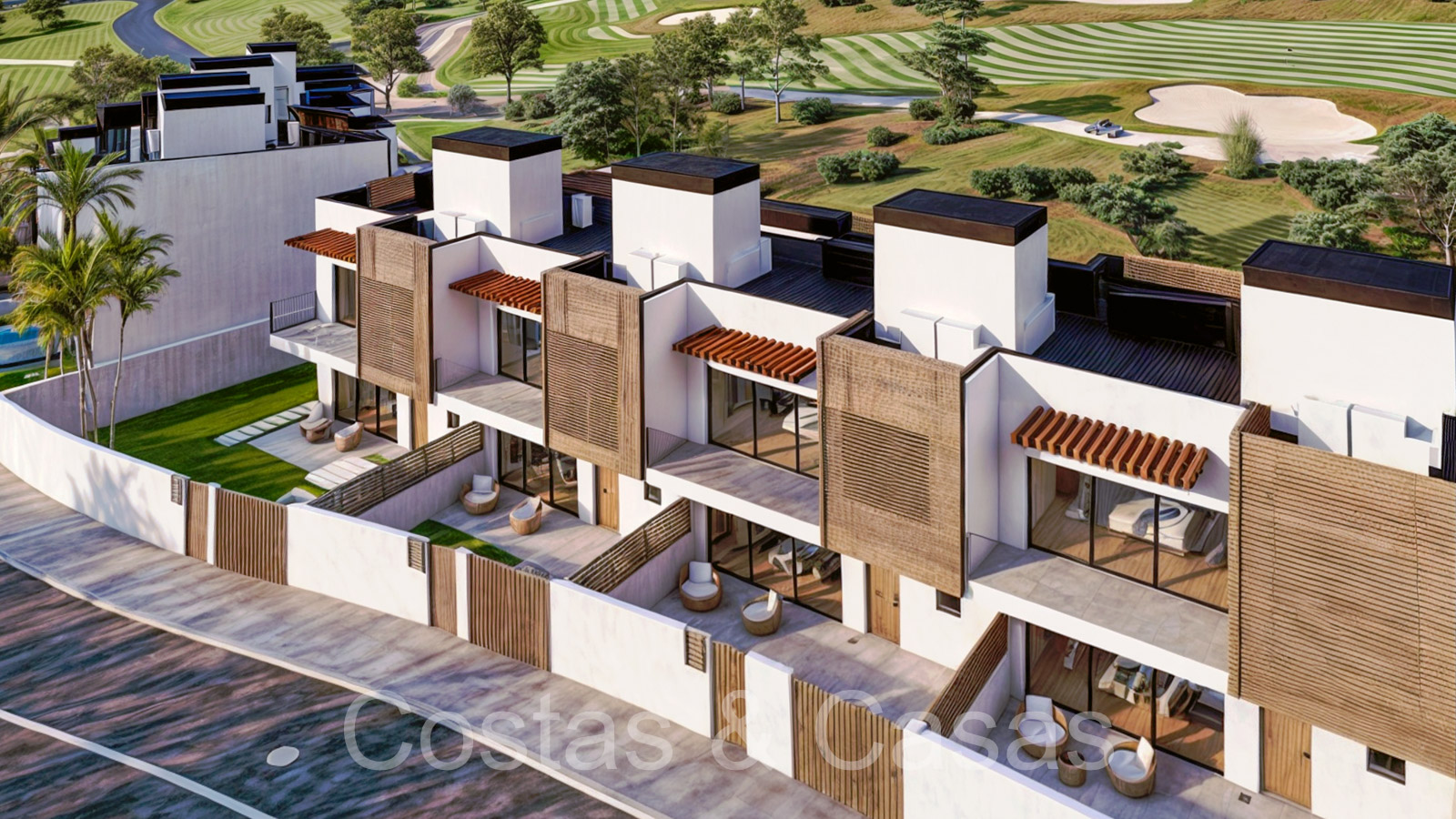 Collection de nouvelles maisons de ville adjacentes aux golfs. Soigneusement conçu avec une attention aux énergies économes en énergie. Chaque maison bénéficie d'un jardin privatif clos avec éventuellement une piscine. Depuis le solarium, vous pourrez profiter de vues spectaculaires sur les terrains de golf. De hautes fenêtres coulissantes s'ouvrent sur les espaces extérieurs et génèrent également beaucoup de lumière naturelle. Espace de vie ouvert. Cuisine ouverte, entièrement équipée avec des électroménagers haut de gamme et un îlot. 3 chambres, 3 salles de bains. L’étage inférieur peut être librement aménagé avec un man cave ou un home cinéma. Parking privé dans votre propre allée.