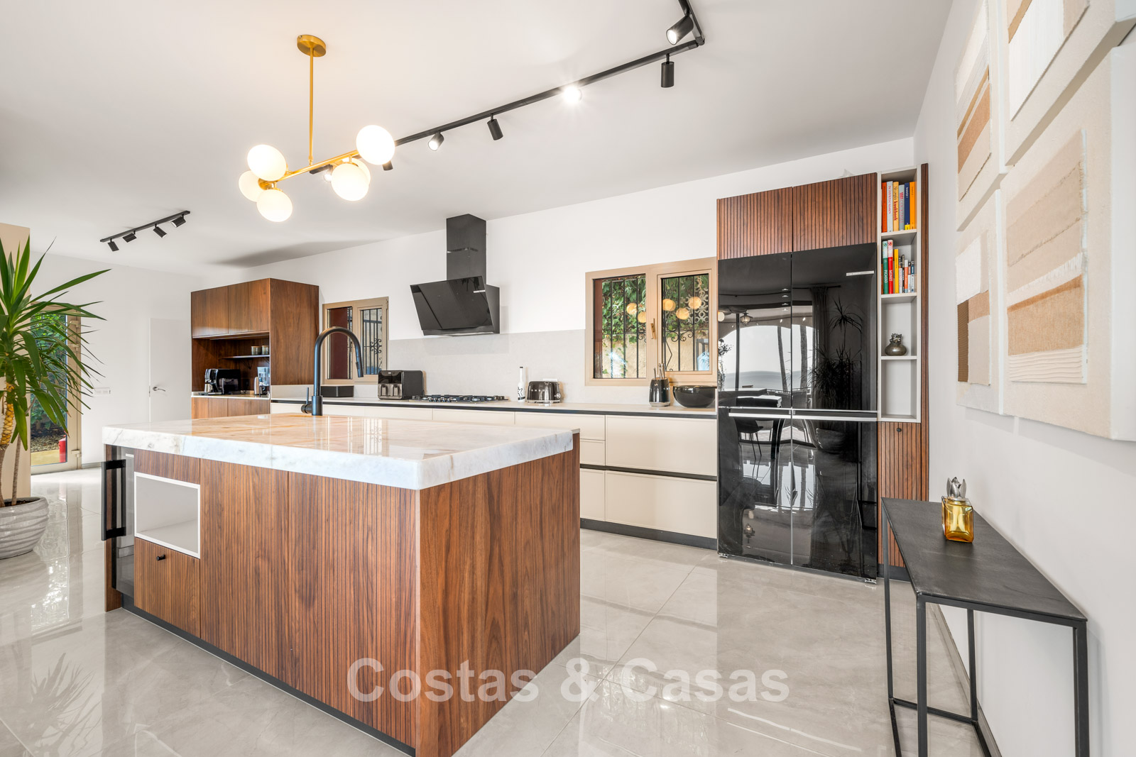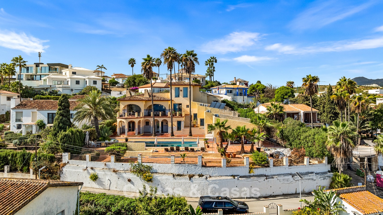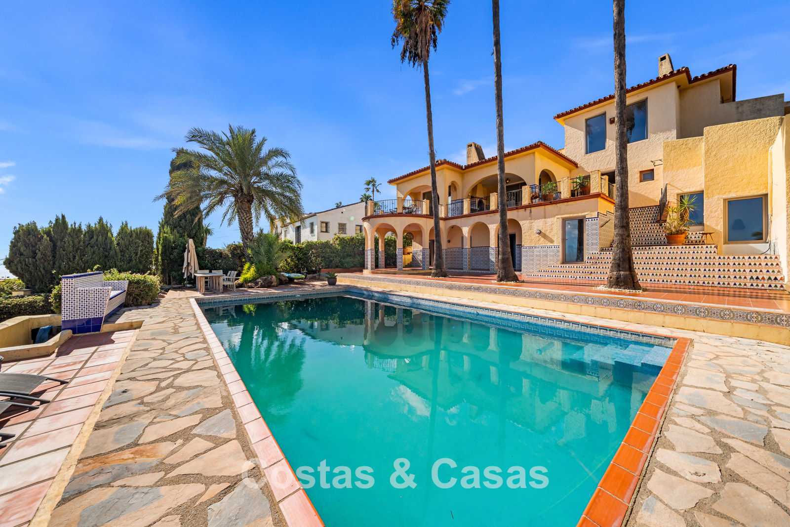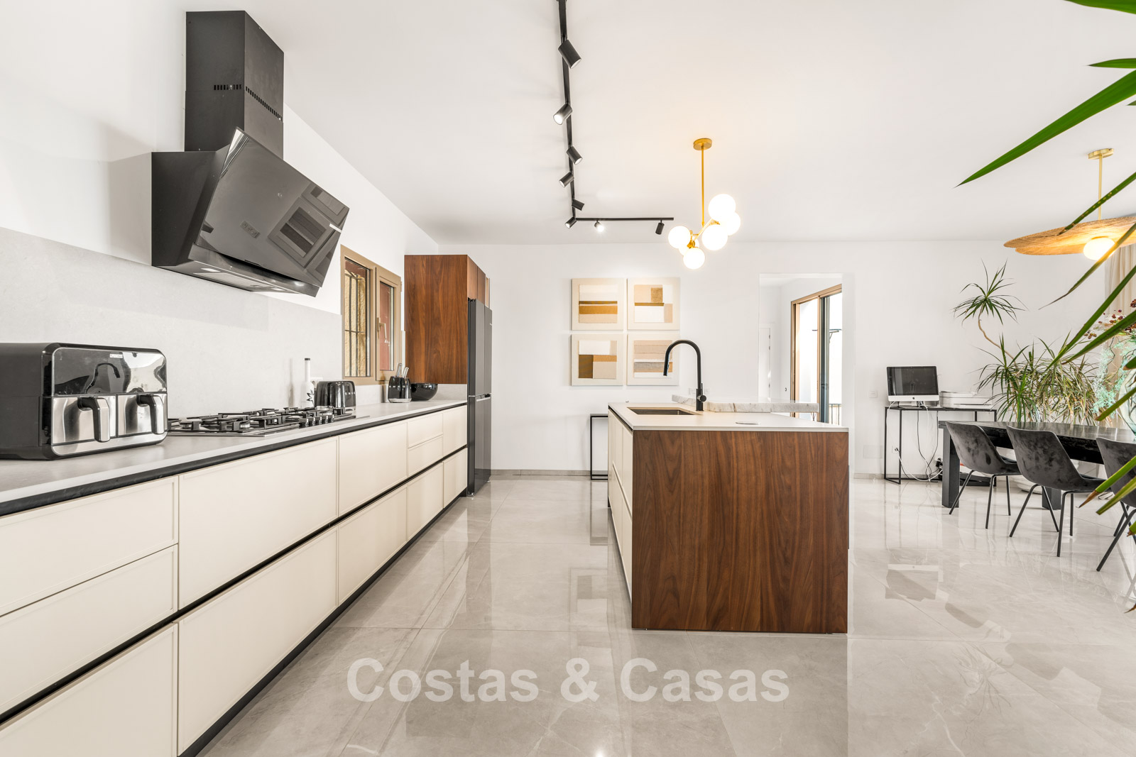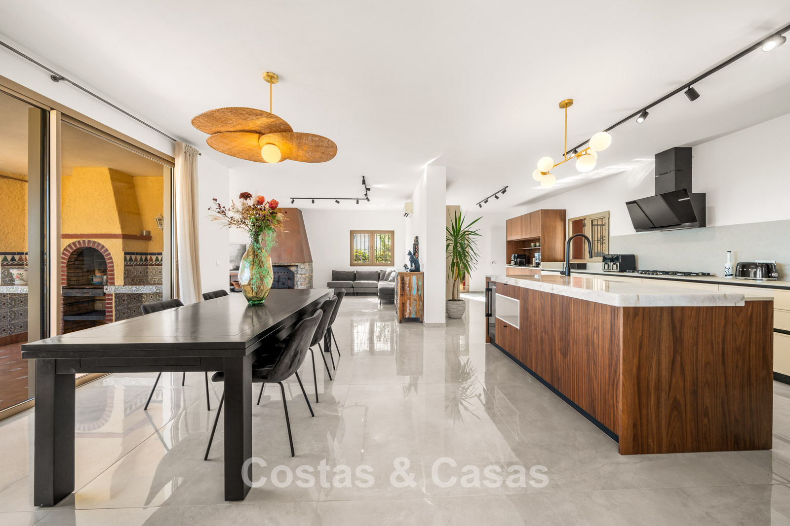 Villa individuelle spacieuse de style andalou authentique, rehaussée de subtiles touches scandinaves à l'intérieur. Utilisation de matériaux naturels. Intérieur lumineux et aéré avec un agencement ouvert. Espace de vie ouvert avec une cheminée. Coin repas intégré. Cuisine ouverte moderne avec un grand îlot central, doté d'un plan de travail coulissant qui le transforme en espace repas ou de travail. 7 chambres, 6 salles de bains et une toilette séparée. Grand carrelage brillant au sol avec une subtile texture marbrée. Buanderie. Garage intégré.