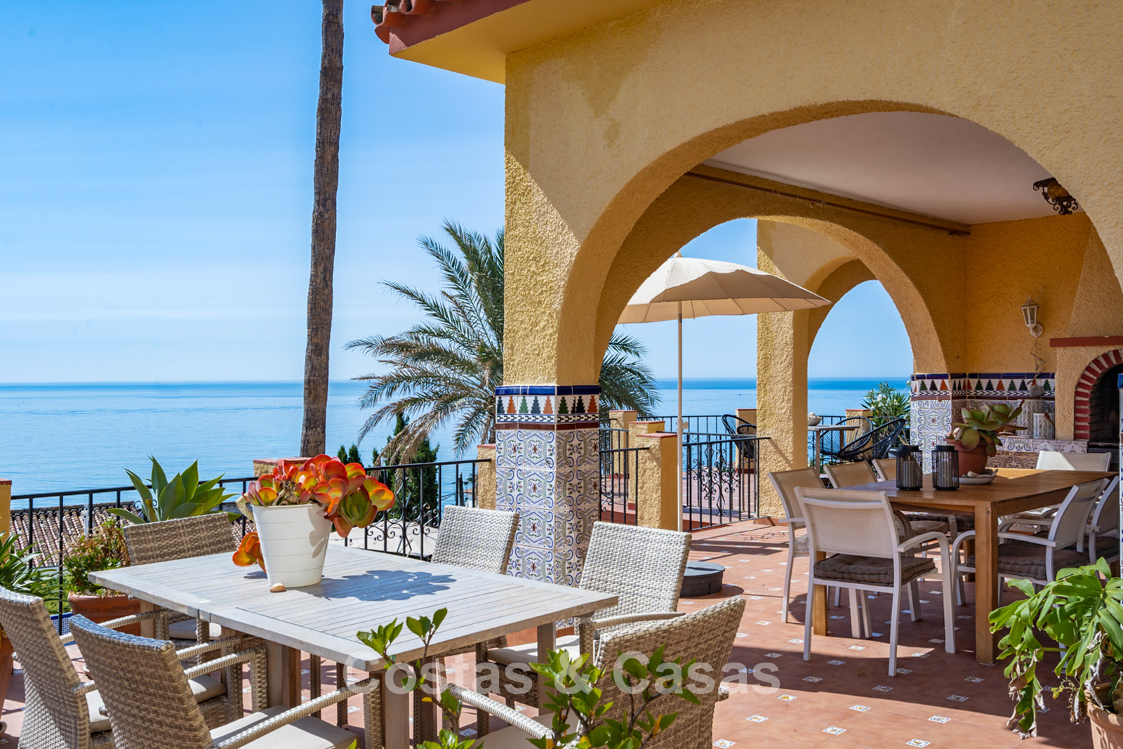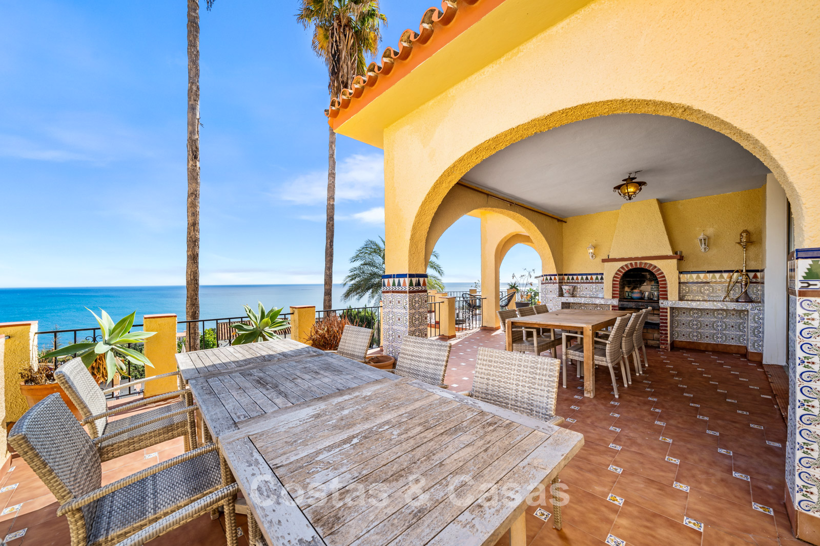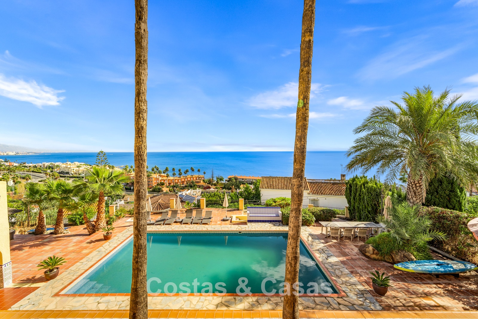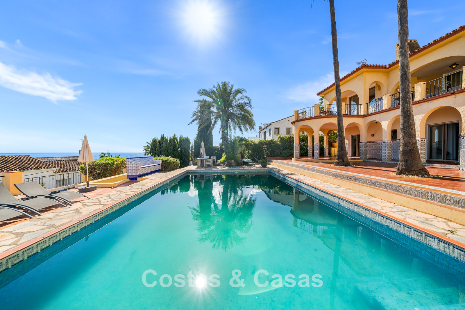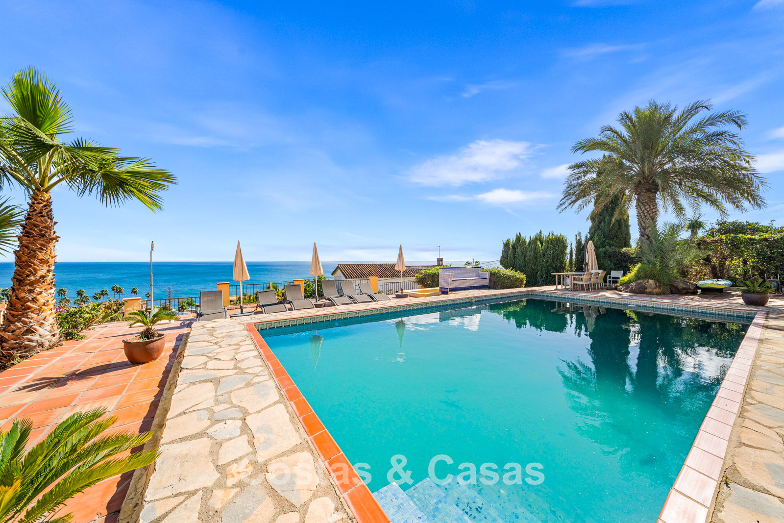 Vaste terrain surélevé, entouré de verdure. Piscine entourée de grandes terrasses ensoleillées. La terrasse couverte et accueillante, avec sa cuisine extérieure et son coin repas convivial, est idéale pour se détendre. Orientation sud. Vue panoramique imprenable sur la mer Méditerranée.