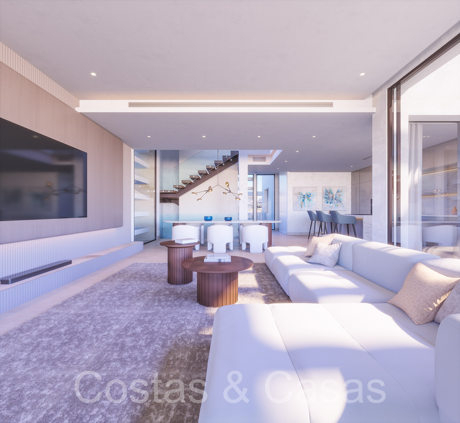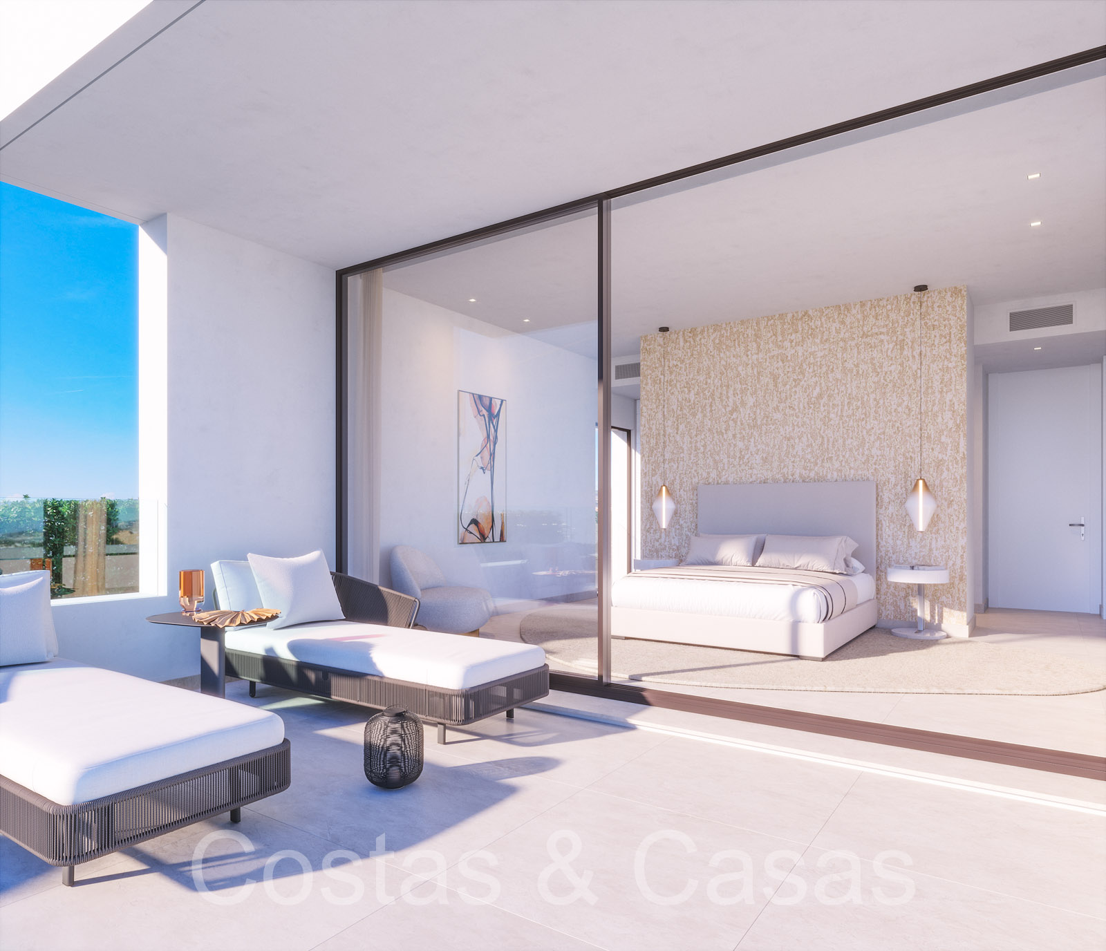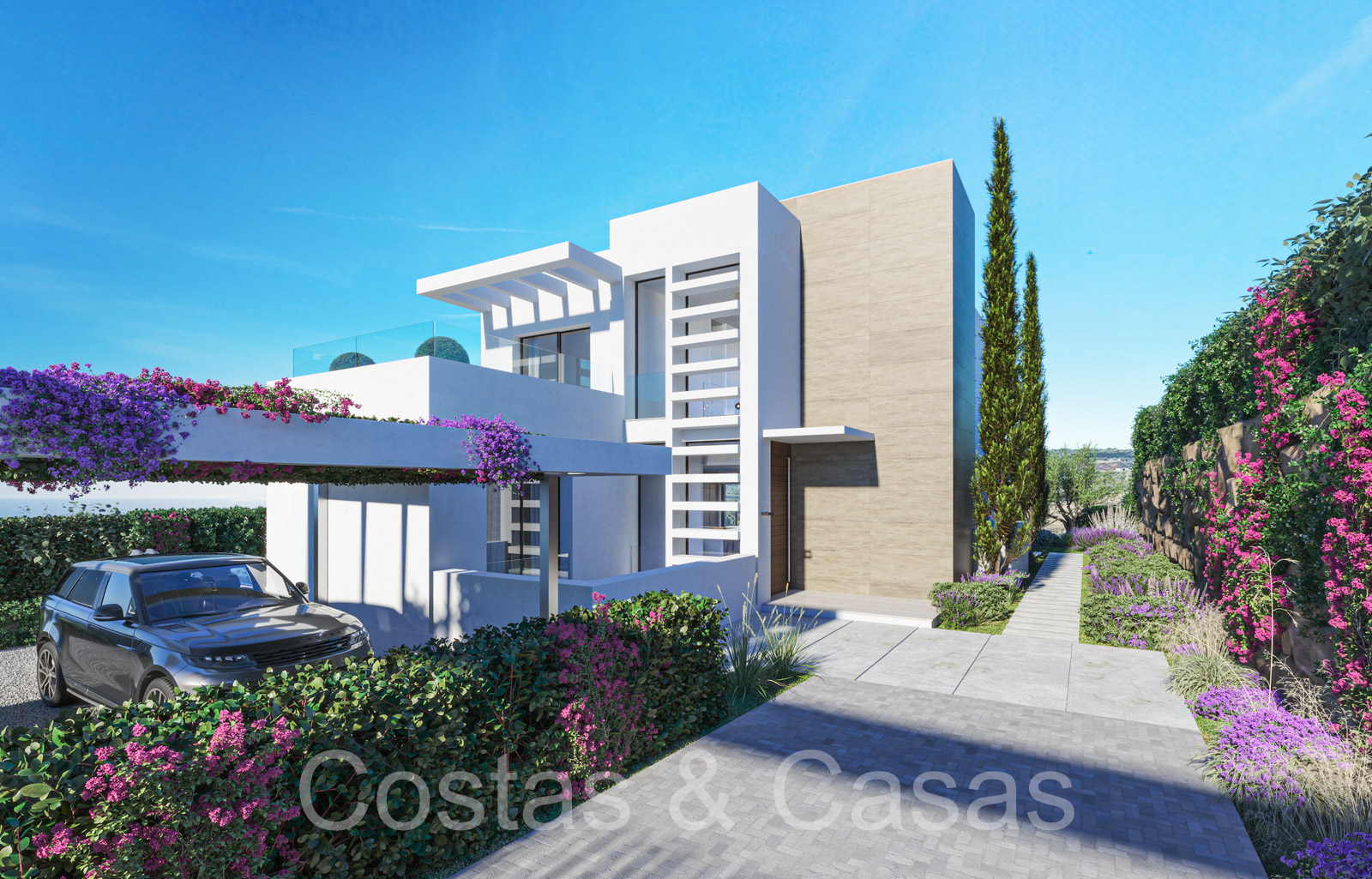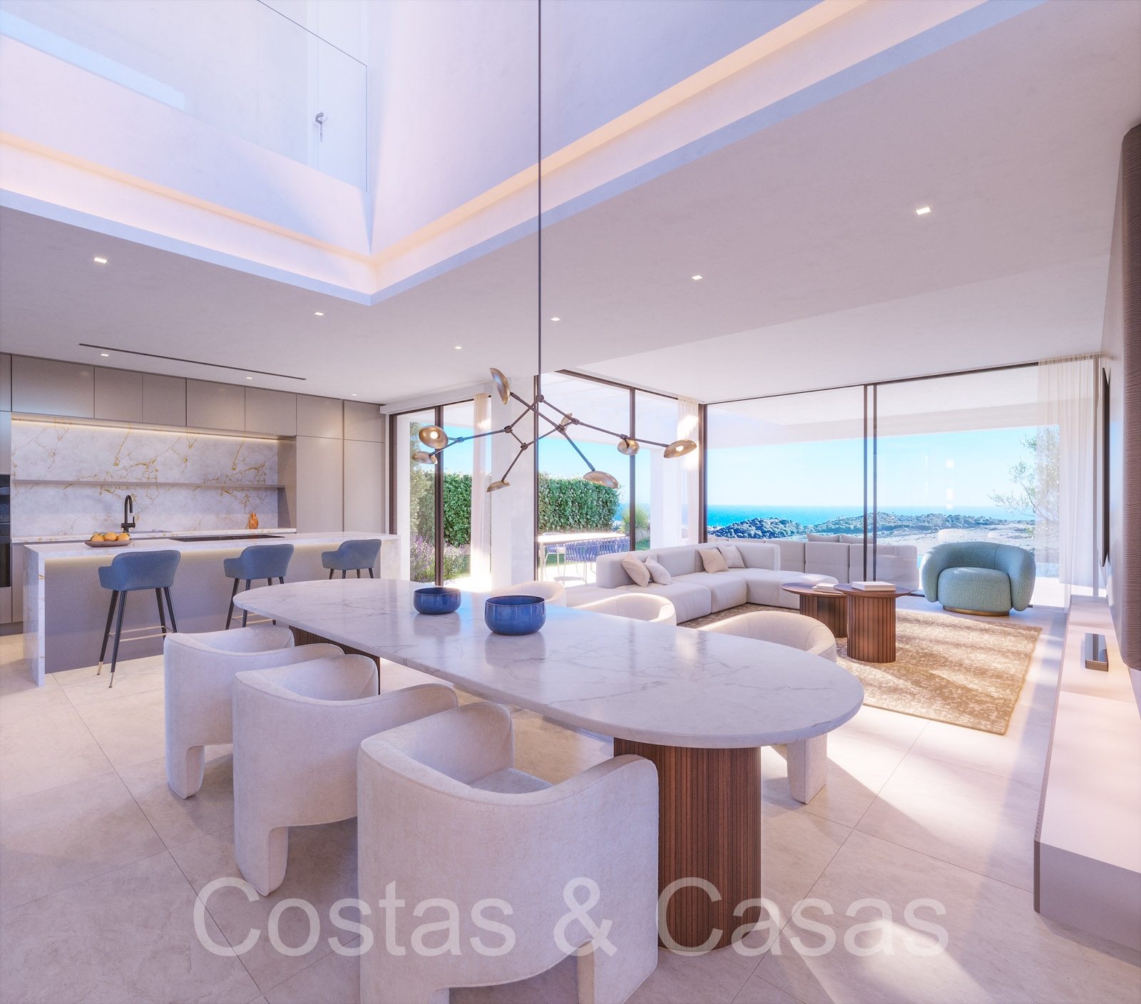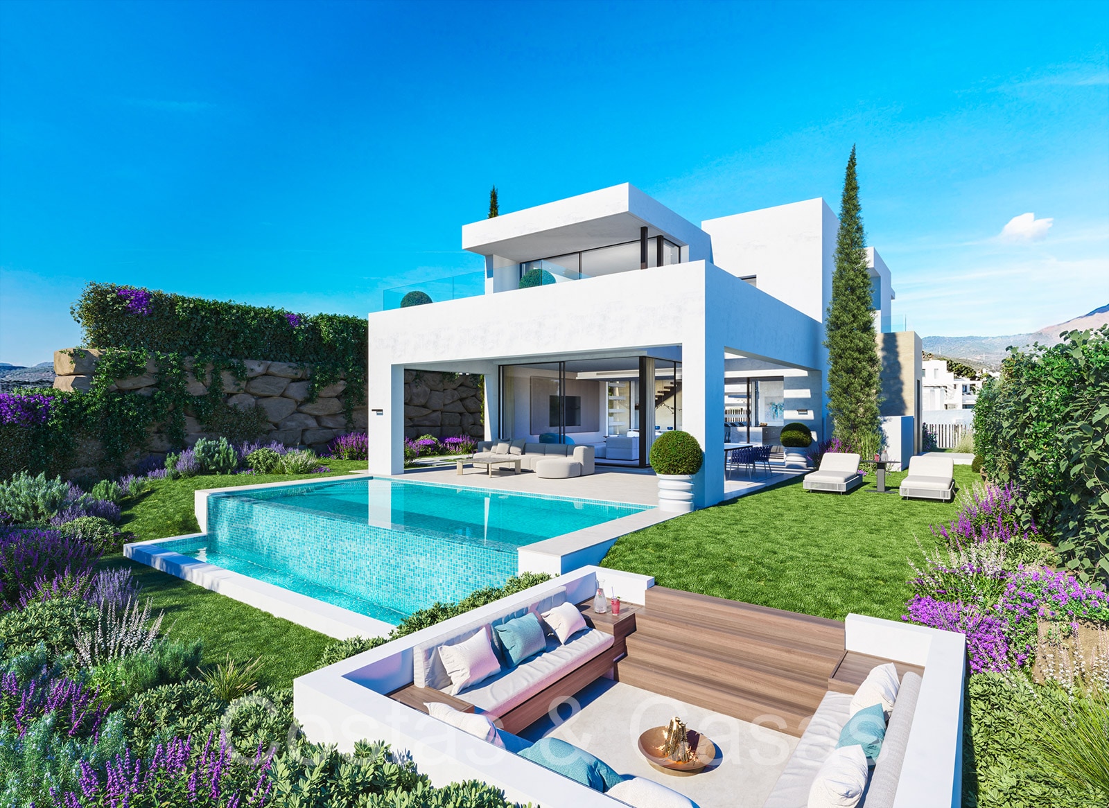 Un projet composé d'une collection de 10 villas individuelles et modernes de nouvelle construction. Construit avec des lignes épurées, beaucoup de verre et des espaces ouverts. Les villas sont situées dans une position surélevée, à côté du terrain de golf. Jardins paysagers bien entretenus avec pelouse et parterres de fleurs. Une piscine à débordement avec une terrasse ensoleillée adjacente et un lounge en contrebas. Intérieur contemporain et lumineux. De hautes fenêtres coulissantes avec profils encastrés laissent entrer beaucoup de lumière du jour et permettent également d'accéder à l'espace extérieur. Les villas donnent sur le parcours de golf et la mer Méditerranée. Espace de vie ouvert avec salon et coin repas intégré. Spacieux 3 chambres, 3 salles de bains. Cuisines design italiennes avec appareils Miele. Buanderie avec électroménagers Miele.
