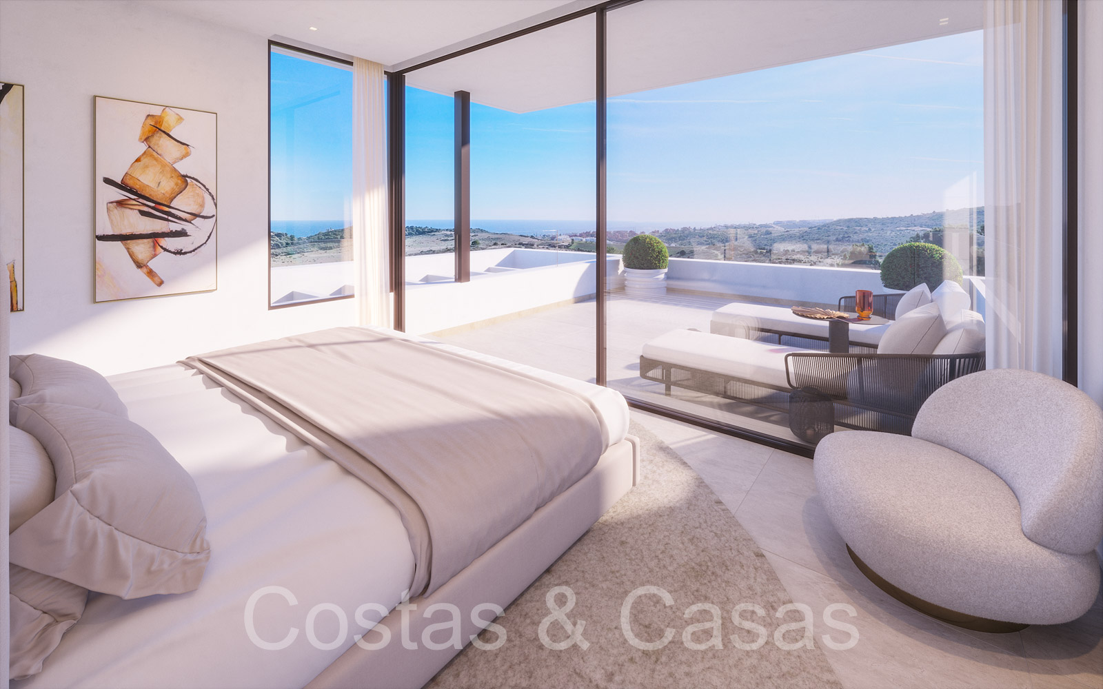Villas modernes de construction récente avec vue panoramique sur la mer, au bord d'un terrain de golf à Estepona