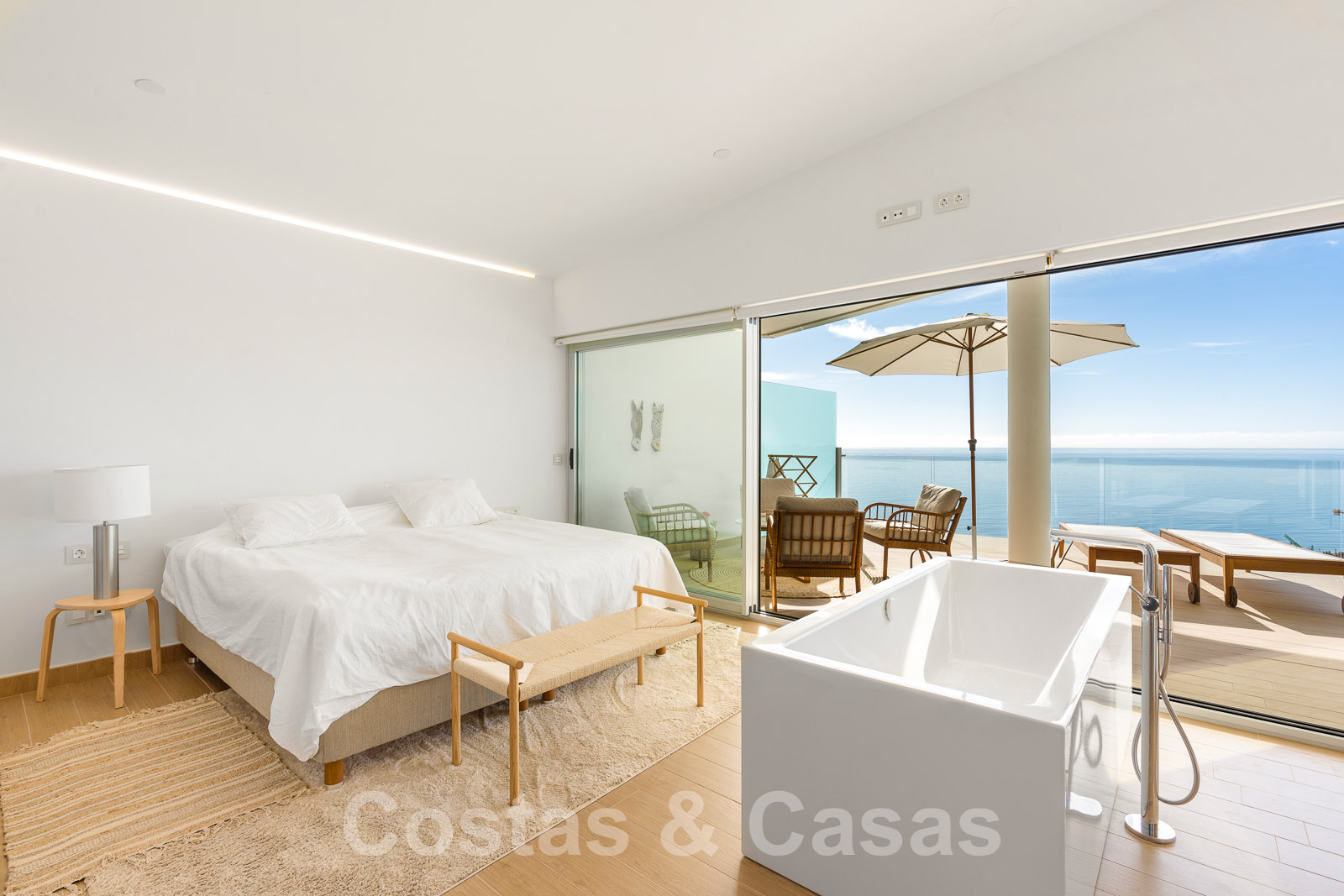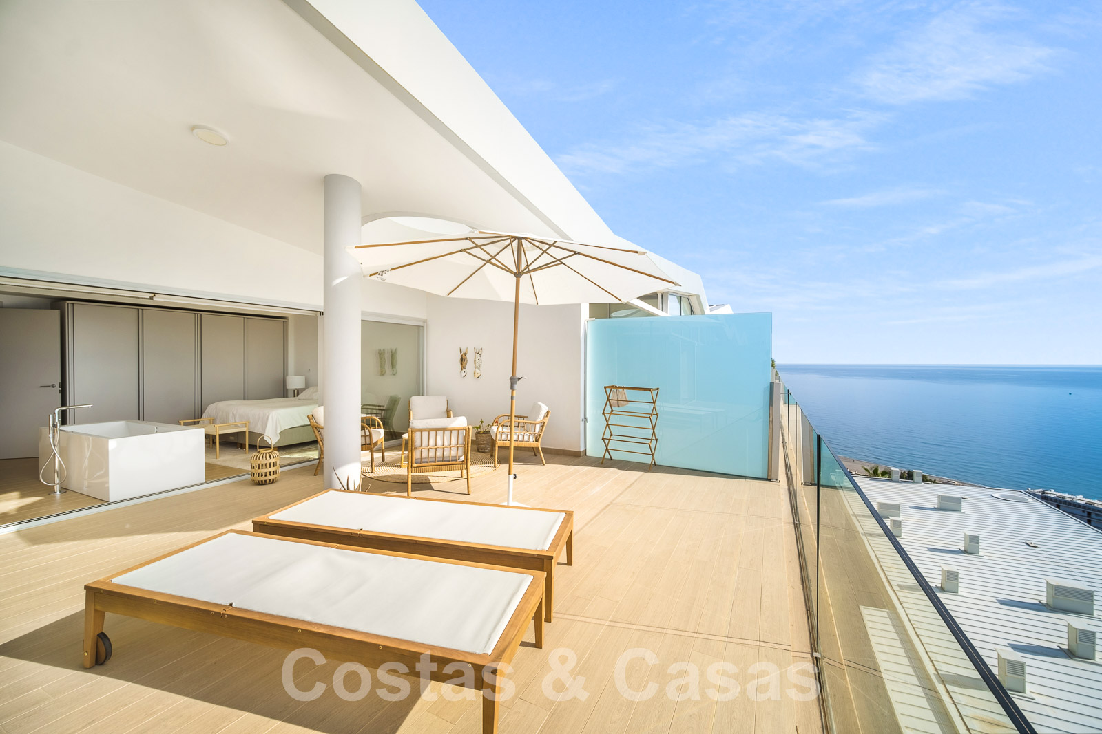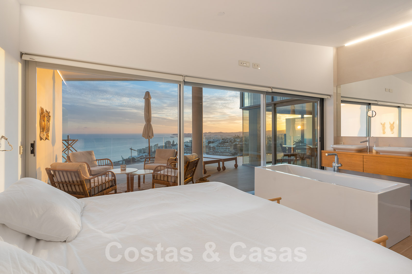 La chambre principale dispose d'une salle de bain en-suite et est attenante à la terrasse qui offre des vues incomparables sur la mer et la baie de Fuengirola.