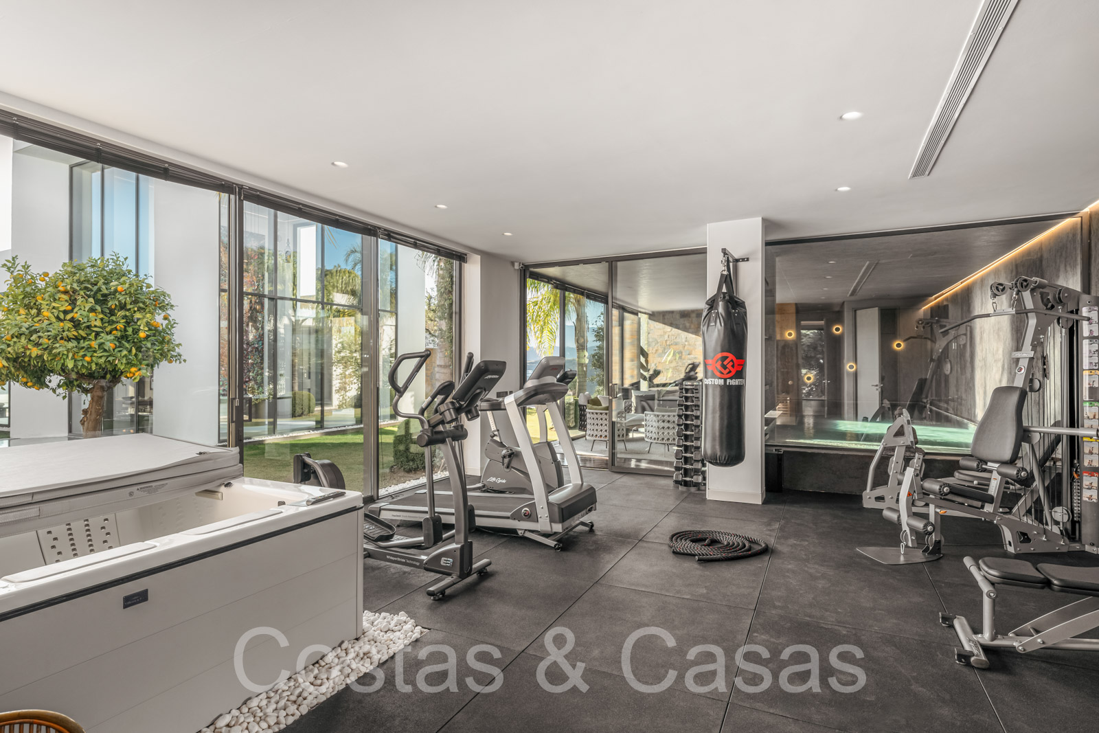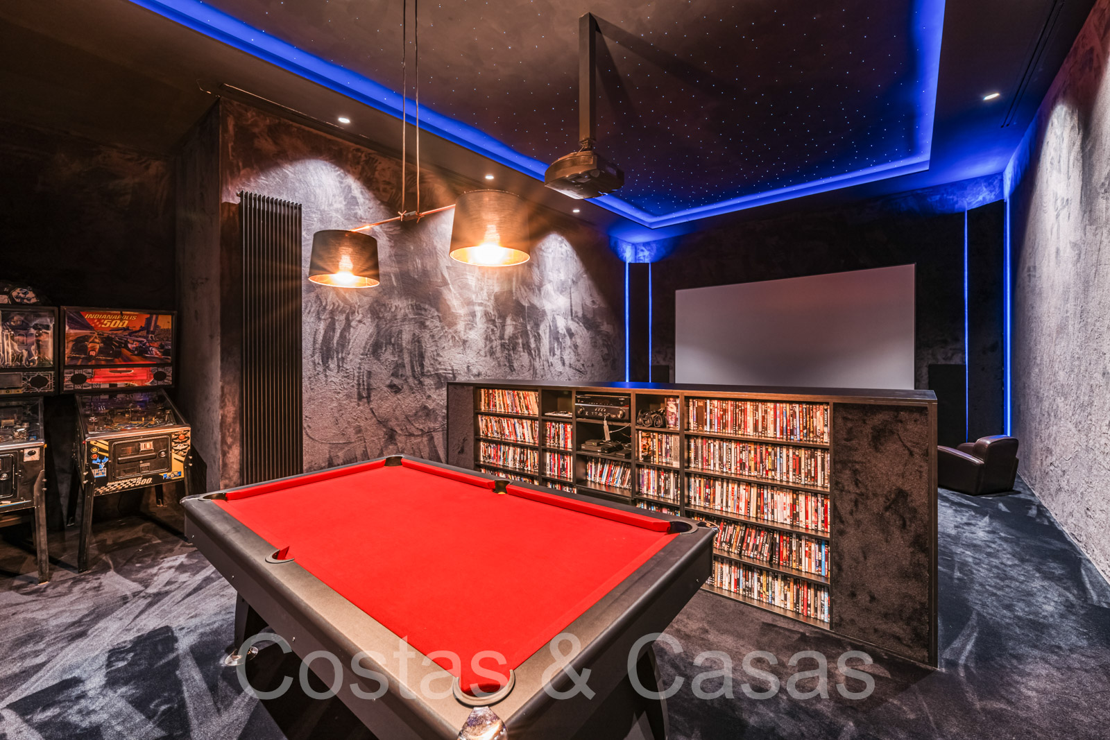 La villa: Villa prête à emménager, à l'architecture épurée et moderne. Un étage. Une allée privée permet d'accéder à la parcelle vers l'entrée et le garage hors sol pour 7 voitures. Vous êtes accueilli dans un hall d'entrée double hauteur et richement éclairé. Un atrium central fournit de l'herbe, des arbres et une passerelle et offre également beaucoup de lumière naturelle et de ventilation. Style intérieur luxueux combiné à des éléments de design plus modernes et minimalistes. Espace de vie ouvert avec salon et salle à manger. Cuisine ouverte entièrement équipée avec de nombreux rangements et un îlot de cuisson central. 6 chambres et 9 salles de bains. Chaque pièce de la maison bénéficie de beaucoup de lumière naturelle grâce aux fenêtres coulissantes du sol au plafond. Espace de loisirs comprenant un home cinéma de style loft et une salle de jeux avec billard et machines de jeux. Espace détente avec salle de sport entièrement équipée, sauna et jacuzzi. Une piscine intérieure avec chill-out. A l’étage inférieur se trouve un logement intérieur pour les invités ou le personnel.