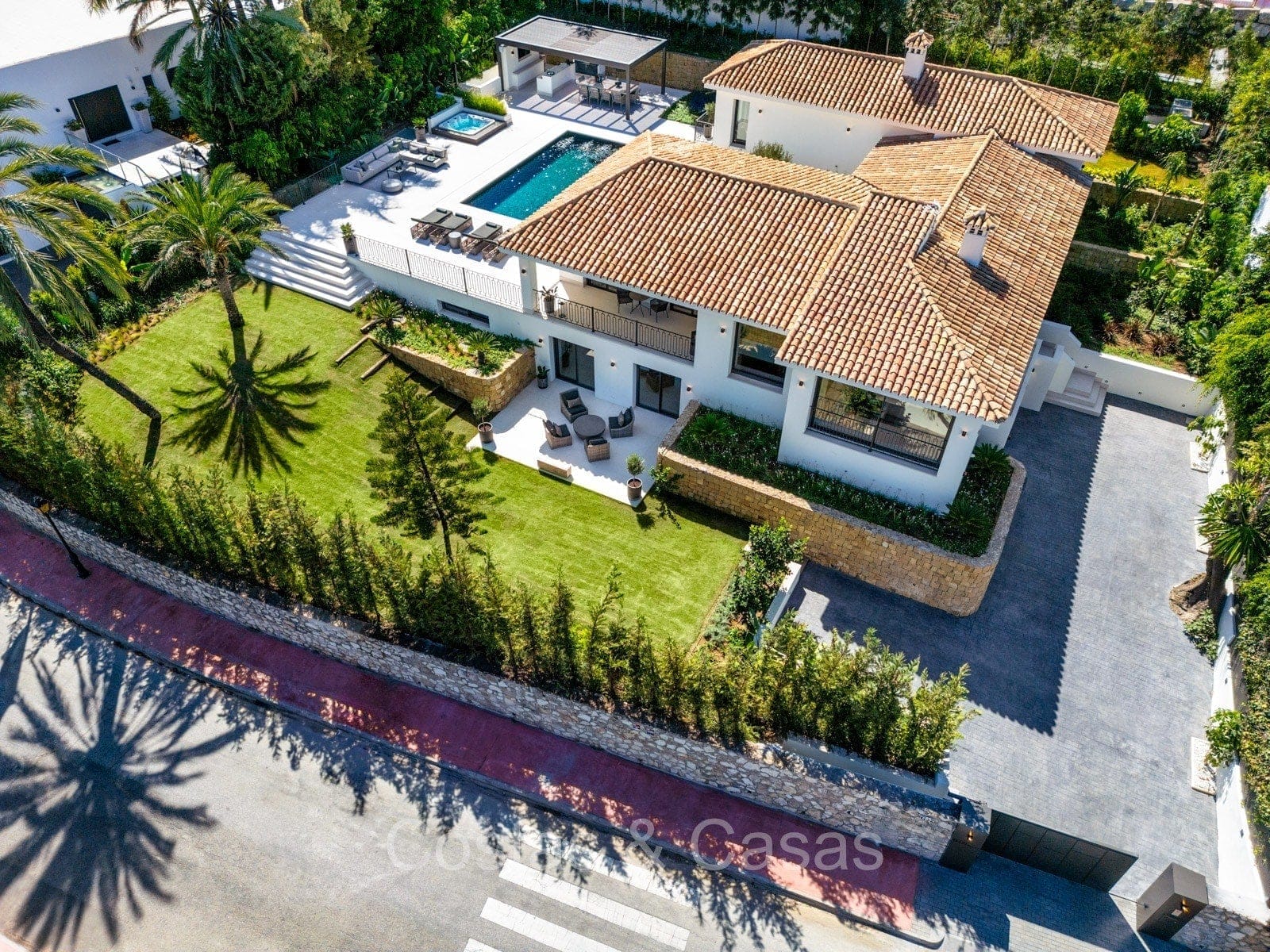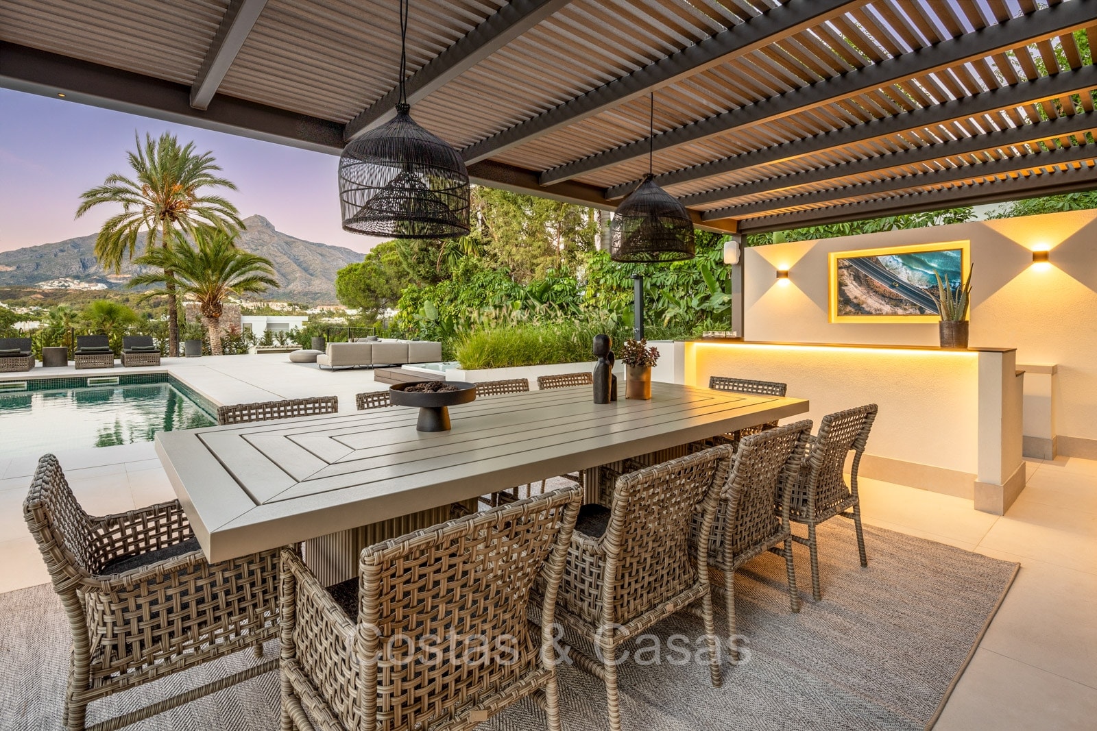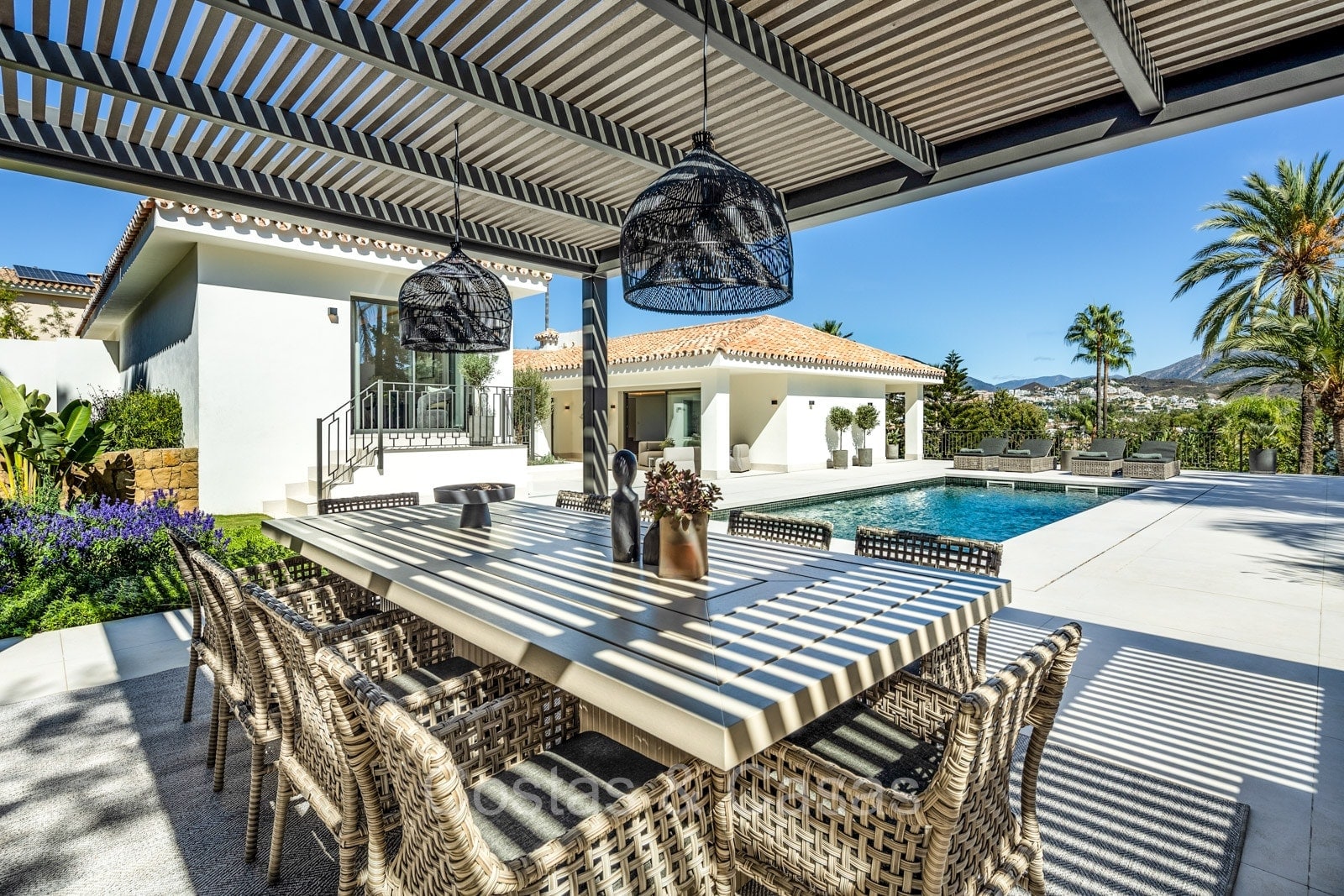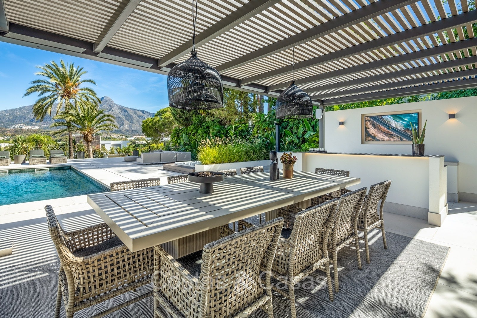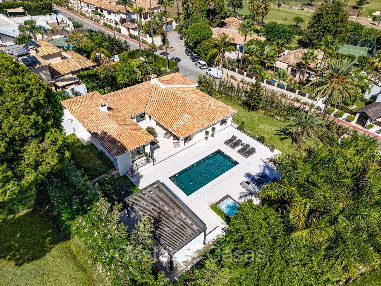 Terrain spacieux et protégé. Jardin paysager bien entretenu avec verdure tropicale et pelouse. Piscine privée entourée d'une vaste terrasse ensoleillée. Jacuzzi intégré. Cuisine extérieure ombragée avec barbecue et coin repas en plein air. Plusieurs terrasses ouvertes et ombragées offrent la possibilité de profiter de l'agréable climat méditerranéen. Orientation sud-est. Vues imprenables sur la montagne de La Concha et la vallée du golf.