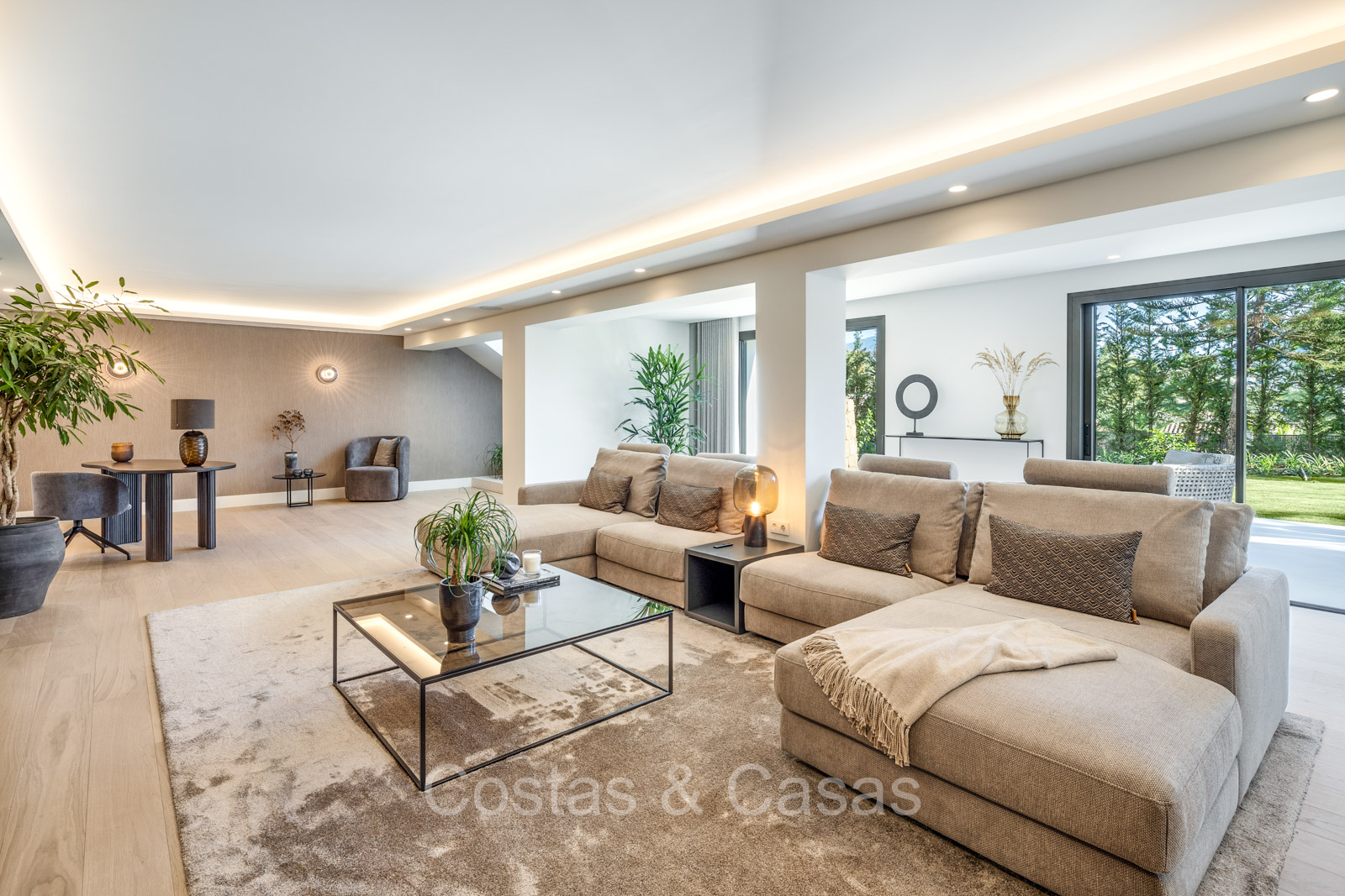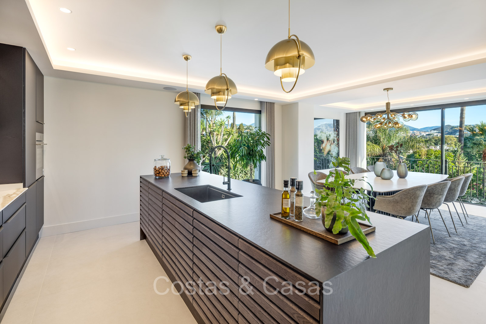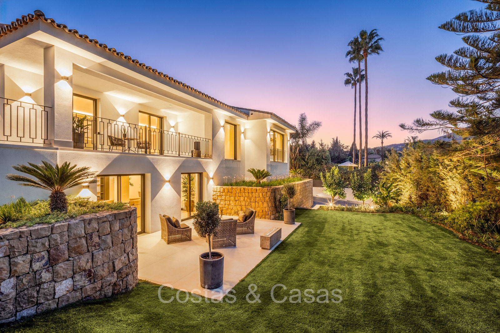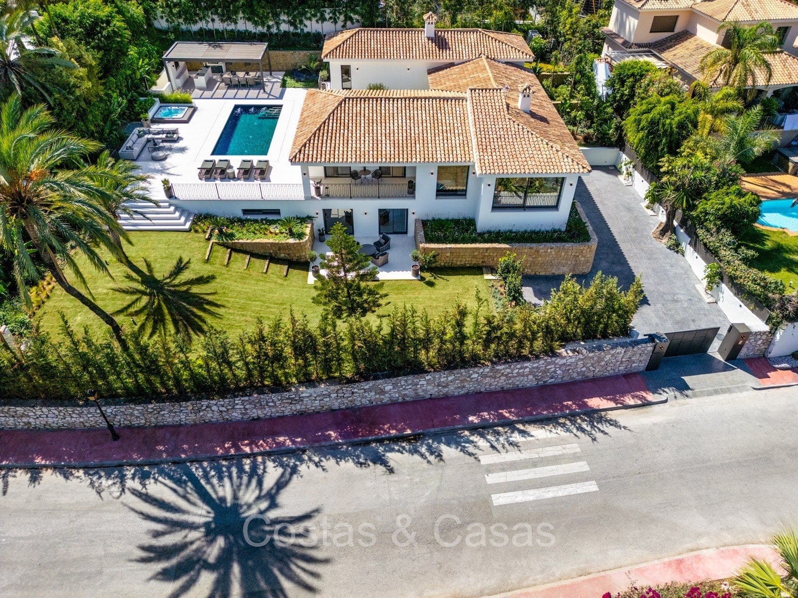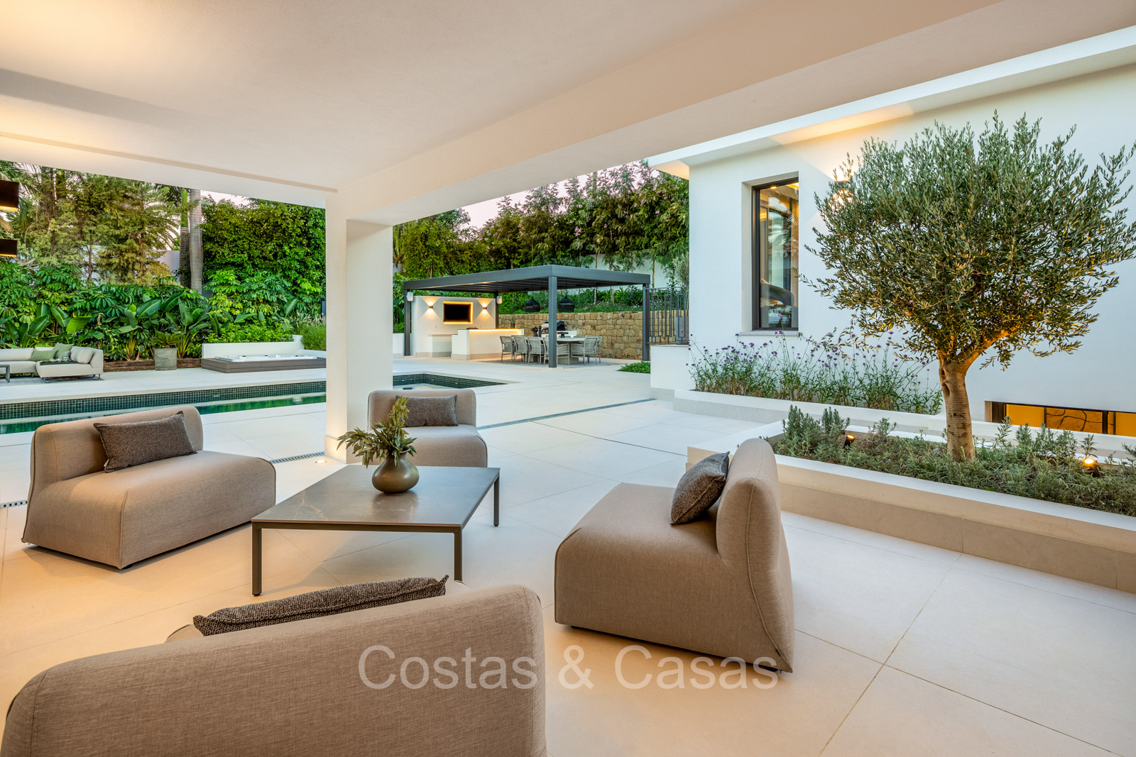 Terrain spacieux et protégé. Jardin paysager bien entretenu avec verdure tropicale et pelouse. Piscine privée entourée d'une vaste terrasse ensoleillée. Jacuzzi intégré. Cuisine extérieure ombragée avec barbecue et coin repas en plein air. Plusieurs terrasses ouvertes et ombragées offrent la possibilité de profiter de l'agréable climat méditerranéen. Orientation sud-est. Vues imprenables sur la montagne de La Concha et la vallée du golf.