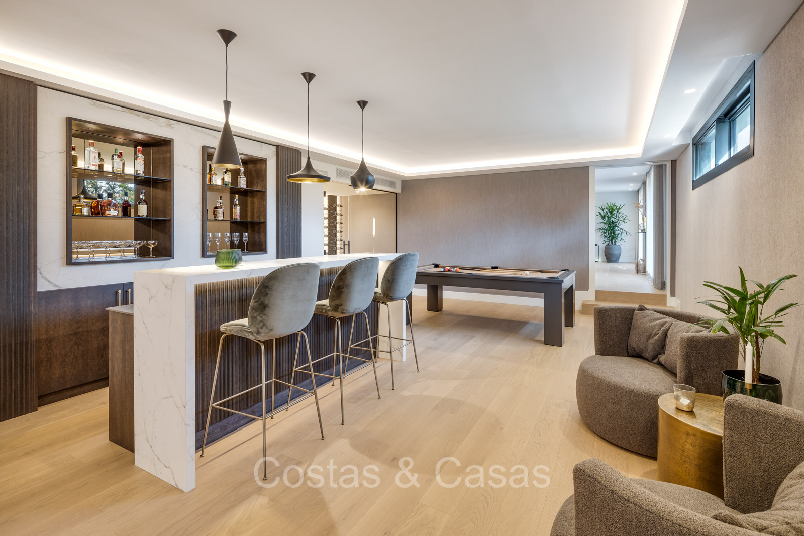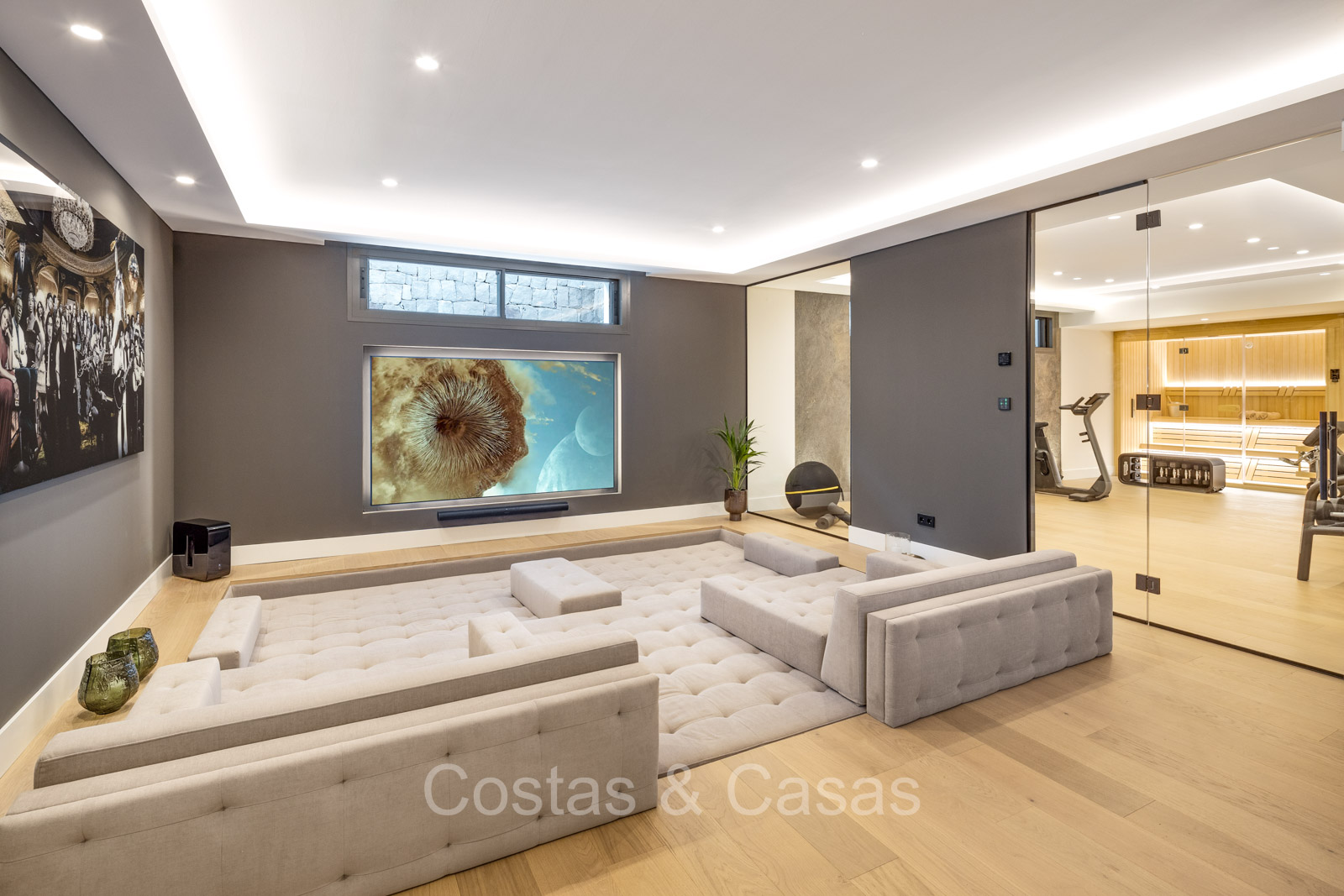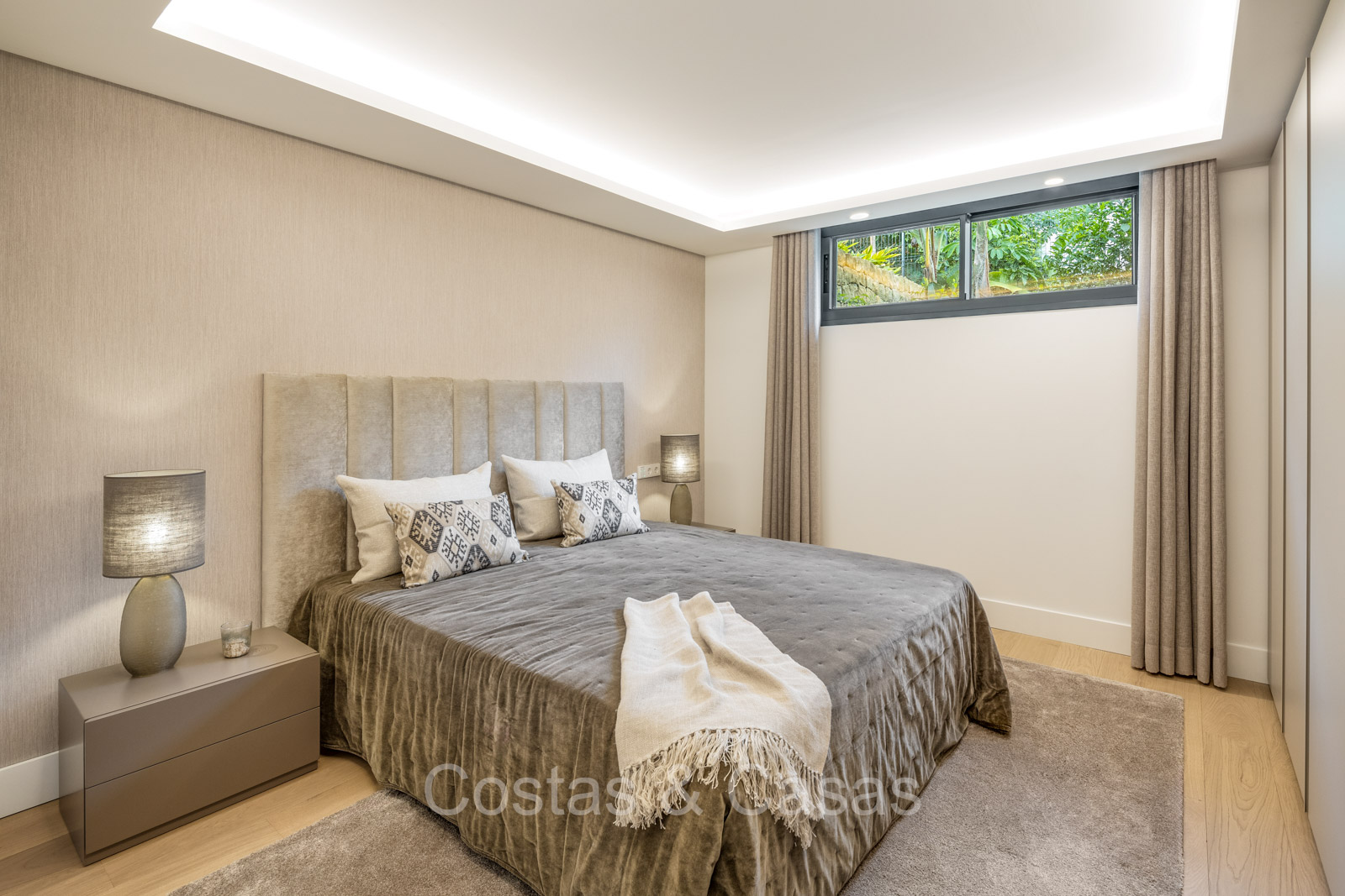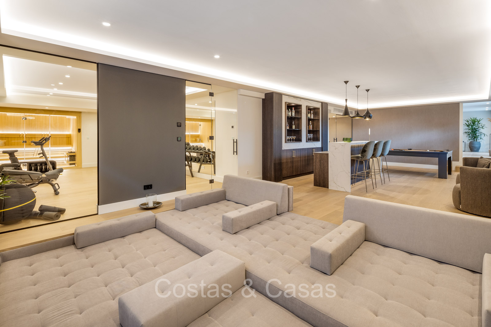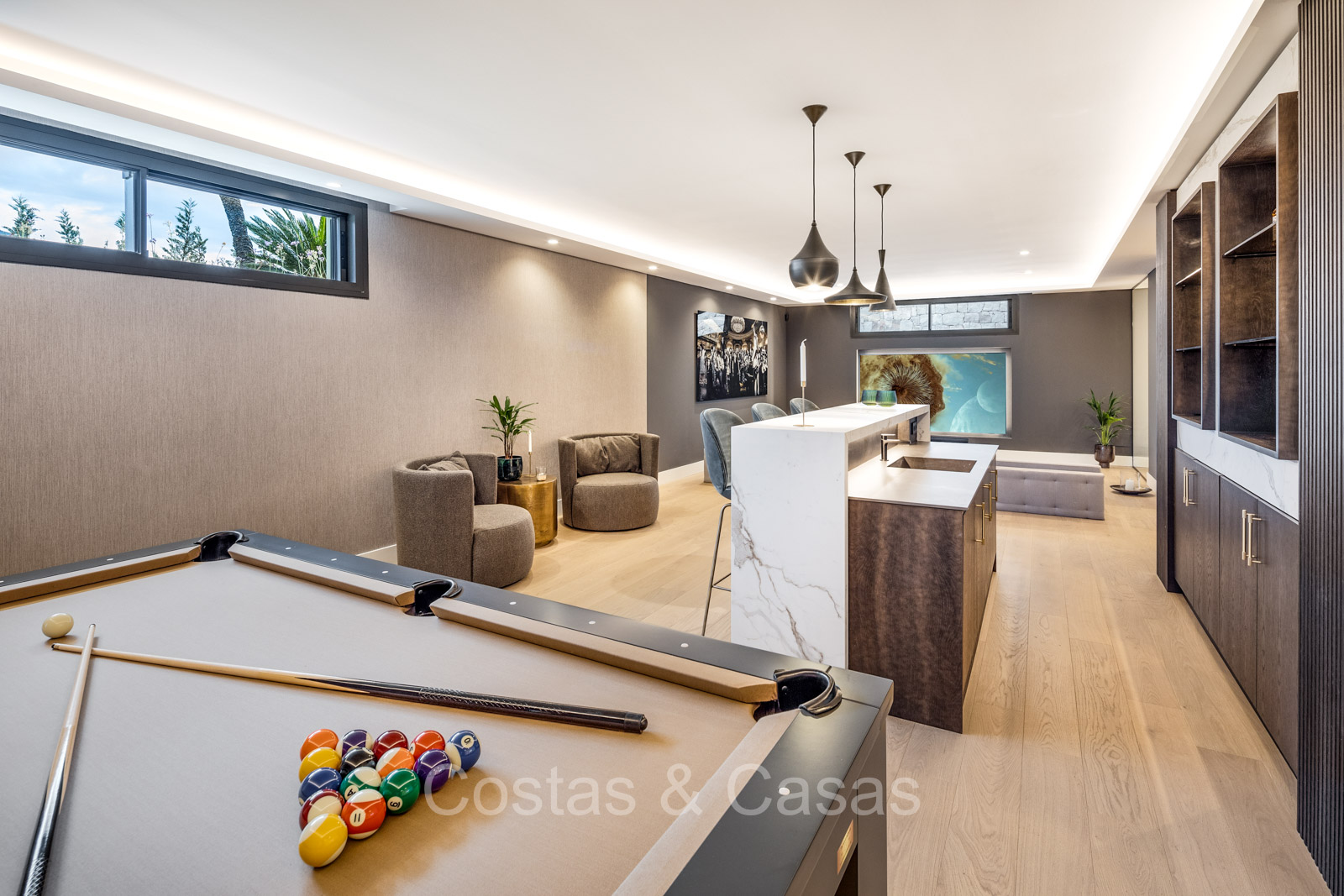 Villa individuelle de style architectural méditerranéen moderne. Luxueusement rénové en 2024 avec des intérieurs lumineux et des prestations de premier ordre. Les hautes fenêtres coulissantes avec cadres encastrés assurent un flux fluide entre les espaces intérieurs et extérieurs et génèrent également beaucoup de lumière naturelle. Cuisine ouverte pratique, entièrement équipée avec des appareils électroménagers haut de gamme et un îlot de cuisson. Coin repas intégré. 5 chambres, 5 salles de bains et une toilette invités. La suite principale spacieuse dispose d'un dressing, d'une salle de bains luxueuse avec deux installations pour elle et lui et d'une douche extérieure innovante. Planchers en chêne. 2ème salon TV avec espace bureau. Au sous-sol se trouve un espace social avec bar, home cinéma personnalisé, table de billard et cave à vin, complété par une salle de fitness et un sauna pour des activités de détente et de bien-être. Parking privé pour 2+ voitures.