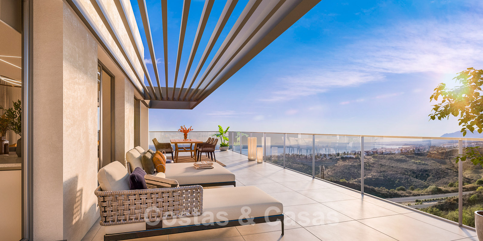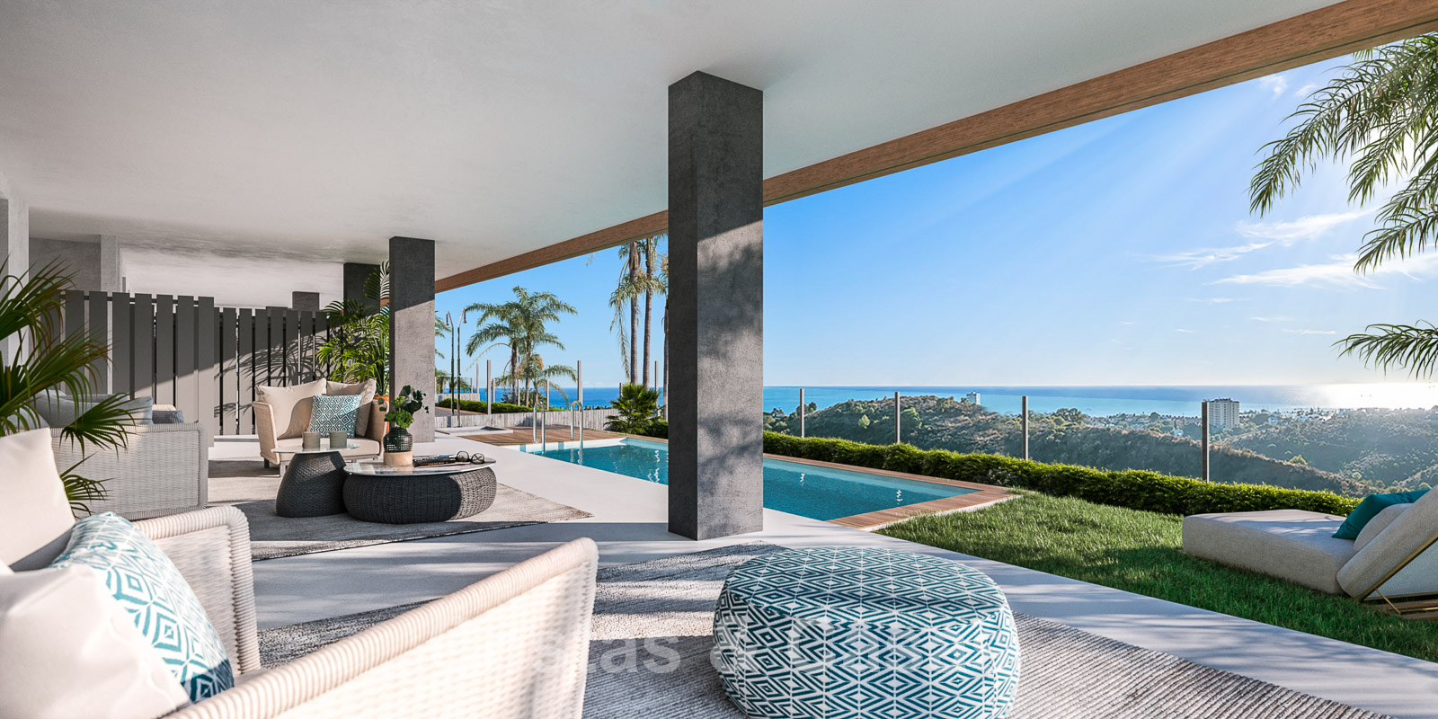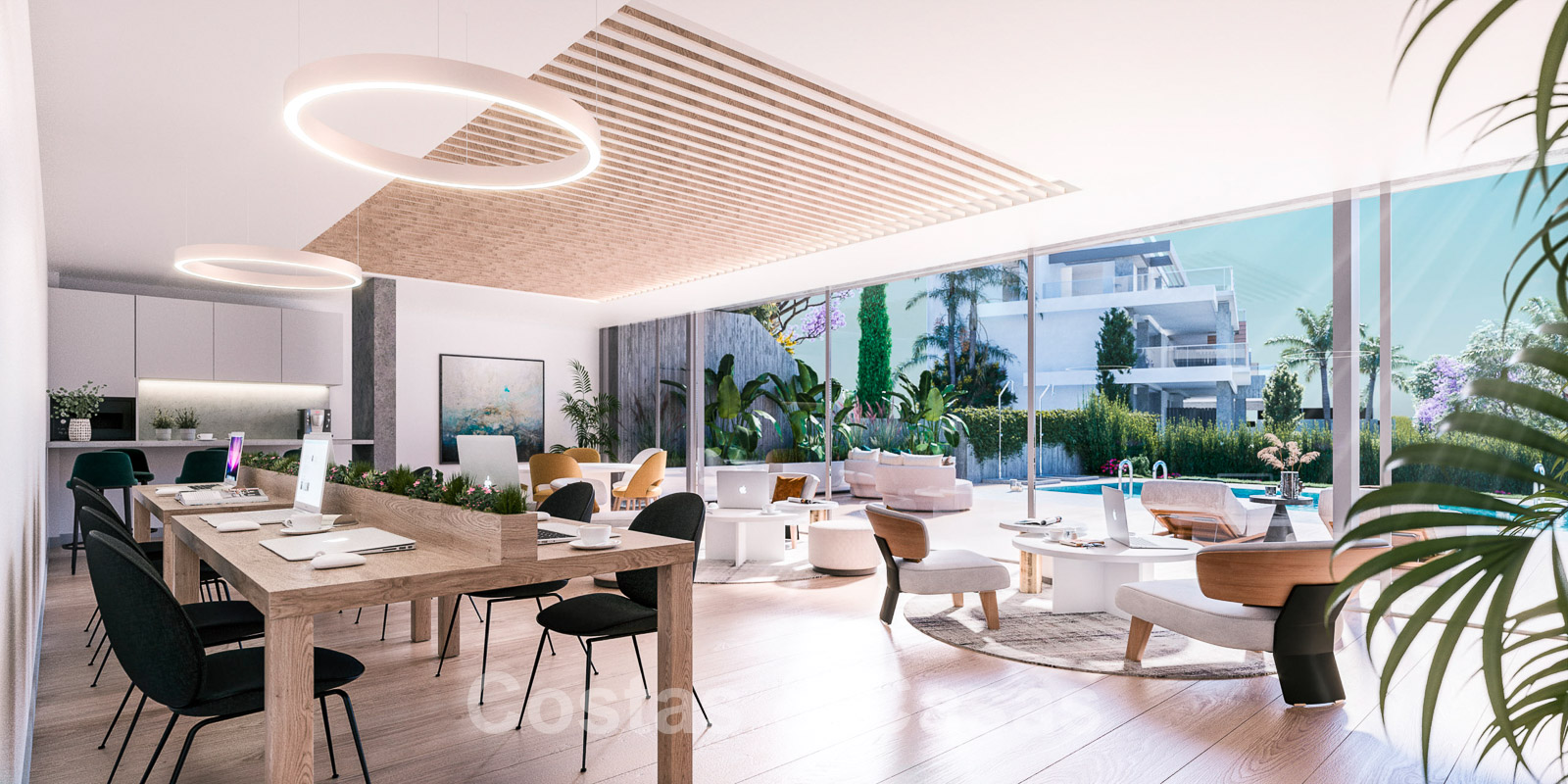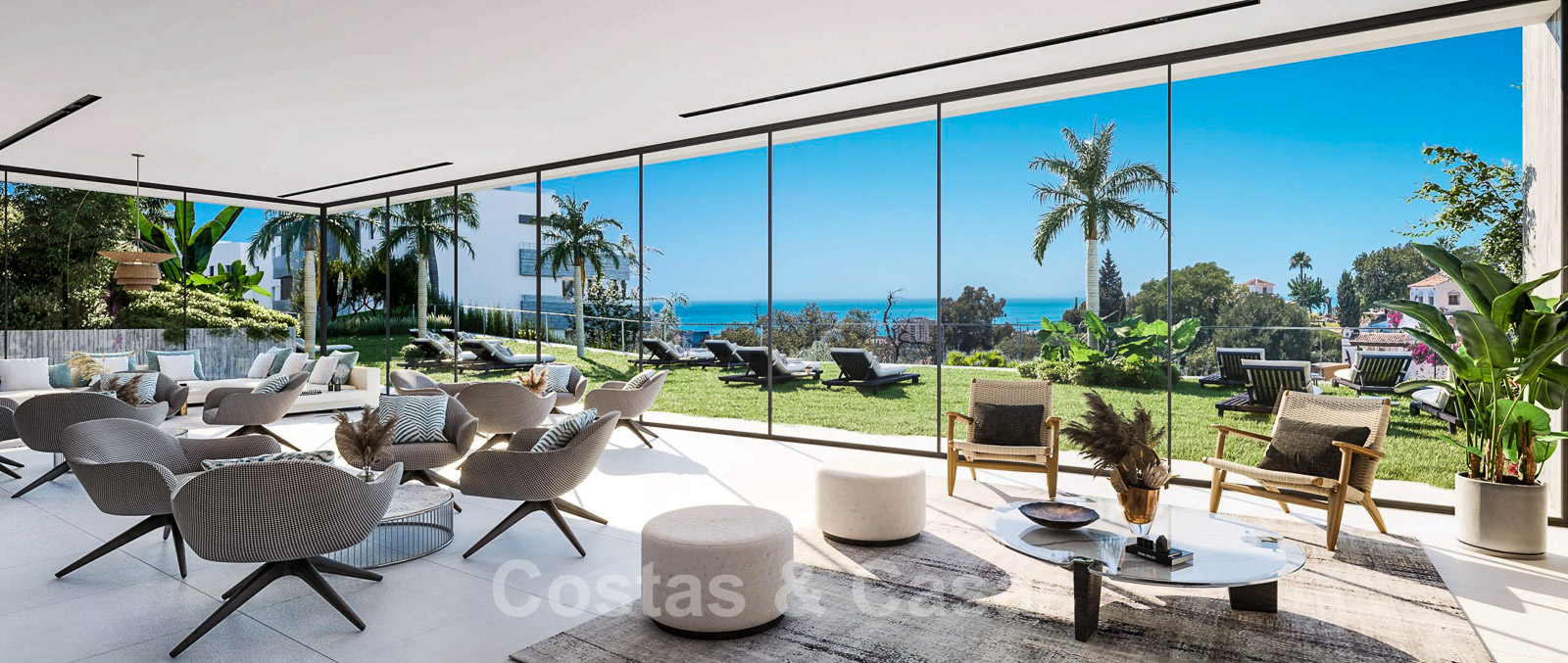 Le plan d'aménagement ouvert crée des espaces de vie spacieux et aérés, complétés par de vastes terrasses semi-couvertes, orientées au sud-ouest, avec des balustrades en verre pour des vues dégagées