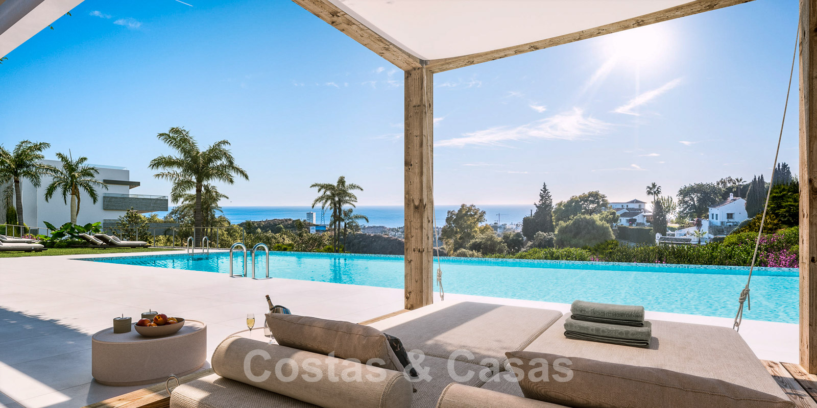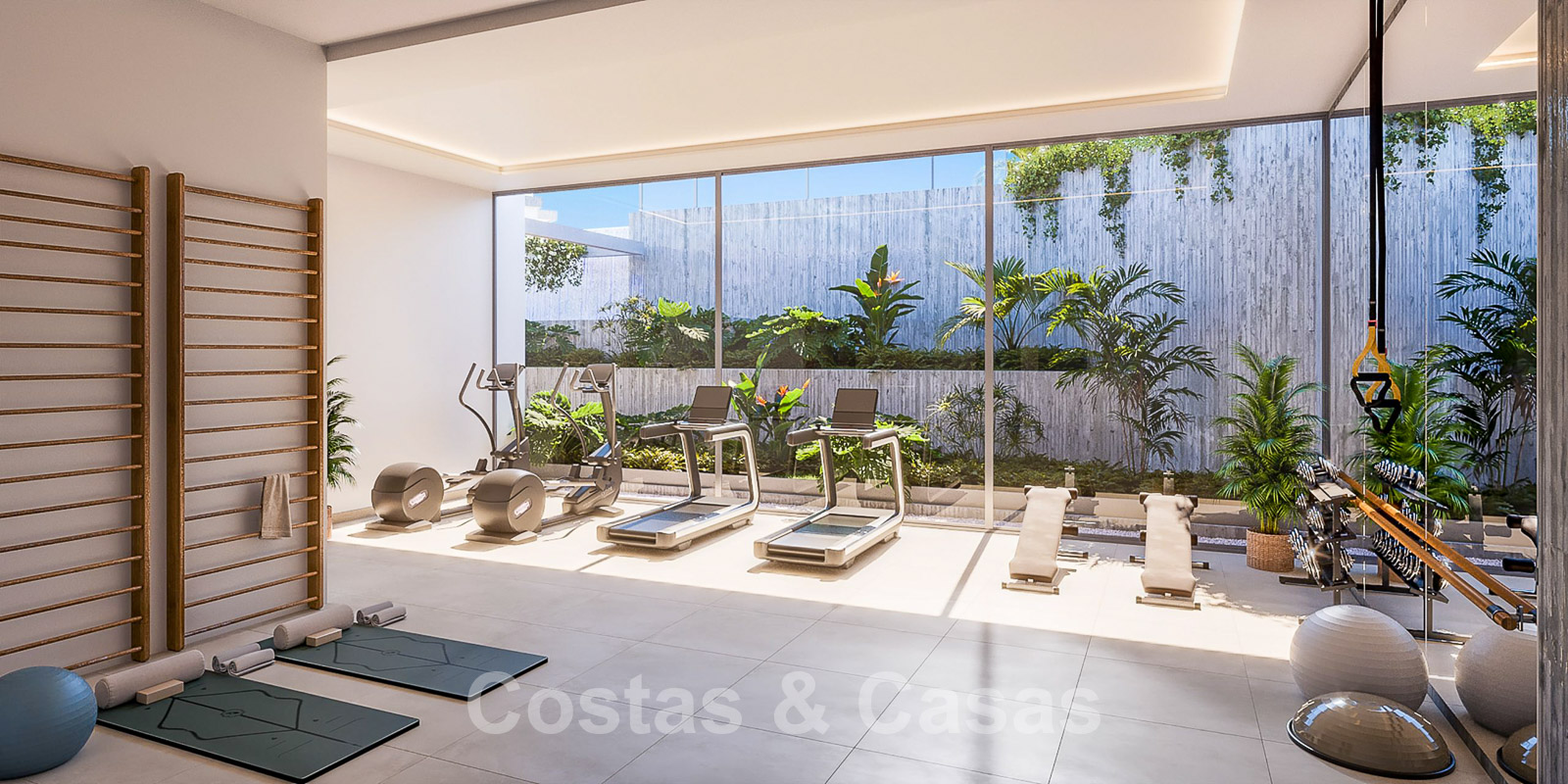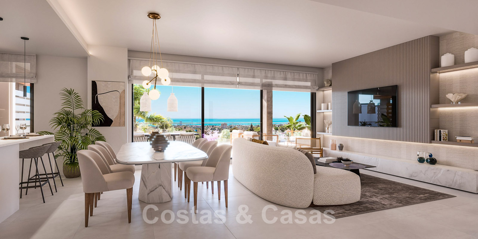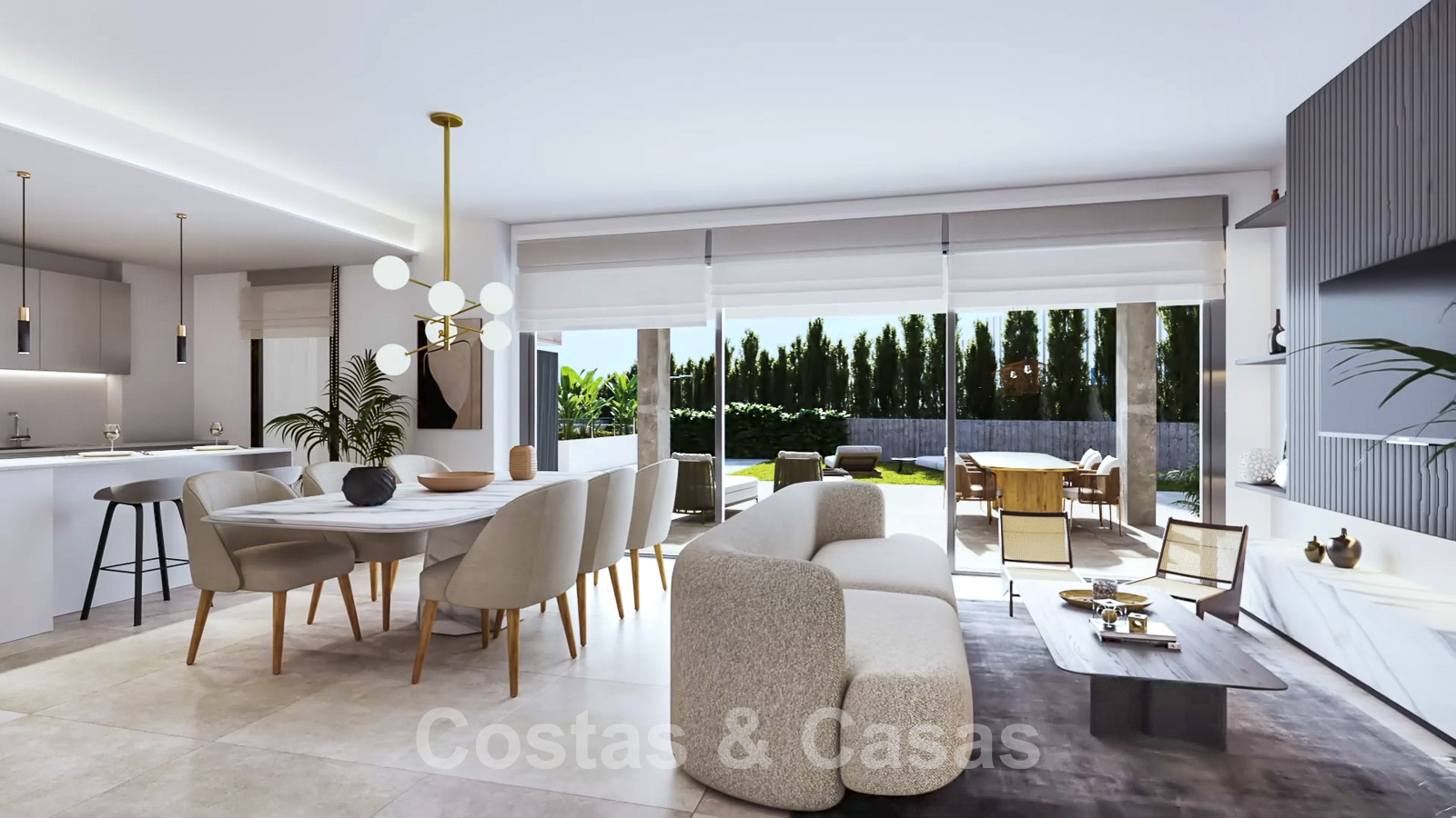 Le plan d'aménagement ouvert crée des espaces de vie spacieux et aérés, complétés par de vastes terrasses semi-couvertes, orientées au sud-ouest, avec des balustrades en verre pour des vues dégagées
