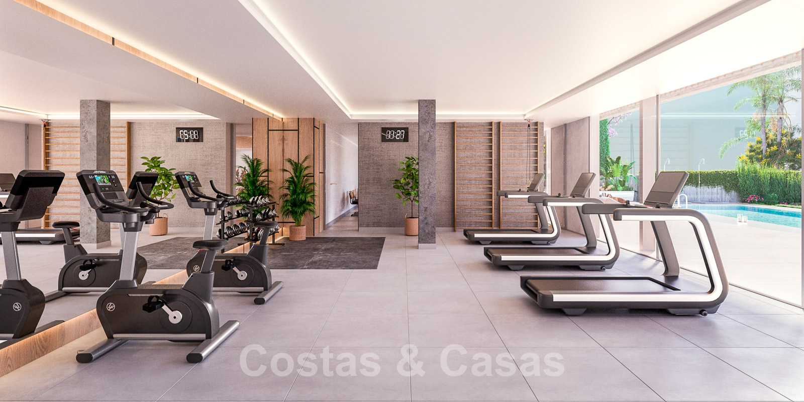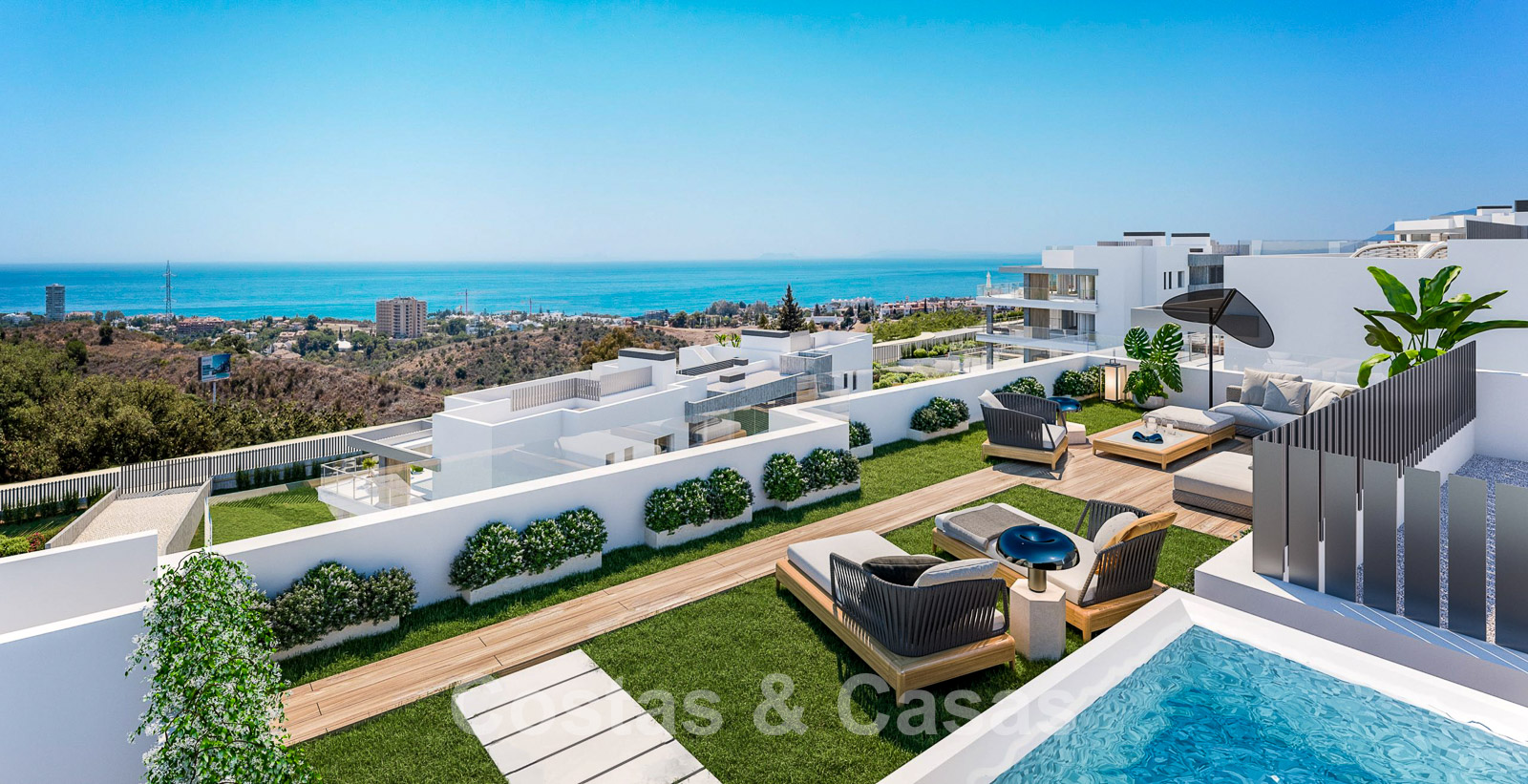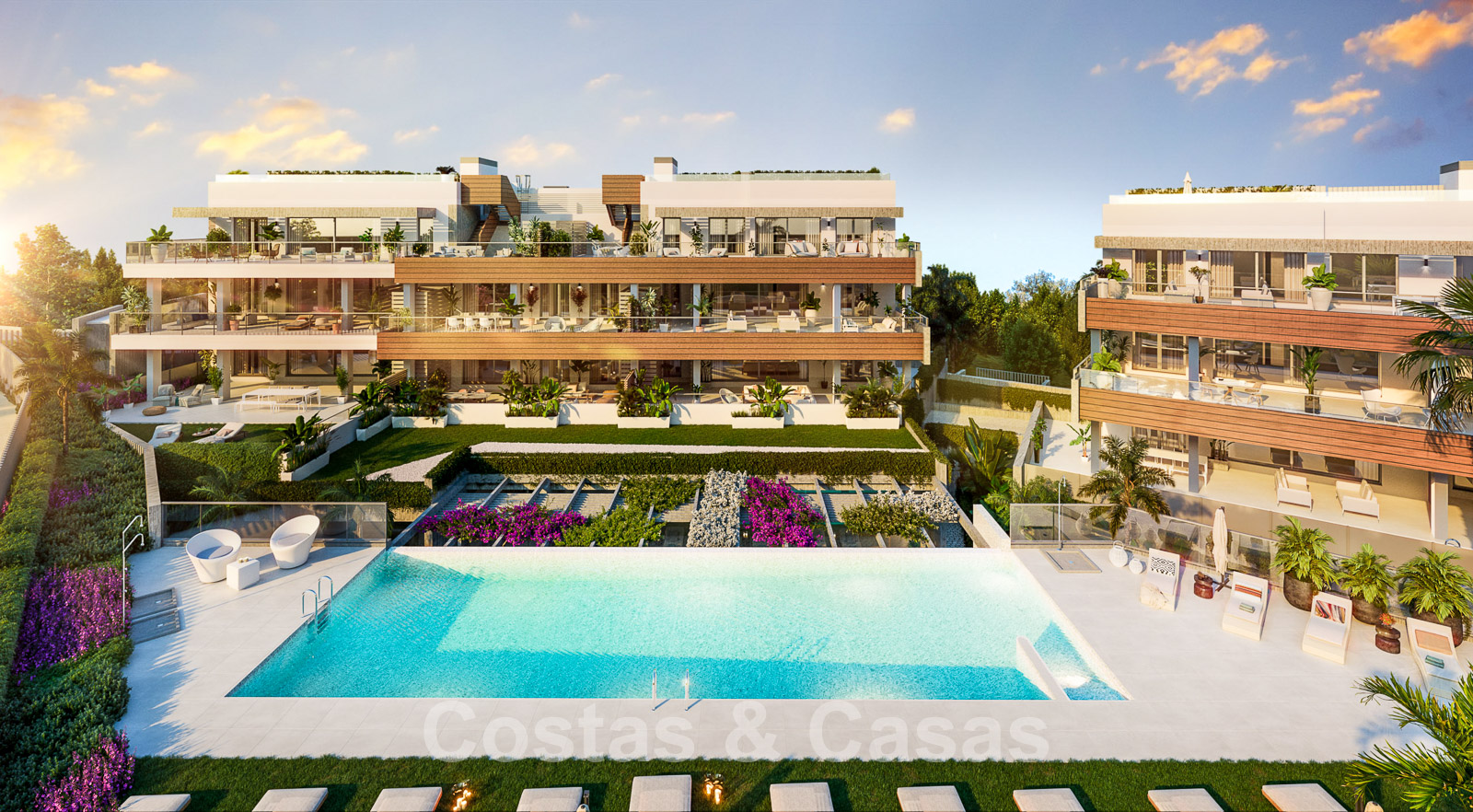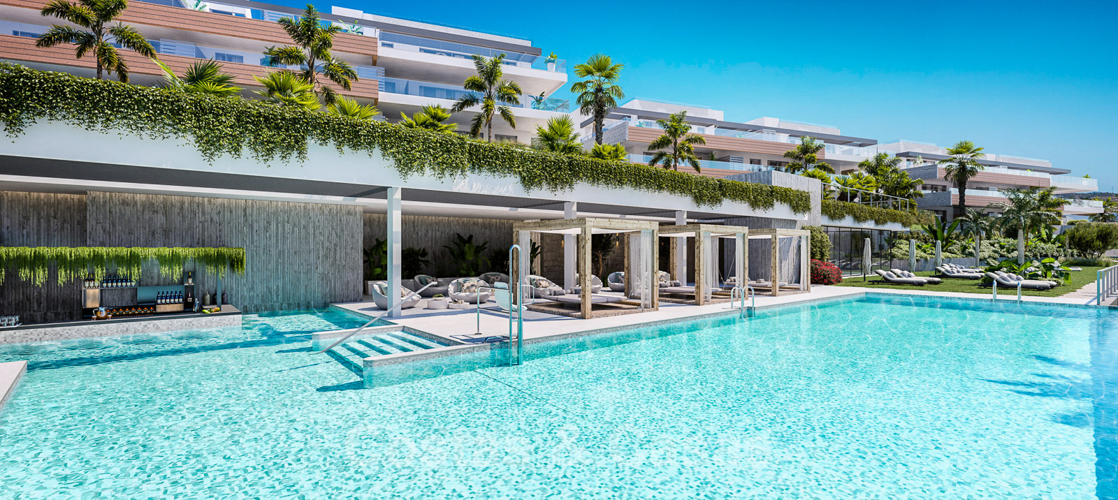 Le plan d'aménagement ouvert crée des espaces de vie spacieux et aérés, complétés par de vastes terrasses semi-couvertes, orientées au sud-ouest, avec des balustrades en verre pour des vues dégagées