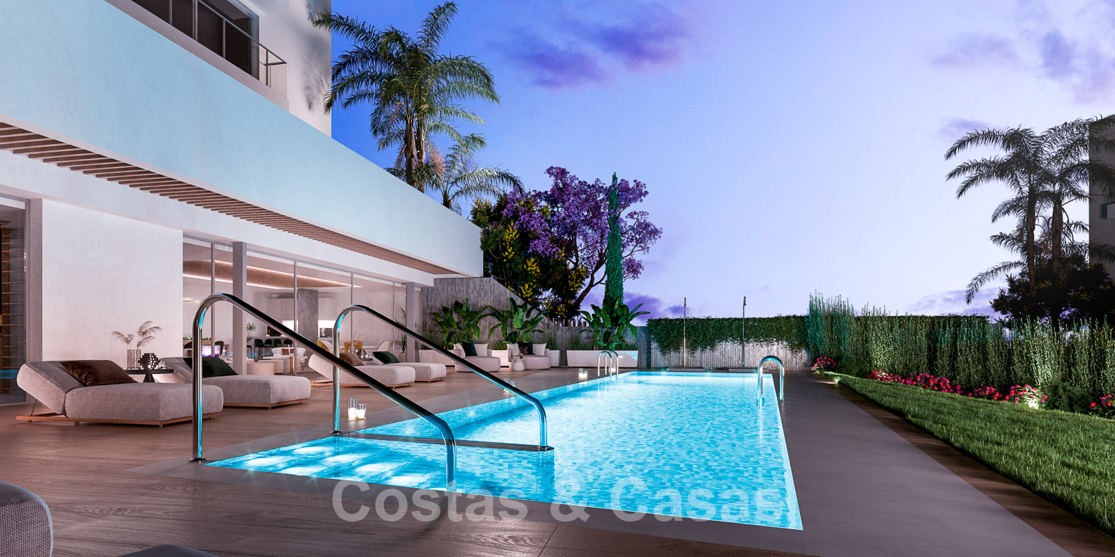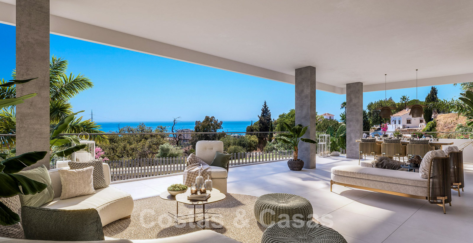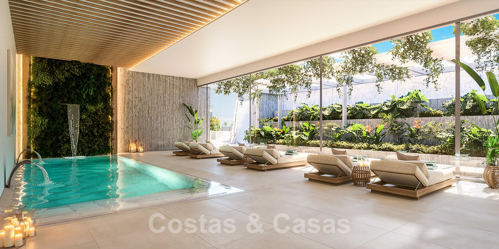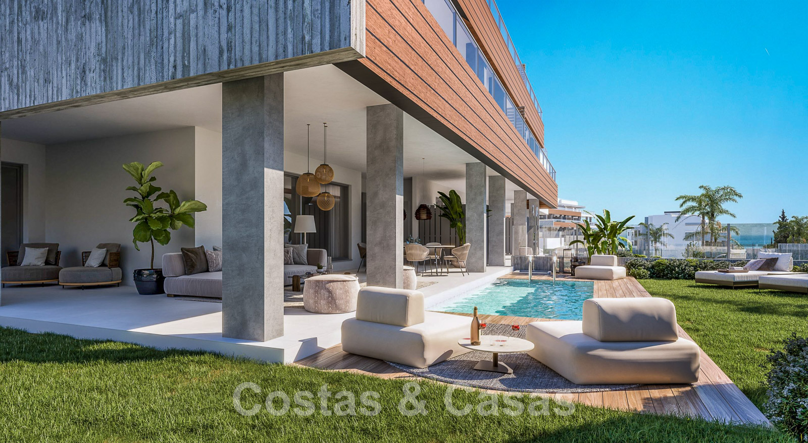 Le plan d'aménagement ouvert crée des espaces de vie spacieux et aérés, complétés par de vastes terrasses semi-couvertes, orientées au sud-ouest, avec des balustrades en verre pour des vues dégagées
