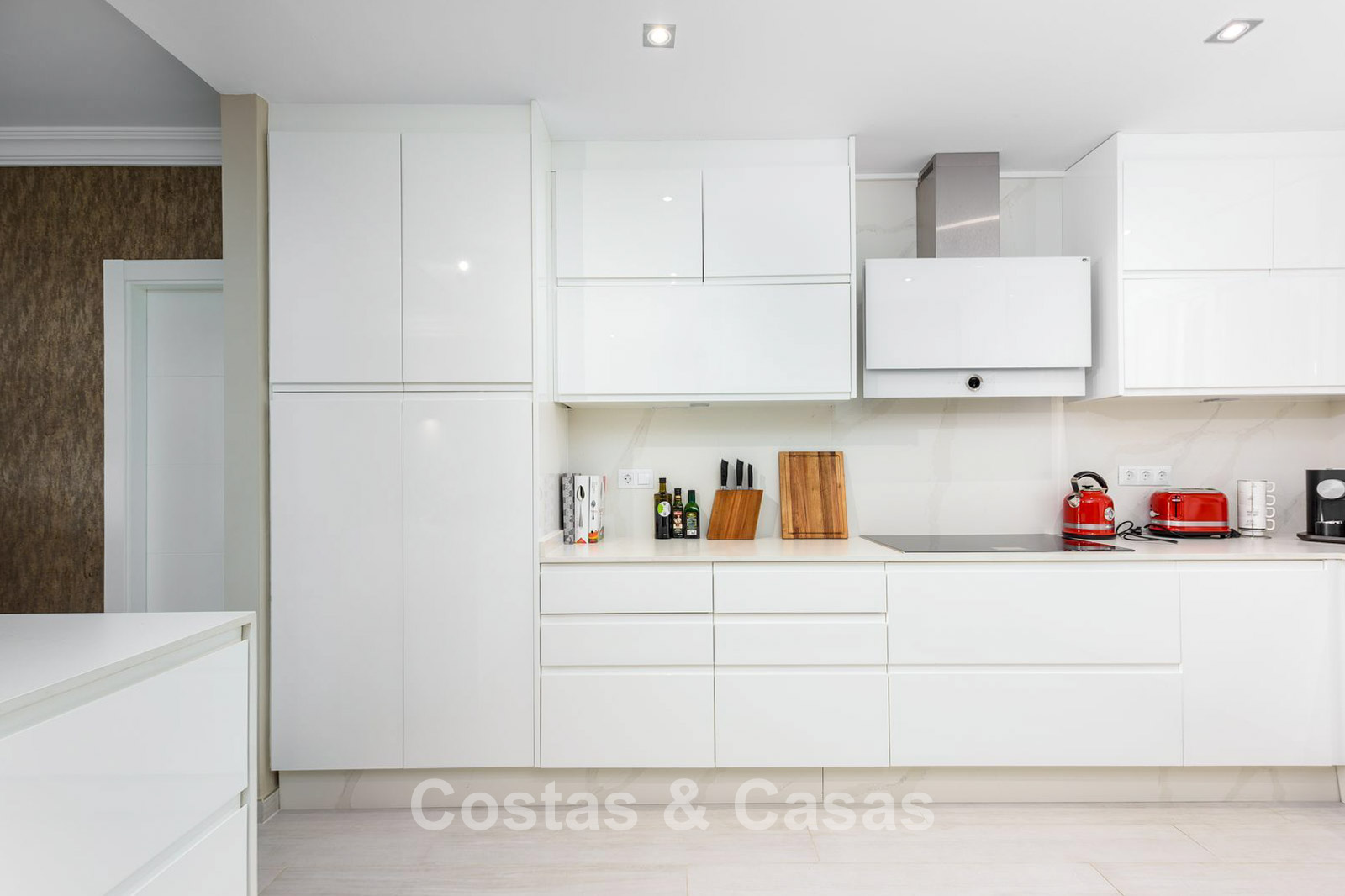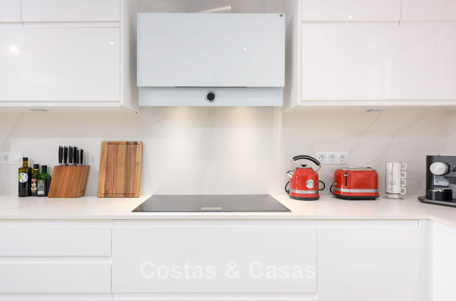 Appartement au rez-de-chaussée surélevé avec jardin privatif clos. Récemment rénové. Utilisation de matériaux de qualité et d'une finition de haute qualité. Situé au sud. Vue sur le jardin, le paysage de montagne et la mer Méditerranée. Une terrasse couverte est équipée d'un salon et peut être partiellement fermée par des rideaux de verre. Espace de vie ouvert. Cuisine ouverte avec îlot et électroménagers Bosch de qualité. Coin repas intégré. 2 chambres, 2 salles de bain. Carrelage en porcelaine aspect bois. Débarras. Parking souterrain.