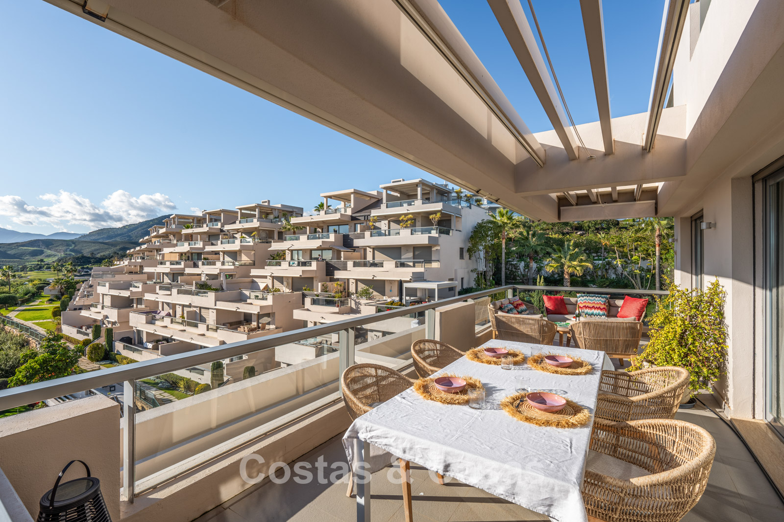 Appartement spacieux en excellent état. Utilisation de matériaux de qualité. Situé à l'ouest. Vues panoramiques sur les terrains de golf vers la mer Méditerranée. Une terrasse pergola est équipée d'un salon et d'un coin repas extérieur. Intérieur lumineux et aéré avec un aménagement ouvert. Séjour ouvert avec un salon cosy et un coin repas intégré. Cuisine moderne et ouverte avec de nombreux rangements et des électroménagers de qualité. De hautes fenêtres coulissantes s'ouvrent sur la terrasse et offrent beaucoup de lumière naturelle. 3 chambres, 2 salles de bain. Sols en marbre. Débarras. Place de parking souterrain.