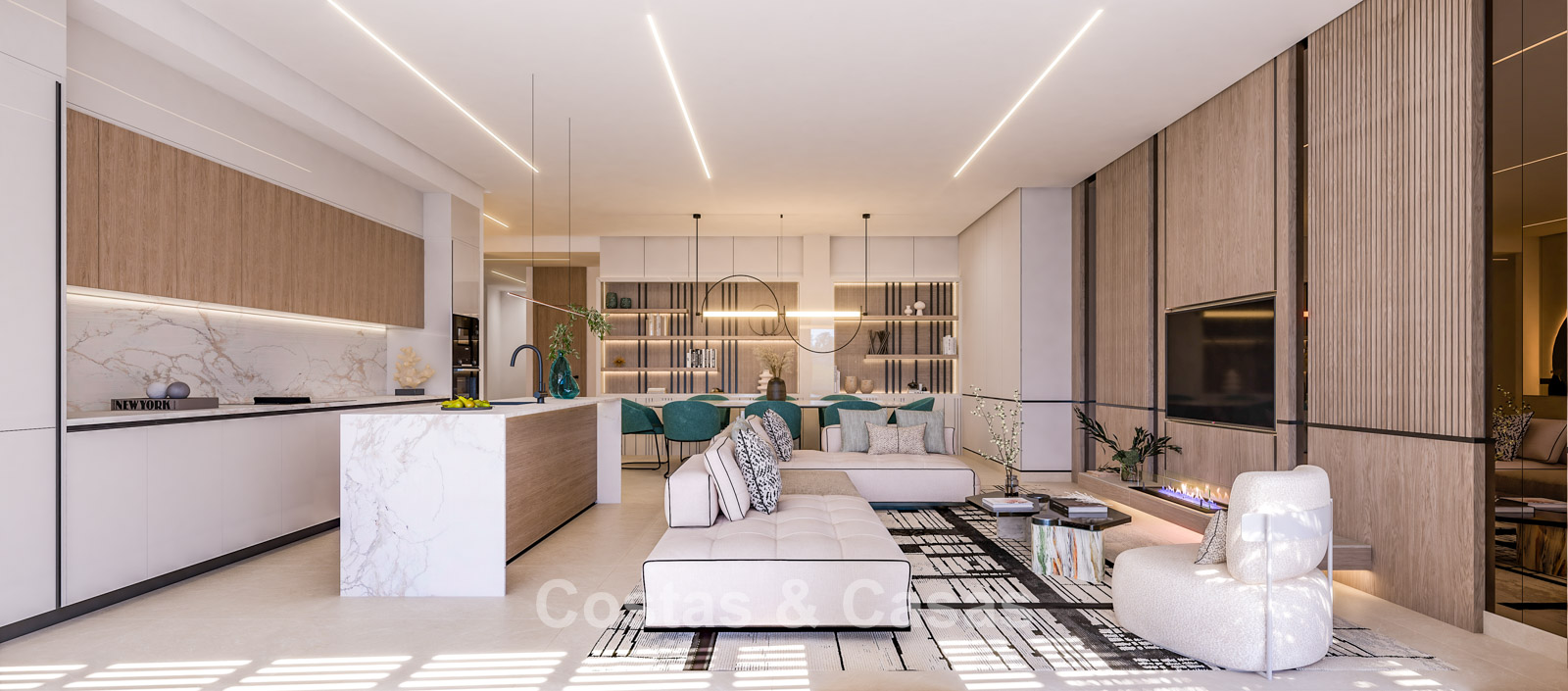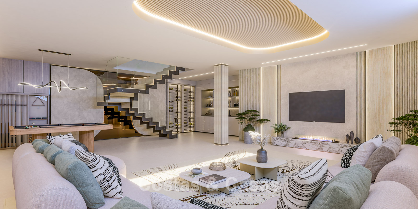 Autres caractéristiques Climatisation Chauffage au sol Système aérothermique pour l’eau chaude Cheminée contemporaine Menuiserie sur mesure Éclairage LED Double vitrage Carrelage en porcelaine couleur crème Système domotique Vidéo-interphone