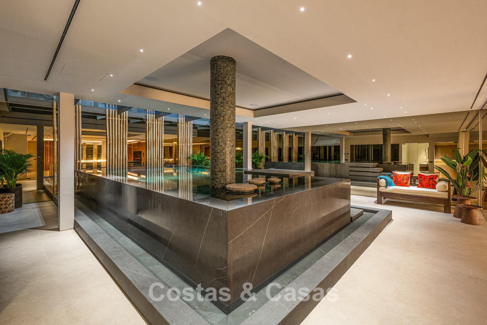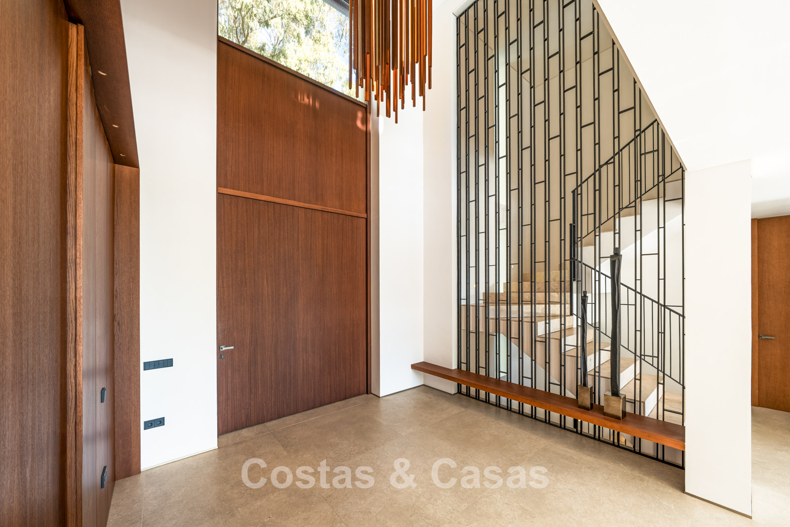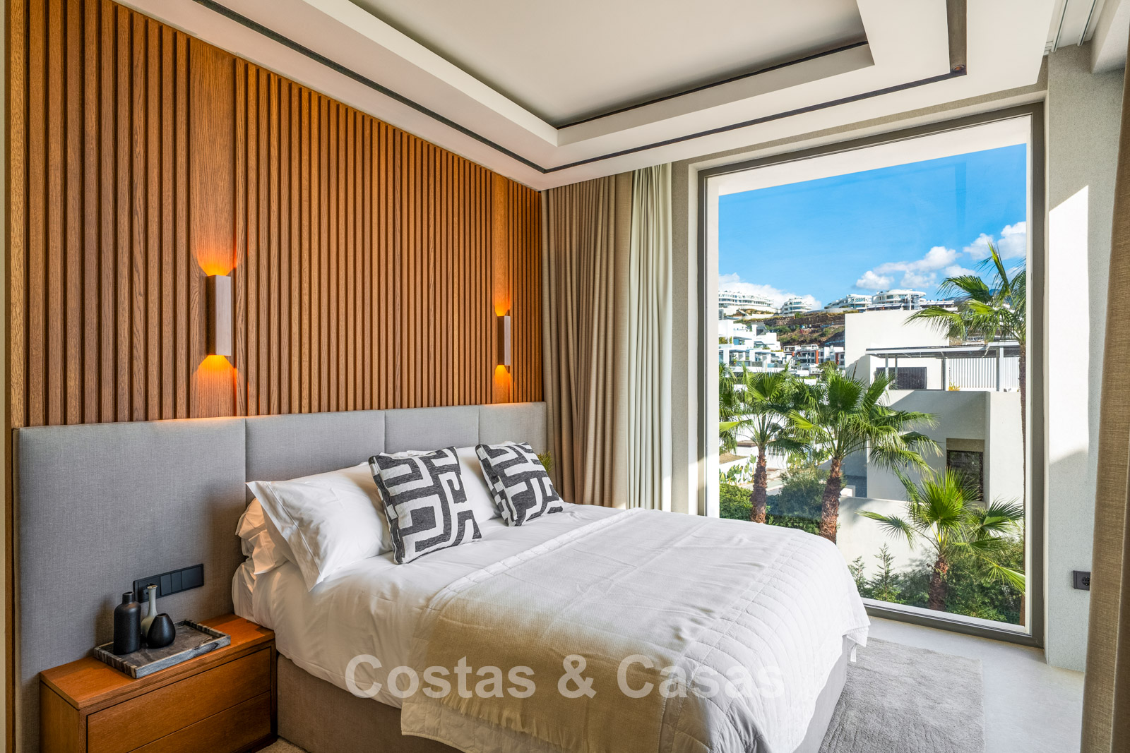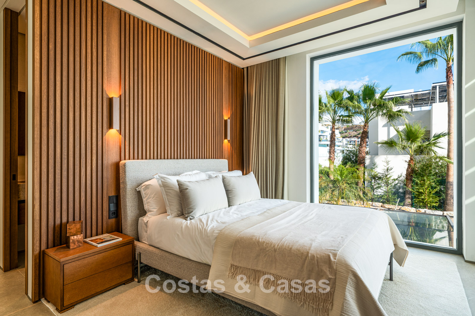 L’architecture combine des lignes contemporaines épurées et symétriques avec de subtiles influences méditerranéennes, donnant naissance à une villa élégante et intemporelle. Construite avec des matériaux haut de gamme soigneusement sélectionnés et des finitions raffinées. Orientée sud-est. Vues dégagées sur les parcours de golf, la célèbre montagne La Concha et la Méditerranée. Hall d’entrée imposant avec plafond double hauteur. Baies vitrées coulissantes du sol au plafond, avec profils intégrés, offrant une luminosité abondante et une transition fluide entre l’intérieur et l’extérieur. Disposition ouverte. Séjour lumineux et spacieux avec coin TV et salle à manger. Cuisine haut de gamme sur mesure, parfaitement intégrée au séjour, équipée d’appareils Gaggenau et d’un bar petit-déjeuner. 6 chambres, 7 salles de bains et 2 toilettes invités. Espace social élégant au niveau inférieur avec coin TV, bar et spa comprenant une piscine intérieure chauffée, sauna et salle de sport. Buanderie équipée avec matériel Miele. Garage intégré pour 2 voitures avec point de charge pour véhicules électriques.