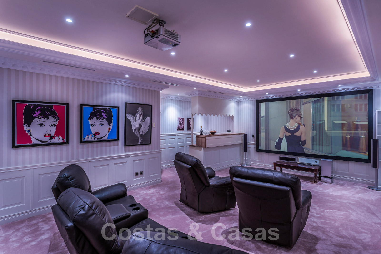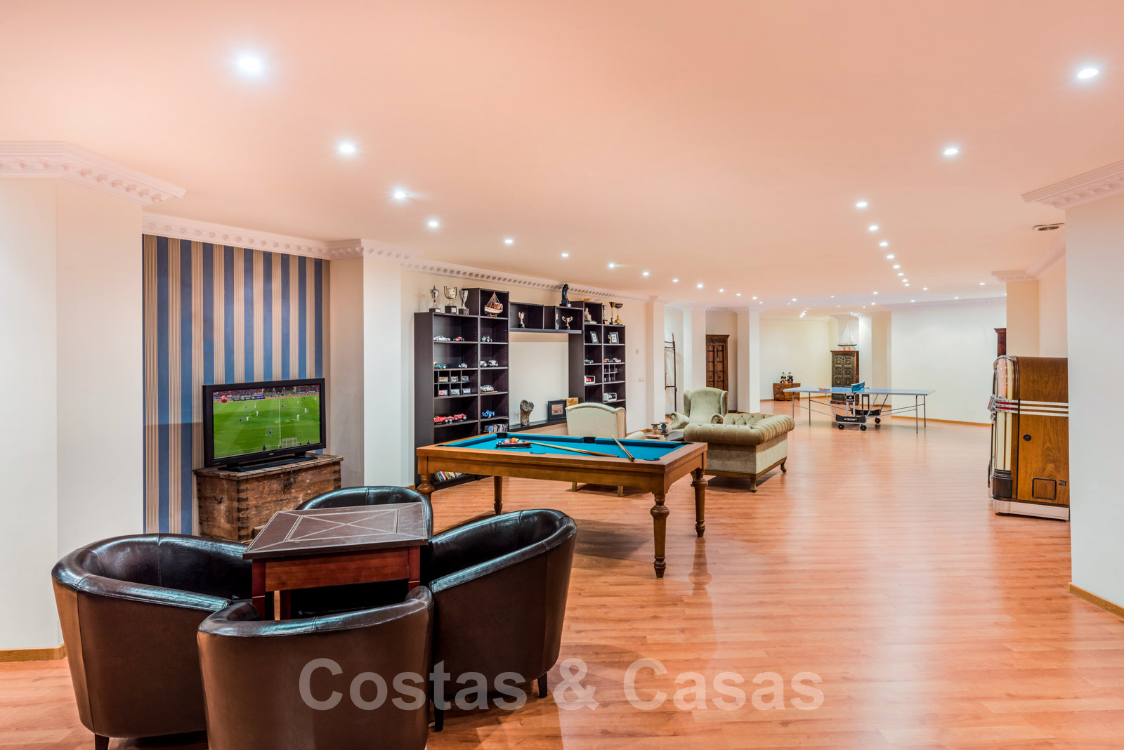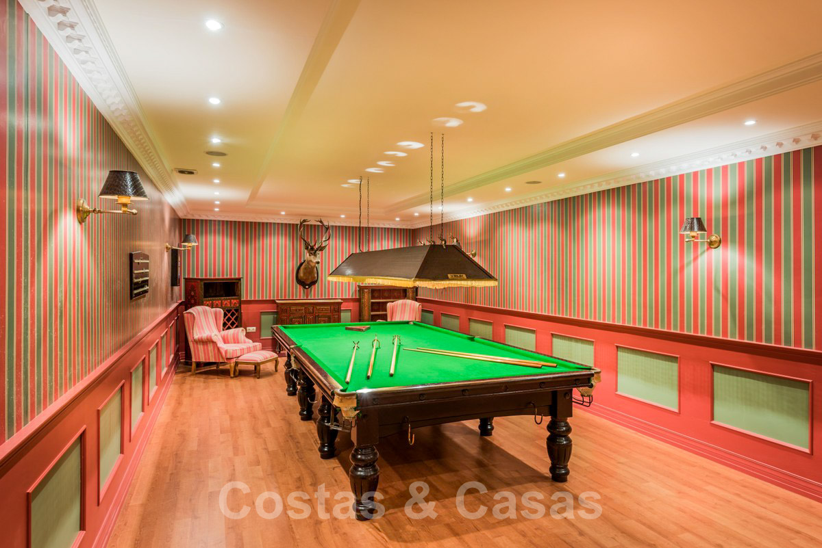 Au niveau inférieur, nous trouvons une vaste salle de divertissement, une salle de cinéma et de billard, deux chambres à coucher avec salle de bain et des quartiers pour le personnel.