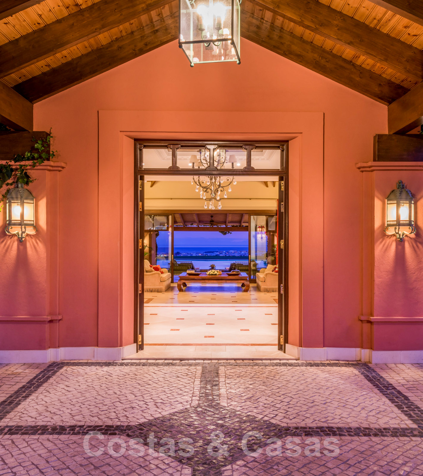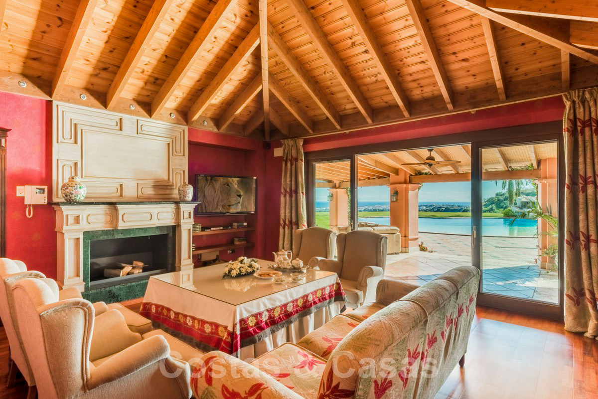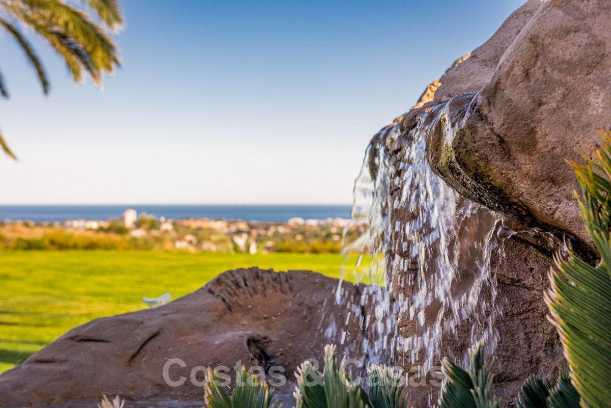Un hall avec plafond à double hauteur donne sur les principaux espaces de vie et s'ouvre sur le joli jardin avec piscine privée chauffée à l'eau salée avec cascade de pierres et offrant une vue panoramique époustouflante sur la mer et les montagnes.