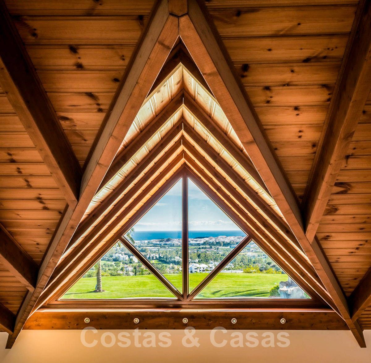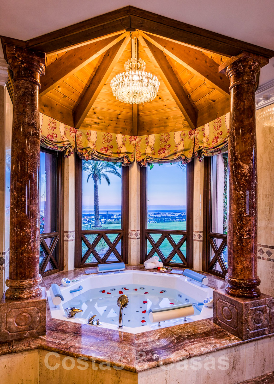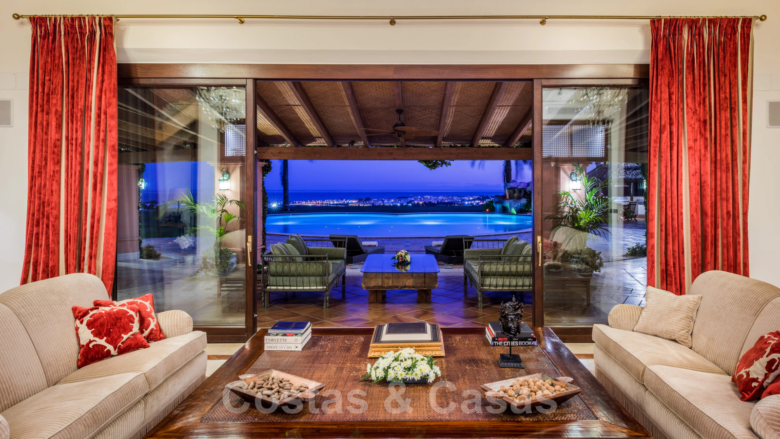 Un hall avec plafond à double hauteur donne sur les principaux espaces de vie et s'ouvre sur le joli jardin avec piscine privée chauffée à l'eau salée avec cascade de pierres et offrant une vue panoramique époustouflante sur la mer et les montagnes.