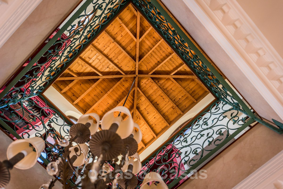 Une galerie ouverte avec deux bibliothèques donnant sur le salon à double hauteur de plafond nous conduit à une cuisine spacieuse de style campagnard avec les derniers appareils électroménagers et une belle salle à manger.