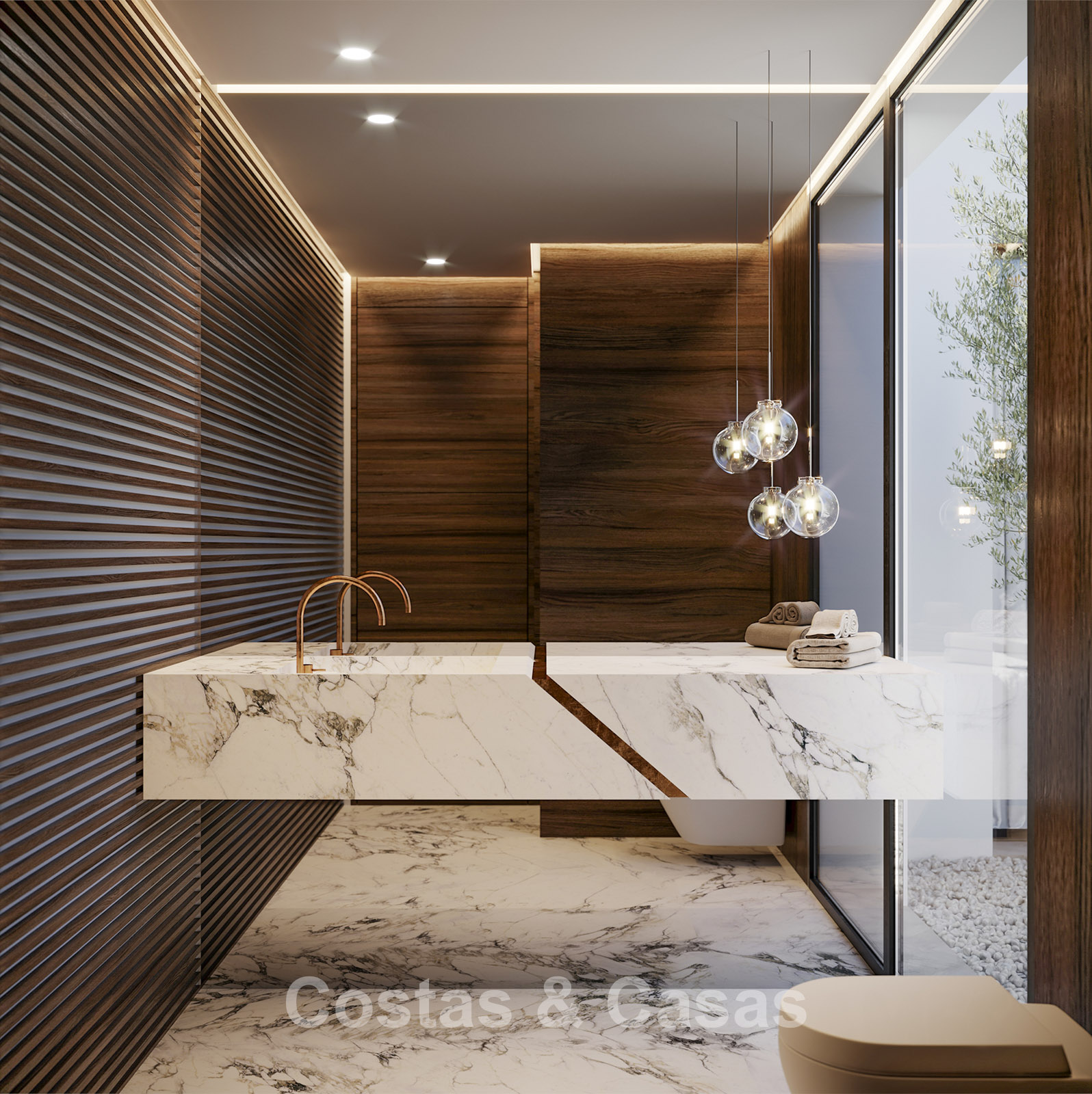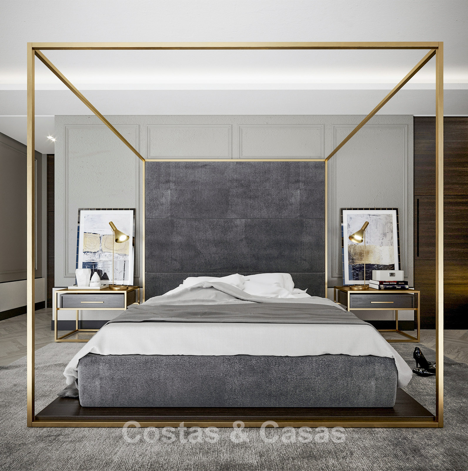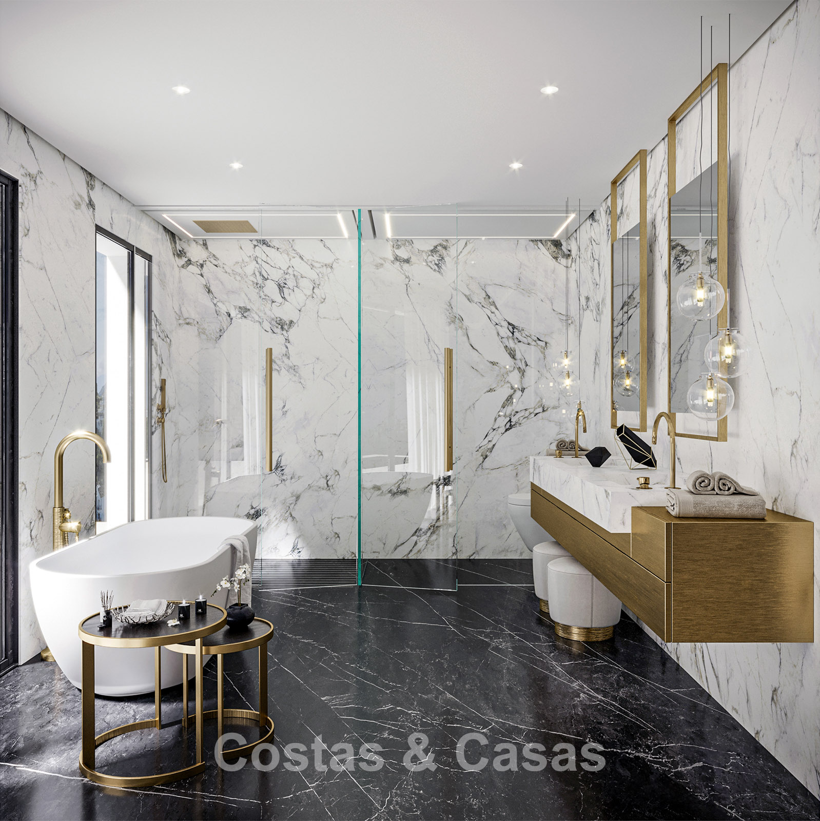 Villa individuelle à l'architecture raffinée. Conçue avec un excellent savoir-faire, des matériaux durables et un design personnalisé. Les fenêtres coulissantes du sol au plafond avec cadres encastrés assurent une transition harmonieuse entre l'intérieur et l'extérieur et permettent à une lumière naturelle abondante de circuler. L'intérieur tendance dégage un design chic et luxueux, avec des matériaux raffinés et des accents élégants. Un espace de vie spacieux combine un salon élégant avec une salle à manger à la mode. La cuisine sur mesure est équipée d'armoires du sol au plafond, d'un mur à vin tendance à la fois fonctionnel et décoratif, et d'un élégant îlot de cuisson en marbre avec bar à petit-déjeuner intégré. Au total, il y a 6 chambres chacune avec sa propre terrasse et 9 salles de bains. De plus, il y a un appartement pour le personnel avec sa propre entrée. Salle de jeux, cave à vin, bureau, hammam, sauna, salle de sport équipée, bar et spa. Buanderie. Sols gris dans une structure raffinée à chevrons. Parking couvert.