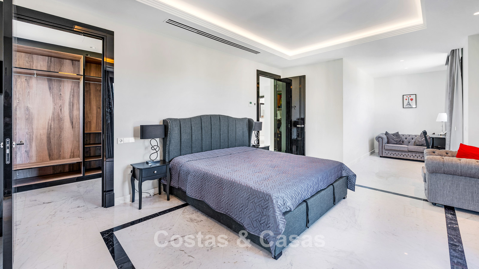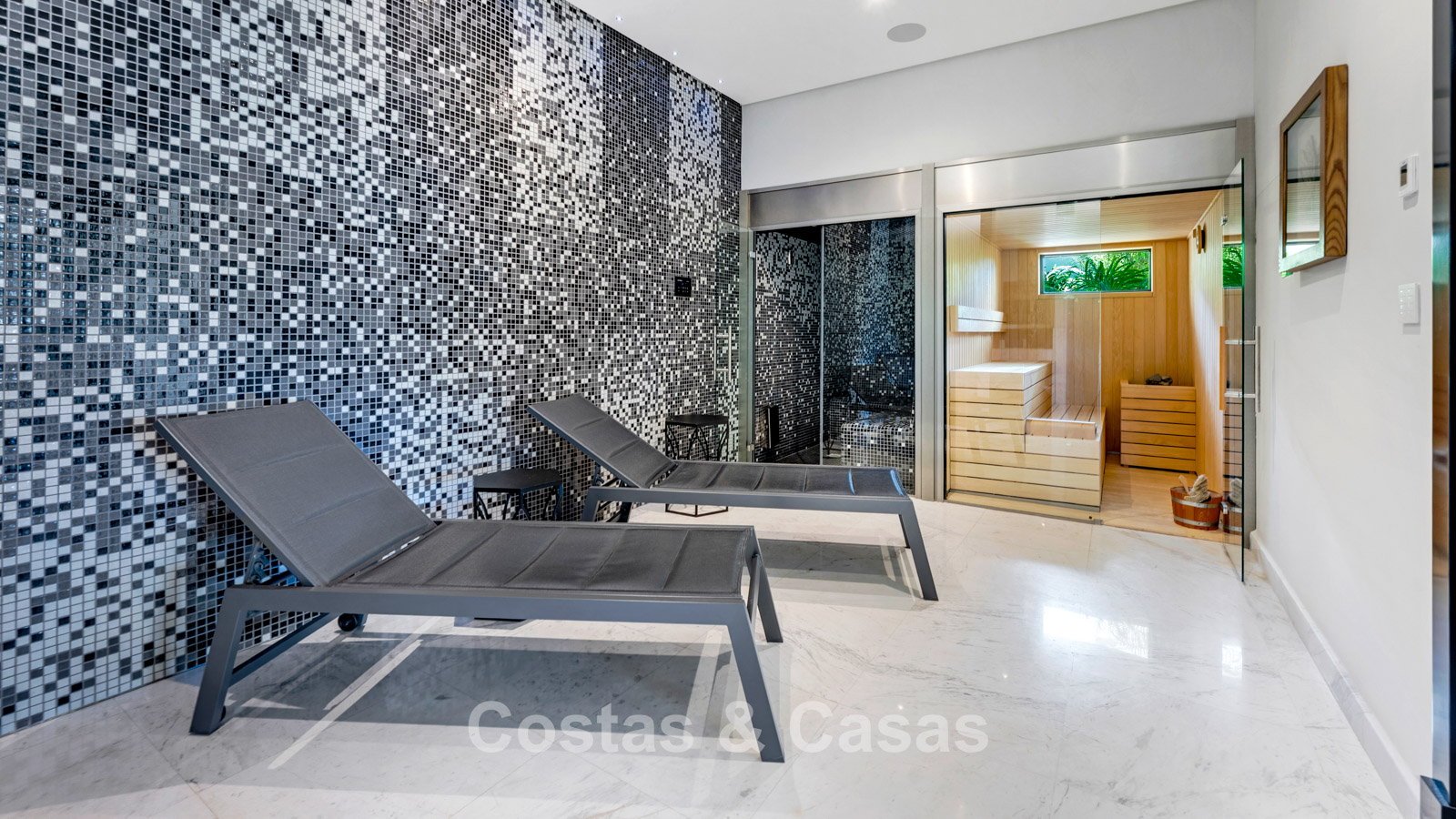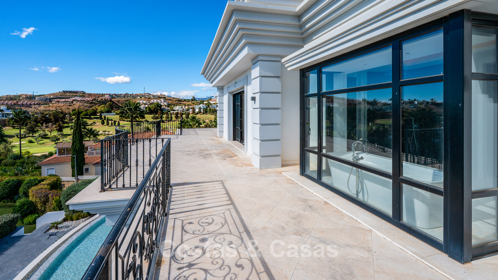 Cette majestueuse villa est en excellent état et combine élégance classique et luxe moderne. La propriété est répartie sur trois niveaux spacieux avec une architecture symétrique. Les meilleurs matériaux ont été utilisés, notamment du marbre raffiné et une menuiserie de grande qualité. La villa bénéficie d’une orientation sud idéale et offre des vues sur le parcours de golf, la vallée, les montagnes et la mer. L’intérieur dégage une impression de grandeur grâce à un spectaculaire hall d’entrée à double hauteur avec une verrière en forme de dôme. Espace de vie ouvert avec salon TV et salle à manger intégrée. Le vaste salon dispose d’un plan ouvert avec une cheminée classique comme point central. Cuisine indépendante entièrement équipée avec accès direct à la salle à manger et à la terrasse. La villa dispose de 5 chambres élégantes, chacune avec salle de bainsen suite et placards intégrés. Des toilettes invités sont situées au rez-de-chaussée. Le niveau inférieur est un véritable espace de détente avec un cinéma privé, une salle de sport entièrement équipée, un sauna, un hammam et une cave à vin exclusive. Appartement de service complet pour le personnel ou les invités. Grande pièce de rangement et buanderie séparée. Local technique. Garage intérieur pour 2 voitures. Stationnement supplémentaire sur la parcelle.